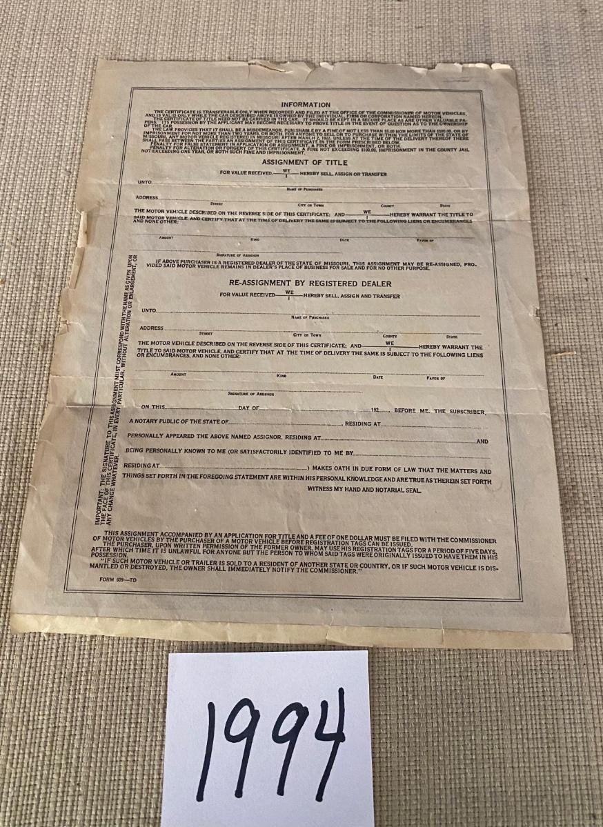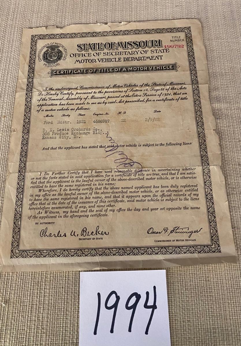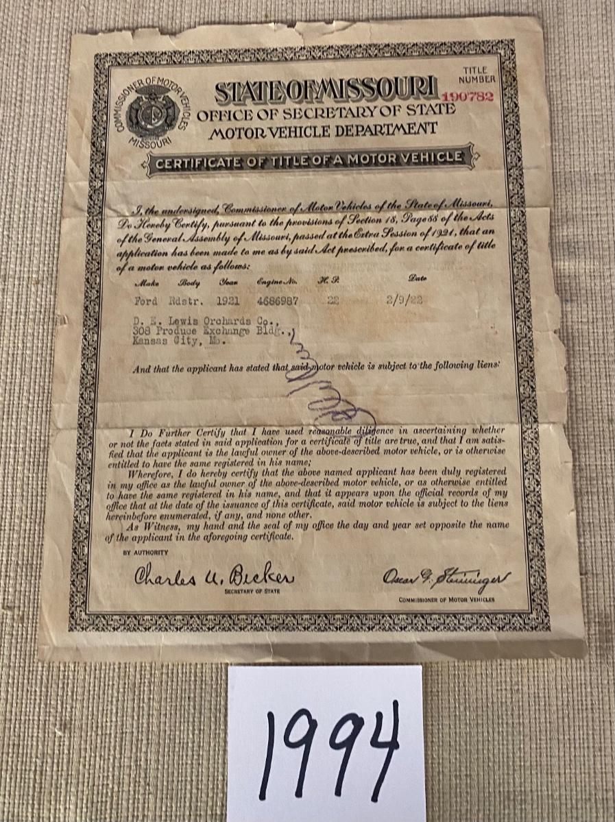 Title To 1921 Ford Roadster