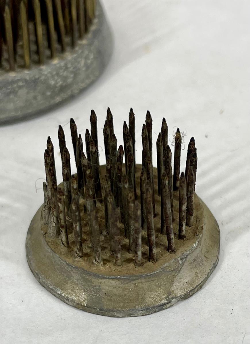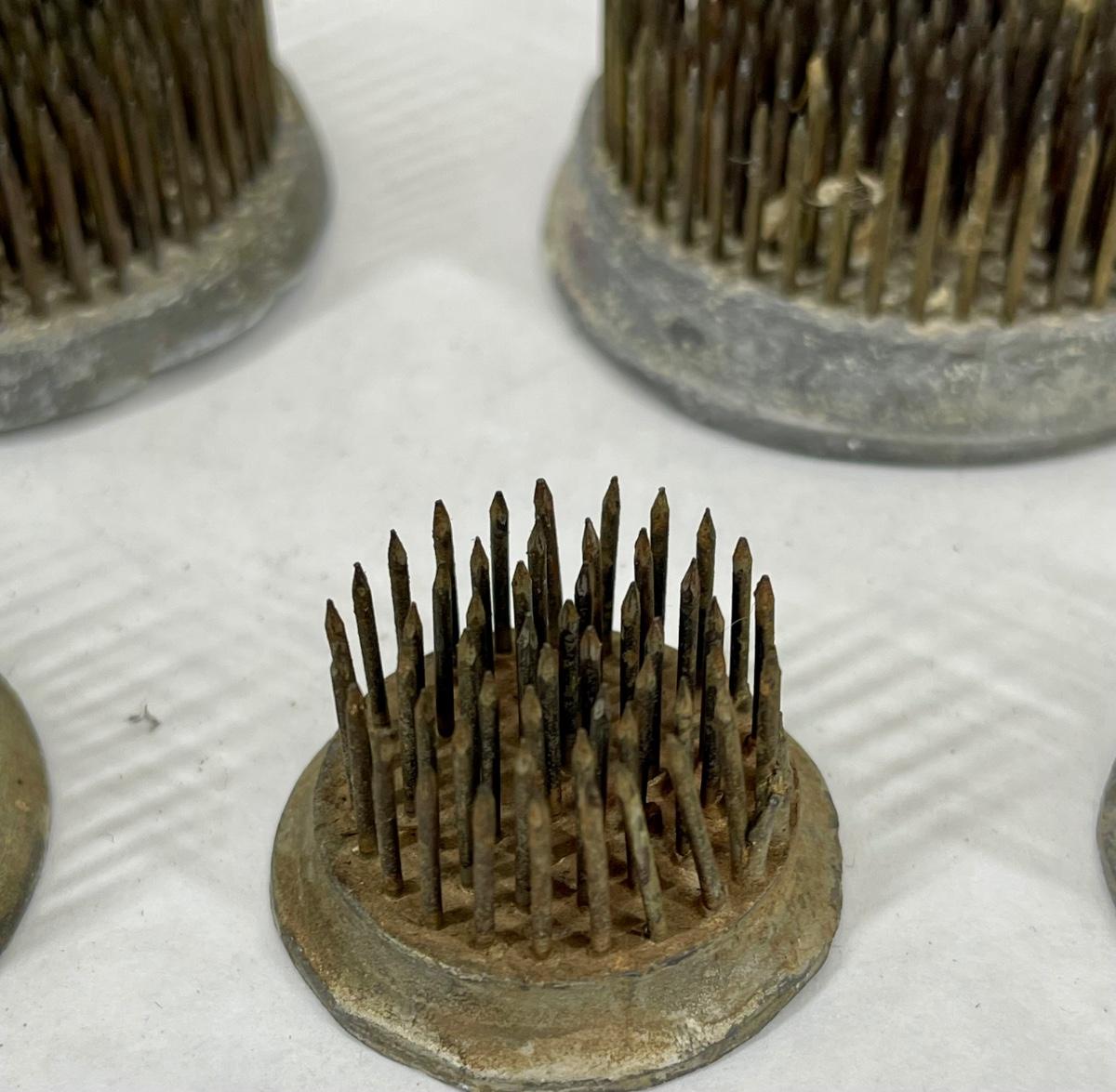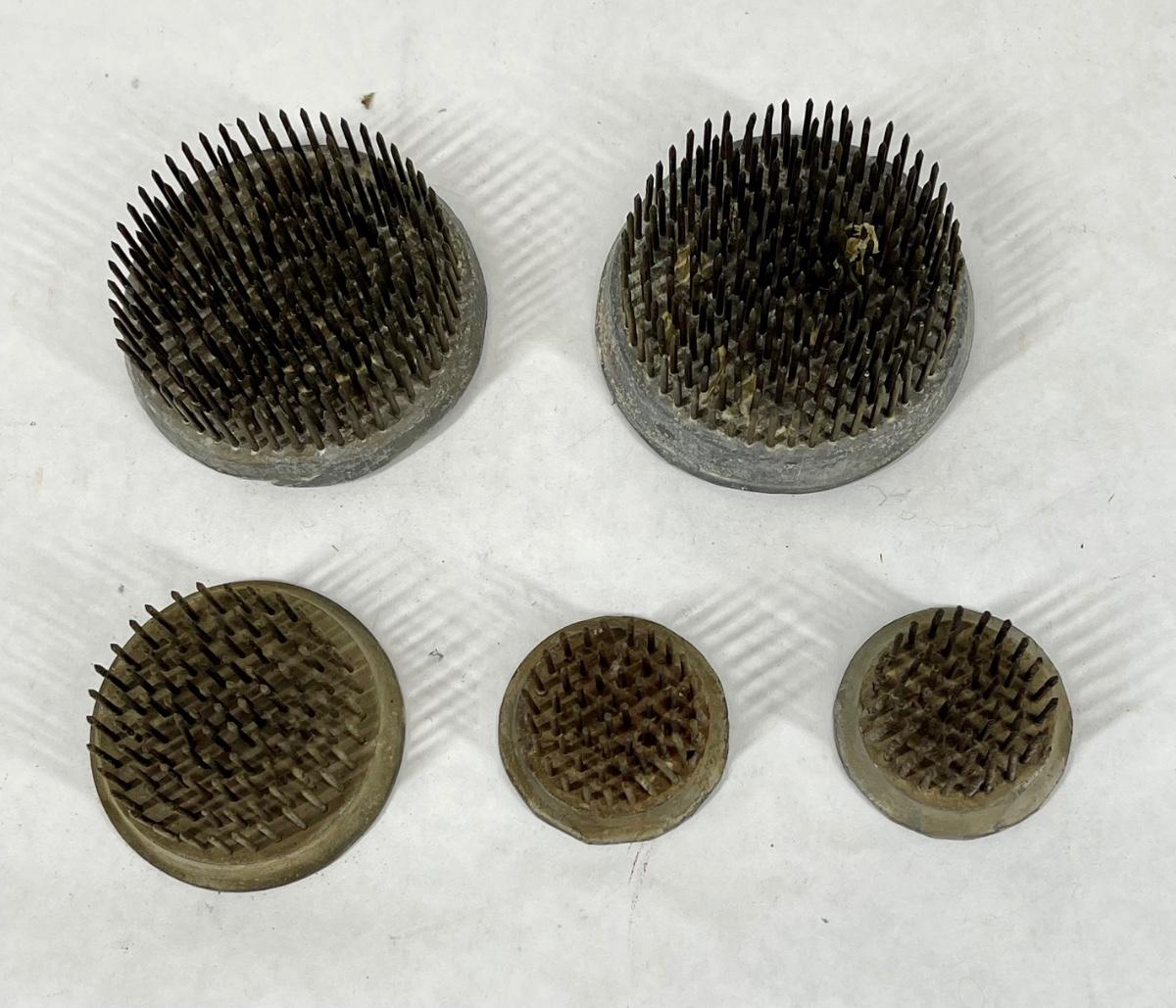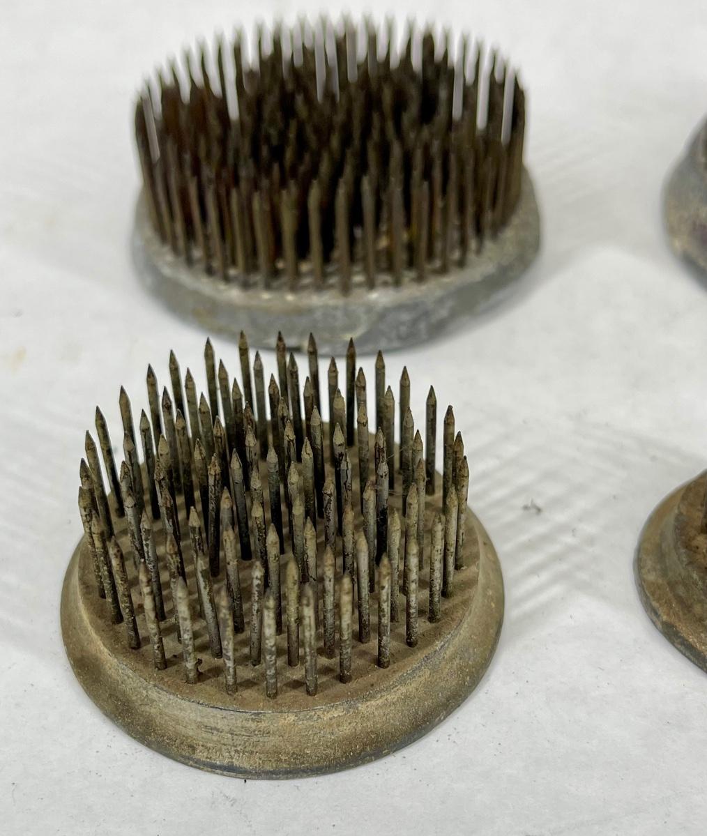 5 Metal Spike Vintage Flower Frogs, 2 signed