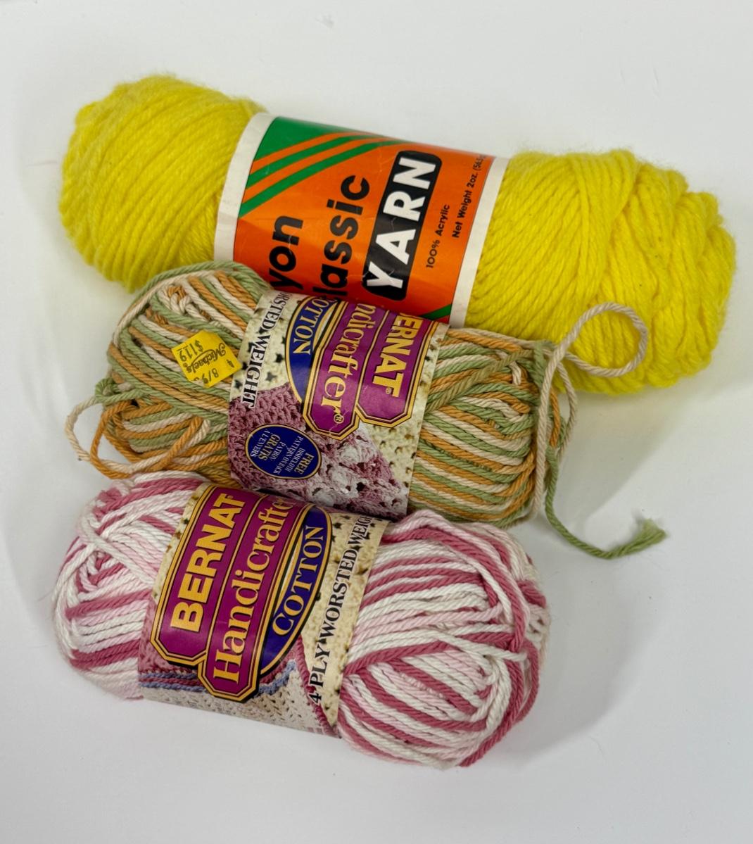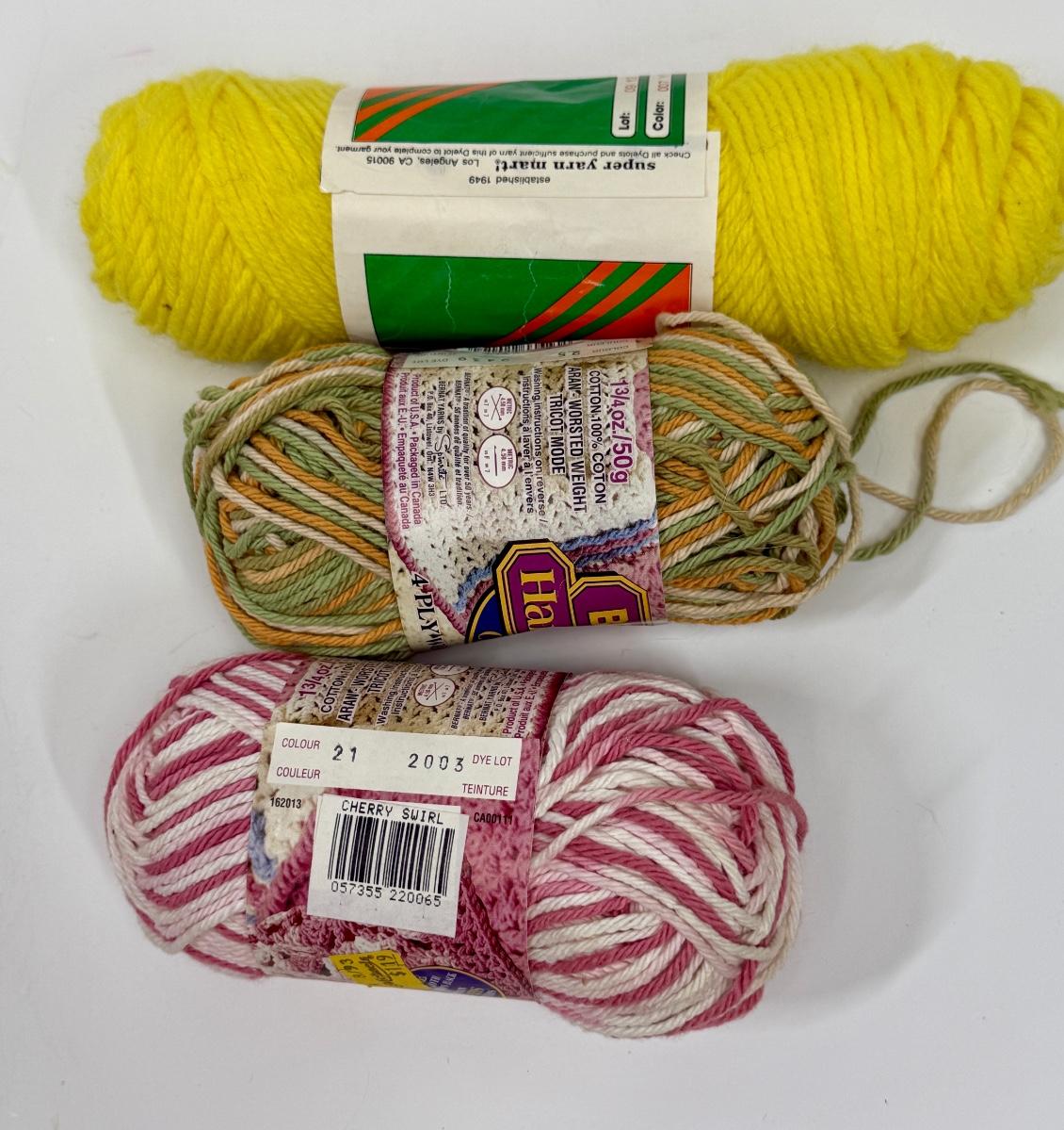 3 skeins of yarn: Yellow, Cherry Swirl, and Muliticolor. In original banded packaging.