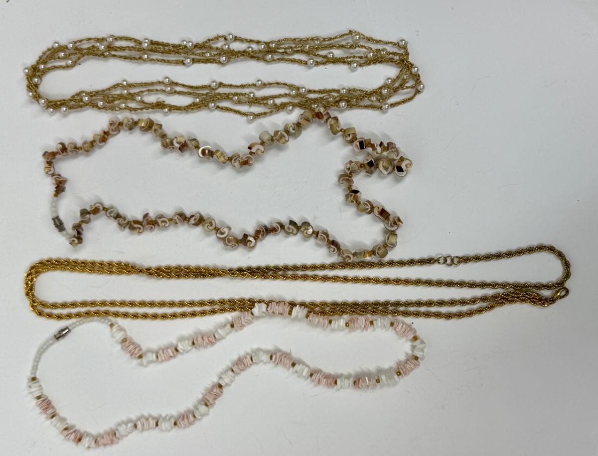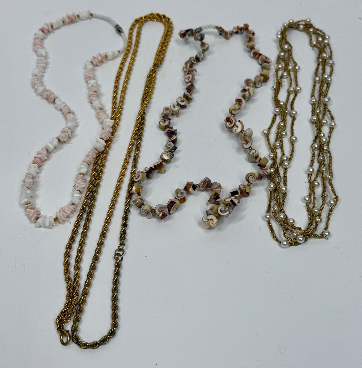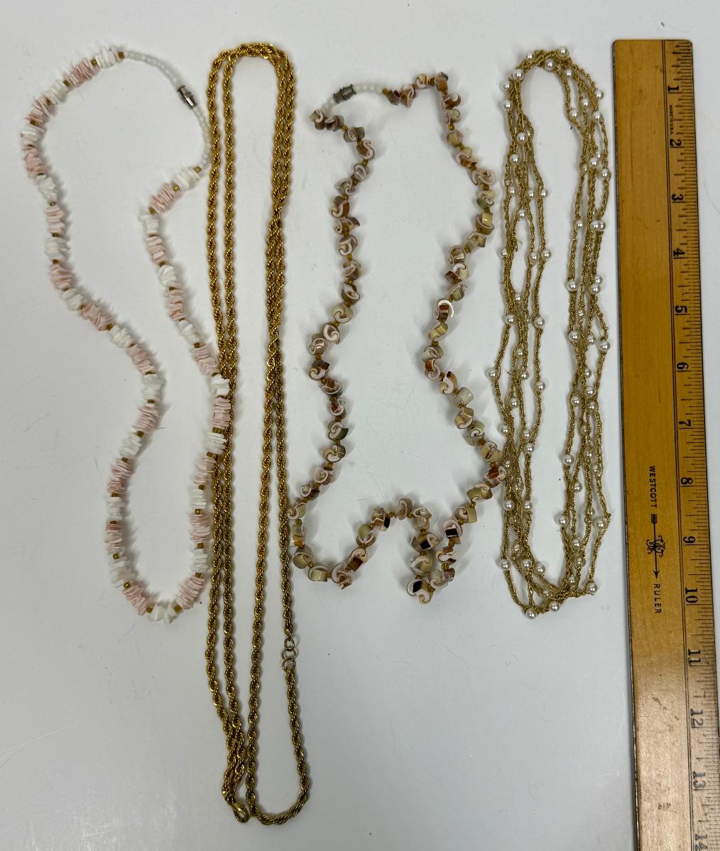 4 different lengths and types: pink and white puka shell/stone choker, long gold-tone chain, beaded multi-strand choker, and swirl-beaded necklace. All in good condition.