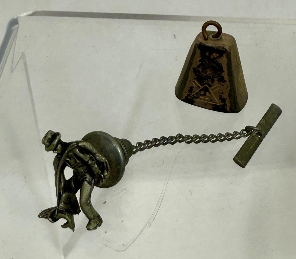 Small bell could be a silver alloy, maybe it's a cat bell. Fisherman Tie Tack is Sterling Silver, total weight of tack plus backing is 2.9g. NRA Minutemen tie tack is silver tone metal.
