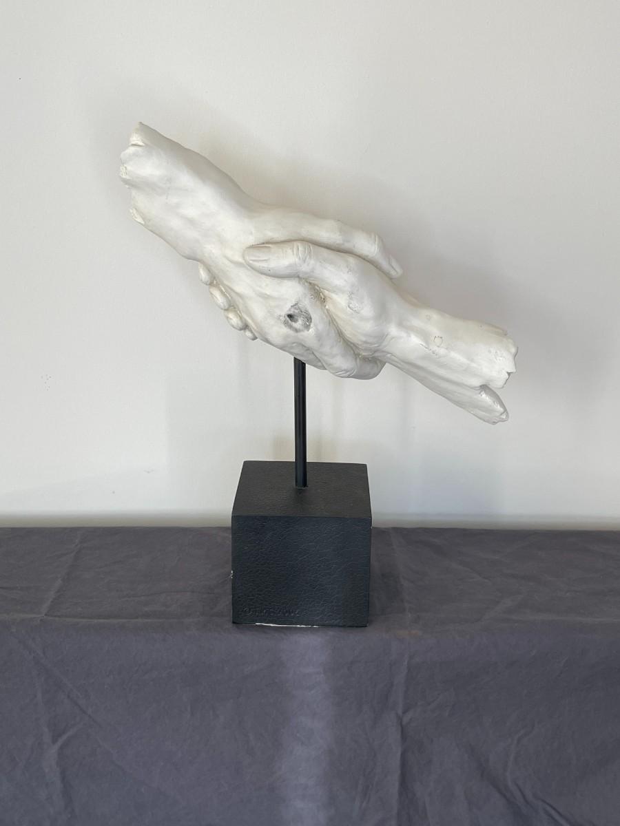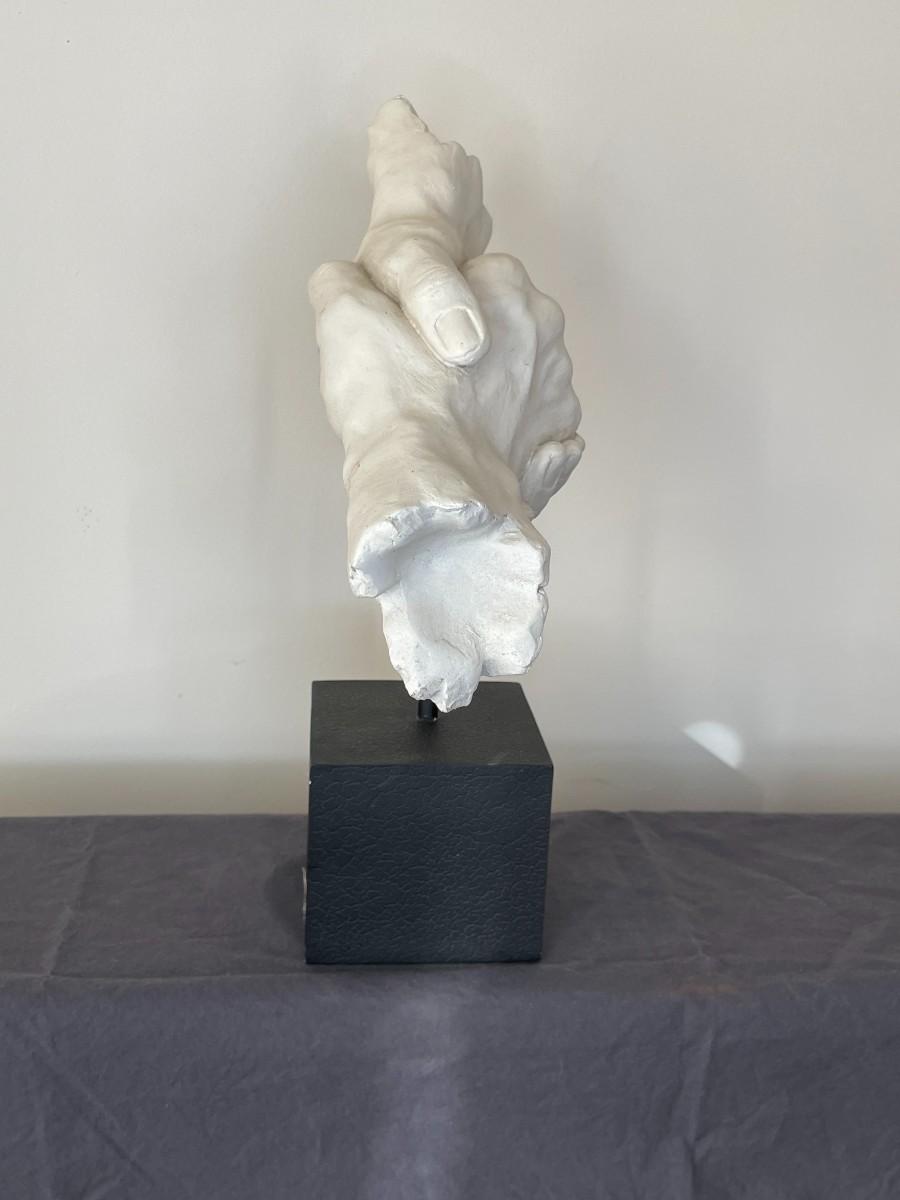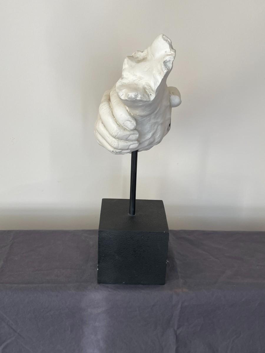 White hands wooden sculpture on stand. 12.5"H x 11" L x 3.5"W