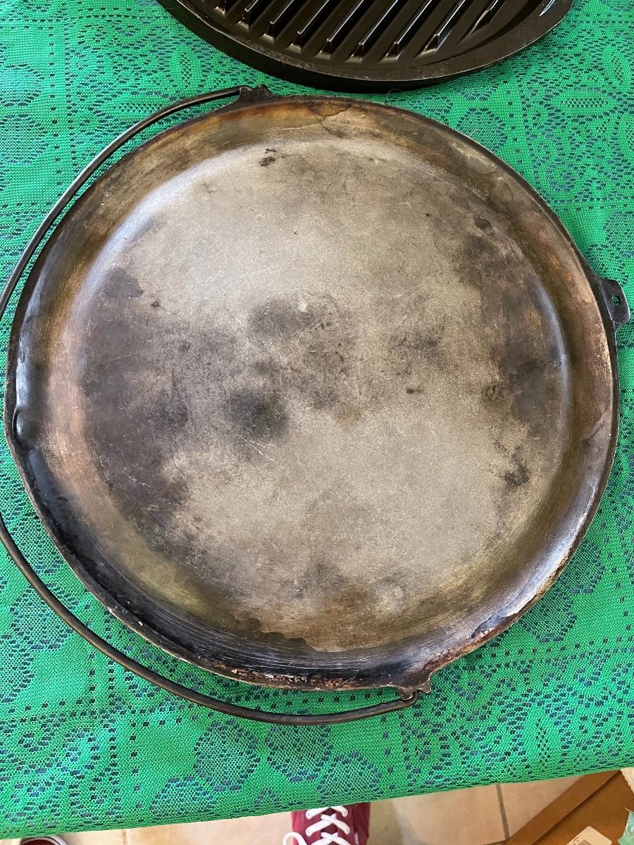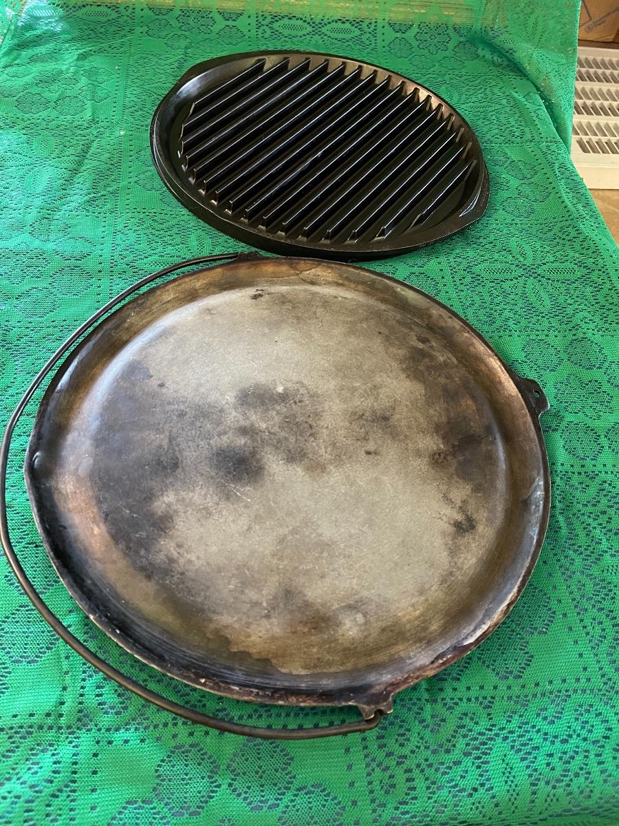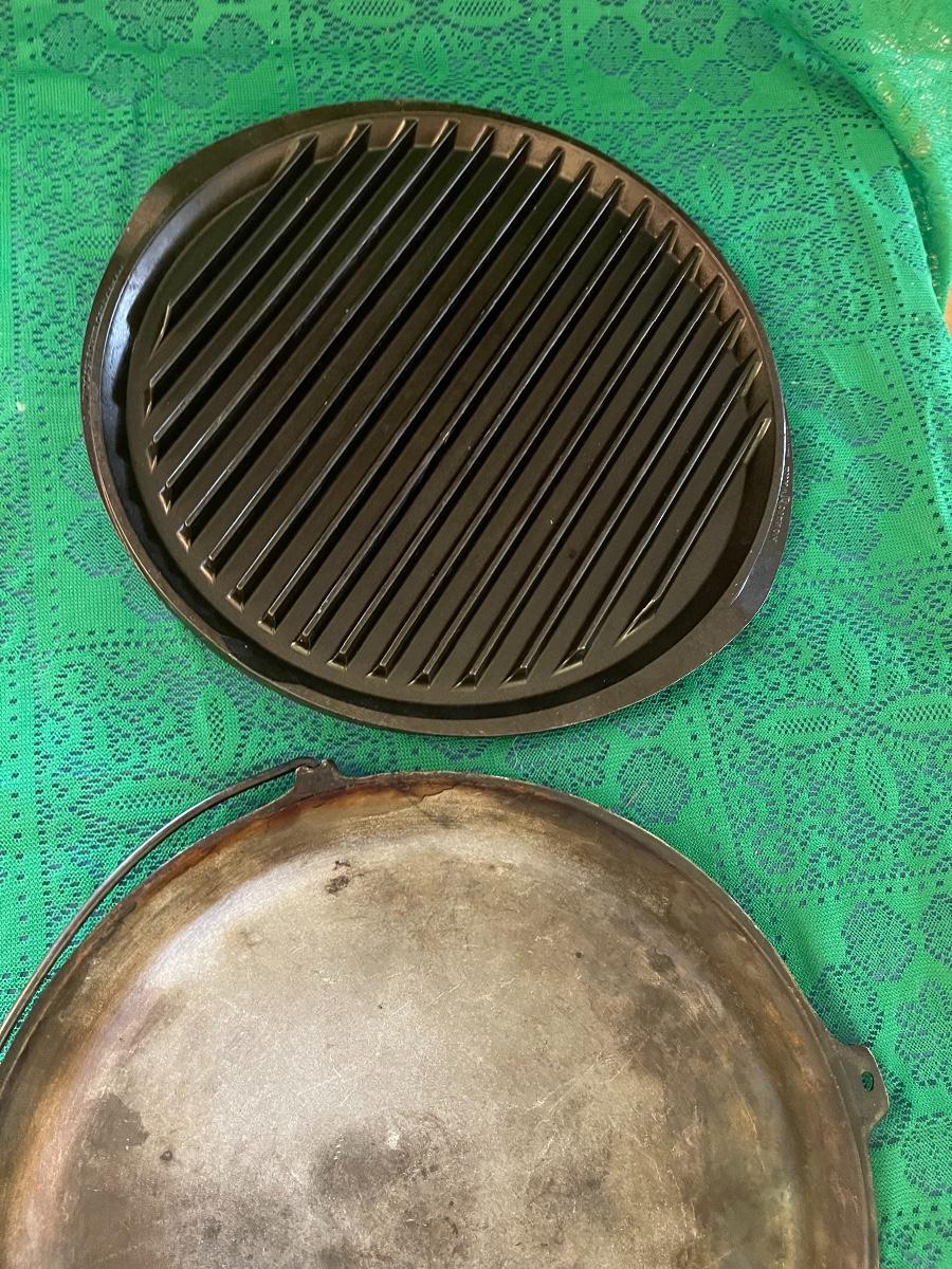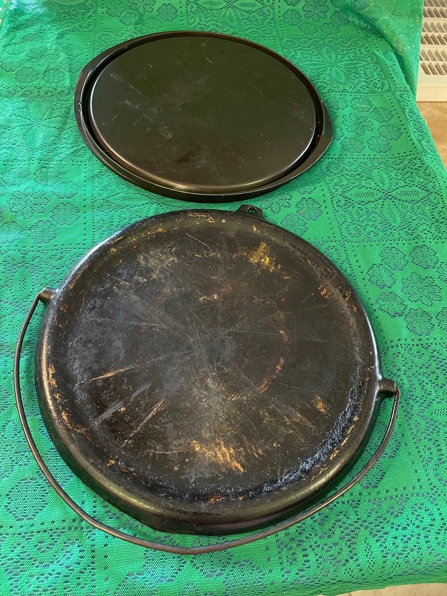 These cast iron pans were found together but I do not think they go together. No markings. Approximately 13 inches diameter. Lot j