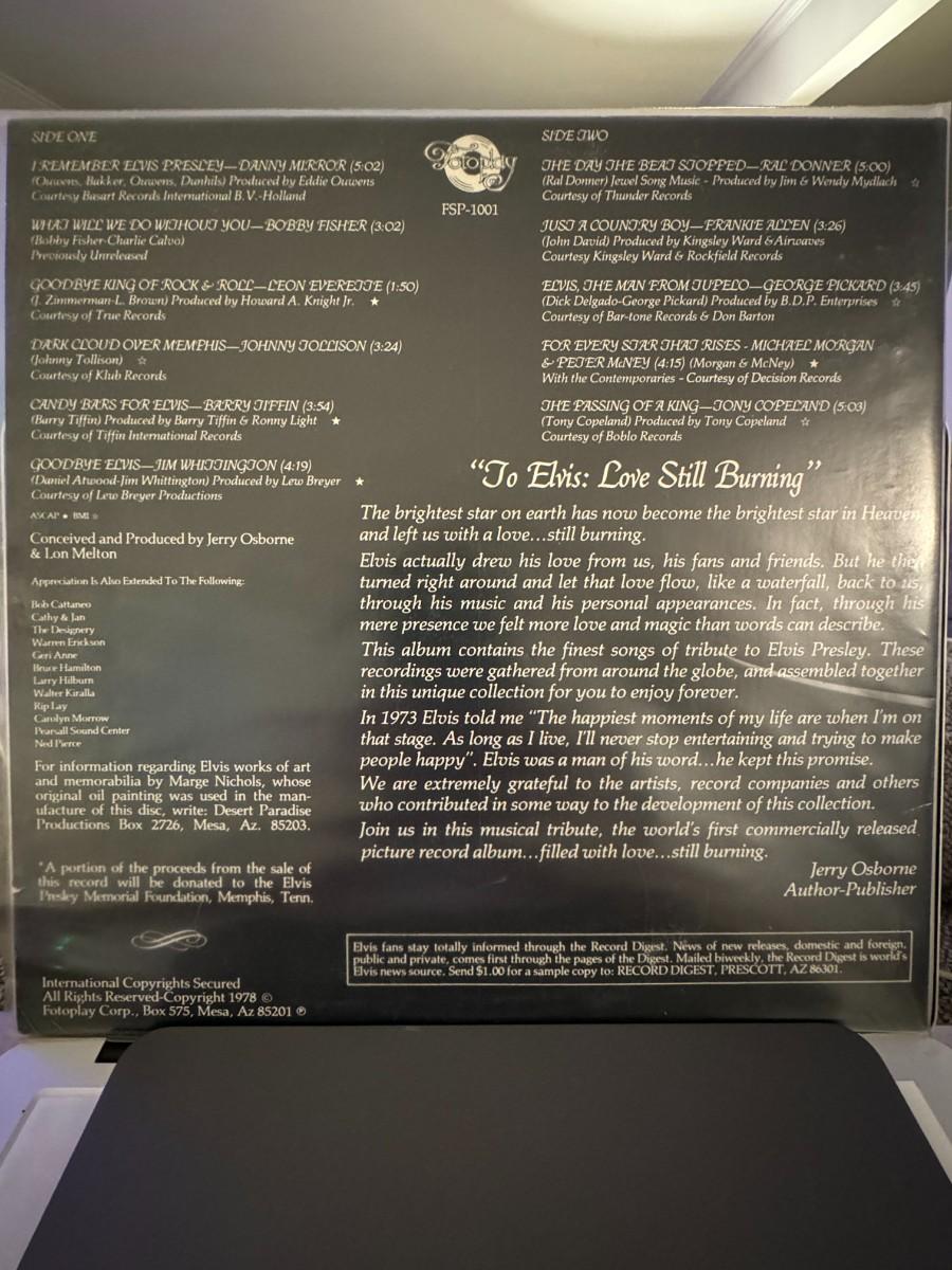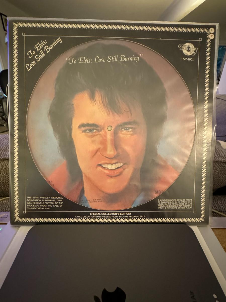 The "To Elvis: Love Still Burning" LP picture disc is a vinyl record released in 1978 as a tribute to Elvis Presley.