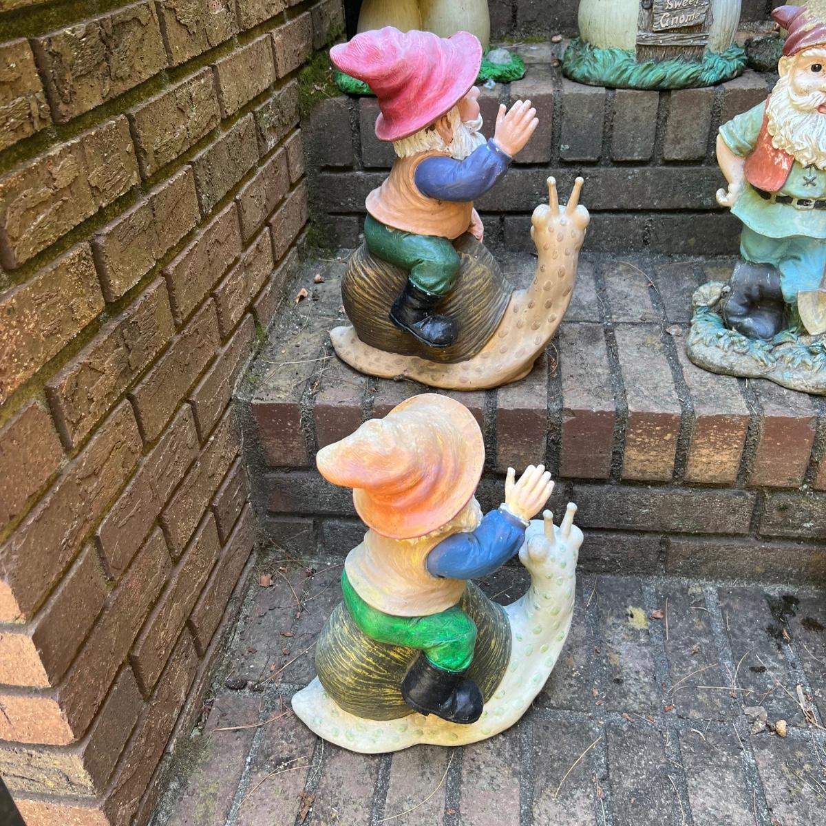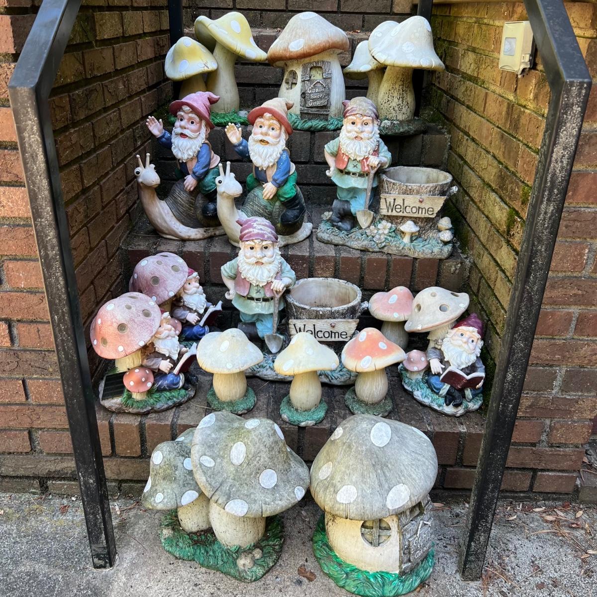 Approximately 15 gnomes with toadstools statues includes planters that say Welcome and measure 15” x 9” x 16”H. Any with solar panels have not been tested. They have some wear from outdoor use.