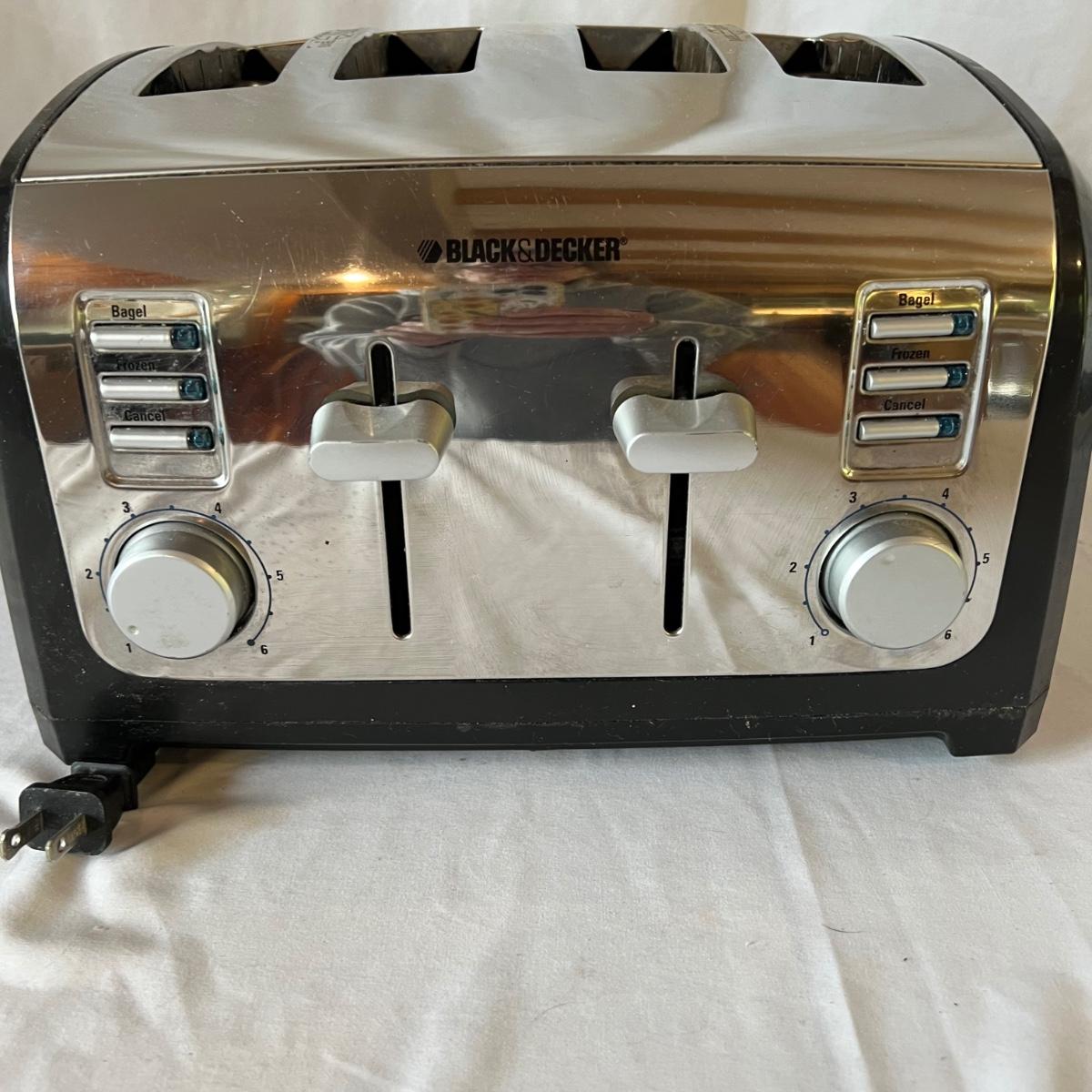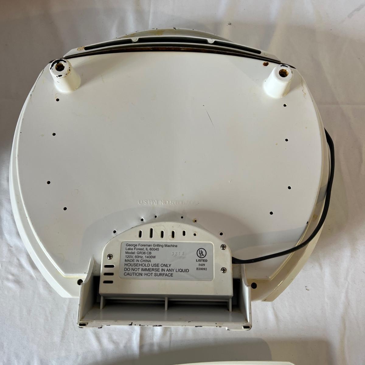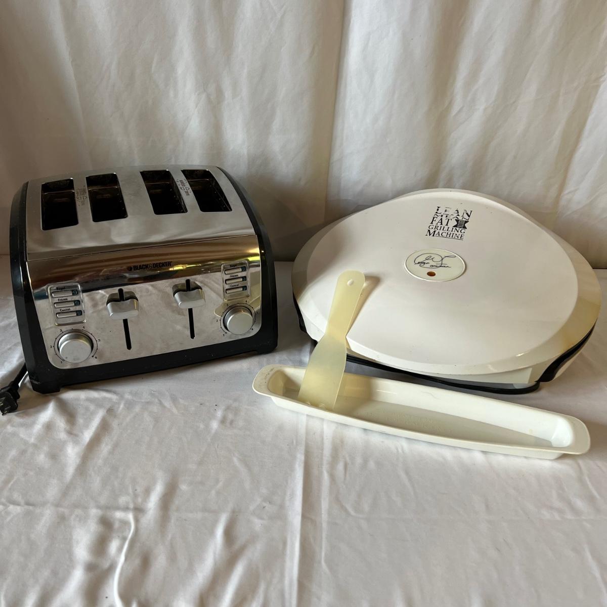 Black and Decker 4 slice toaster and Model GR36 CB George Foreman Grill. The toaster measures 12” x 10.5” x 8” H and the grill measures 16”x 12” x “ 6” H. Both items powered on when plugged in.