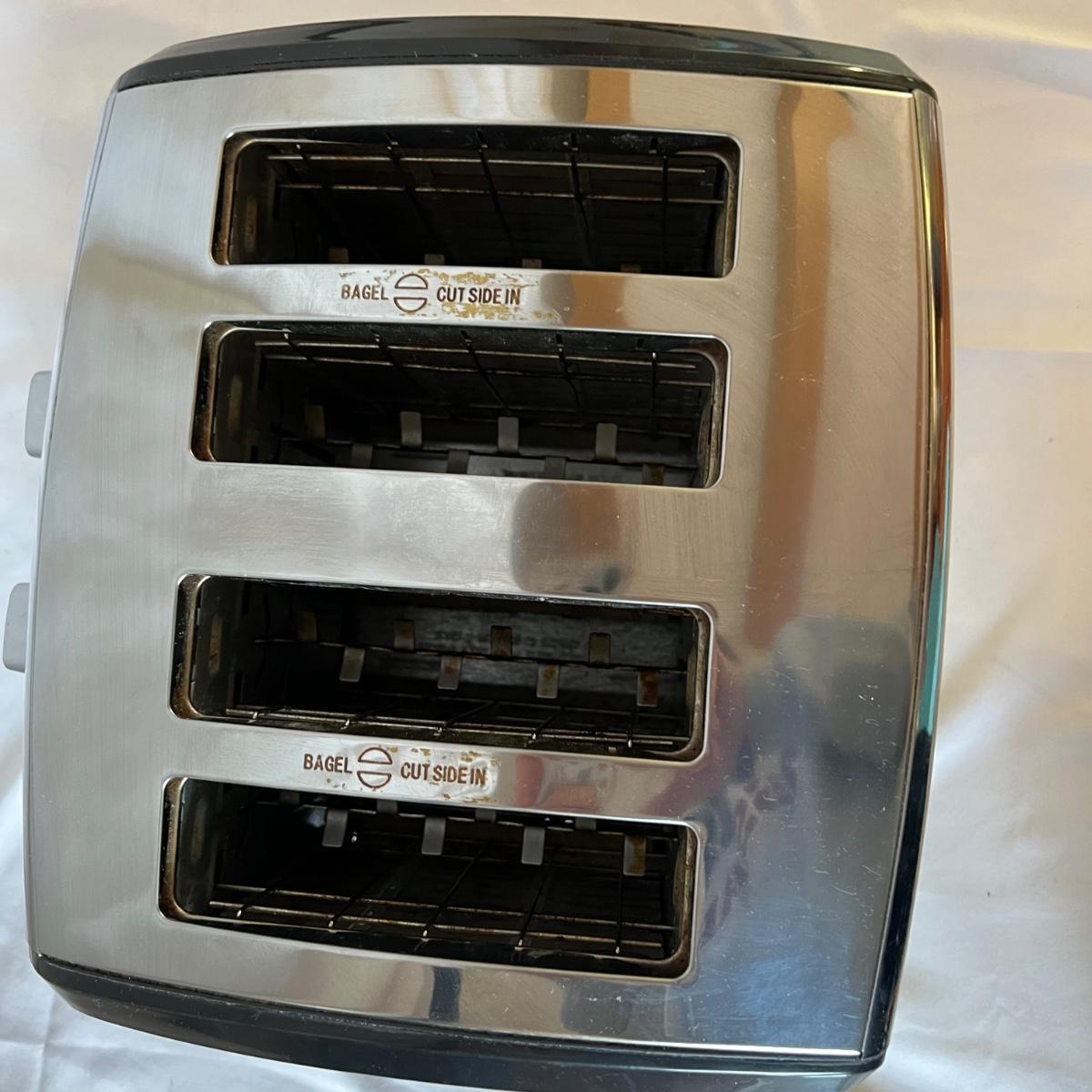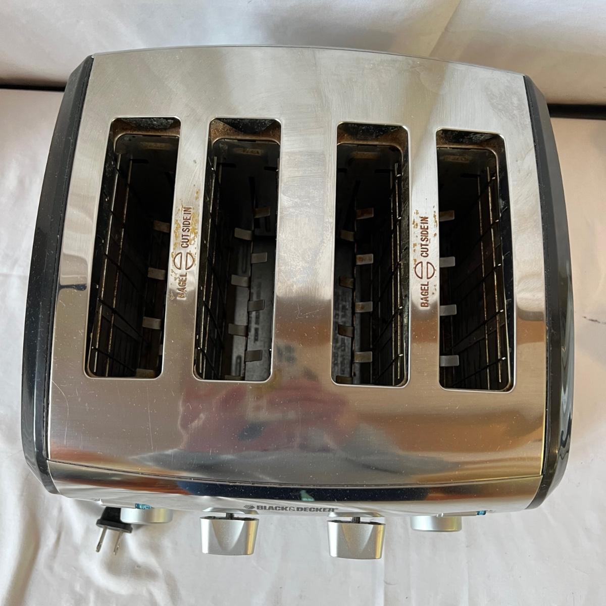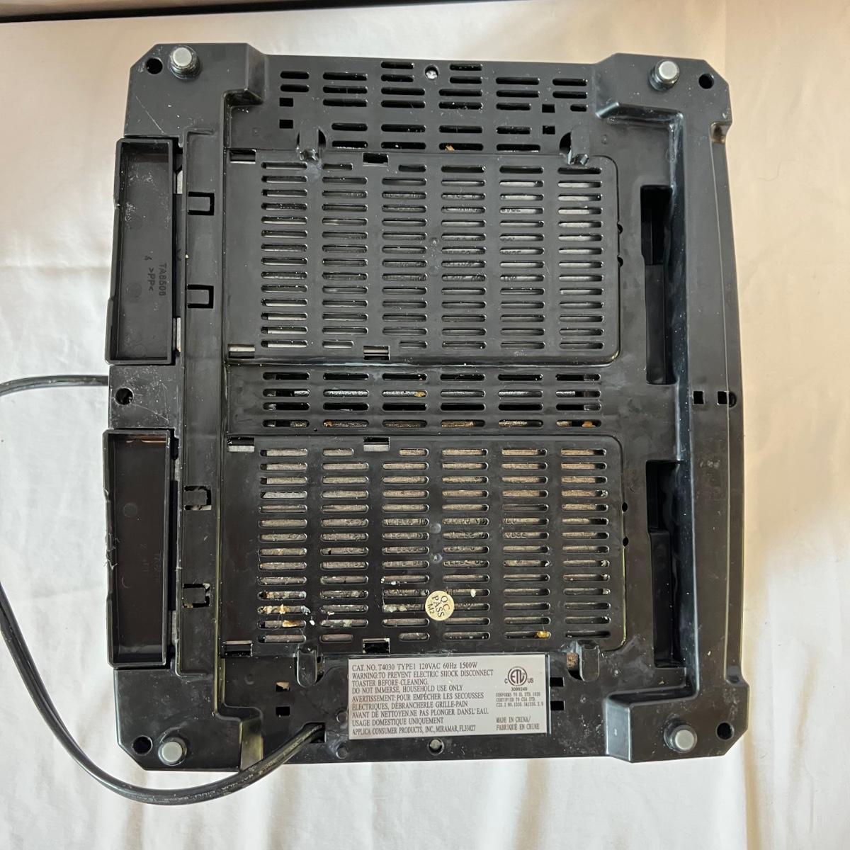Black and Decker 4 slice toaster and Model GR36 CB George Foreman Grill. The toaster measures 12” x 10.5” x 8” H and the grill measures 16”x 12” x “ 6” H. Both items powered on when plugged in.