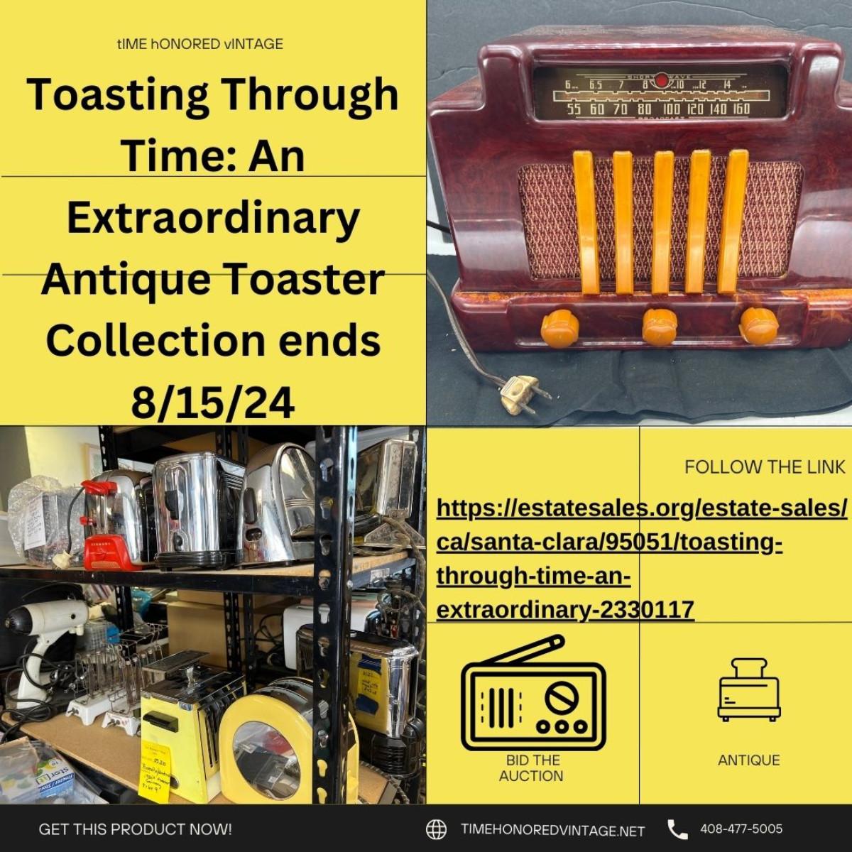 Auction of antique toasters August 1, 2024- August 15th , 2024. Located in Santa Clara Ca. Pick up locally or shipped worldwide. Do not bid here this is the placeholder image. Keep scrolling to see the many lots in the auction
