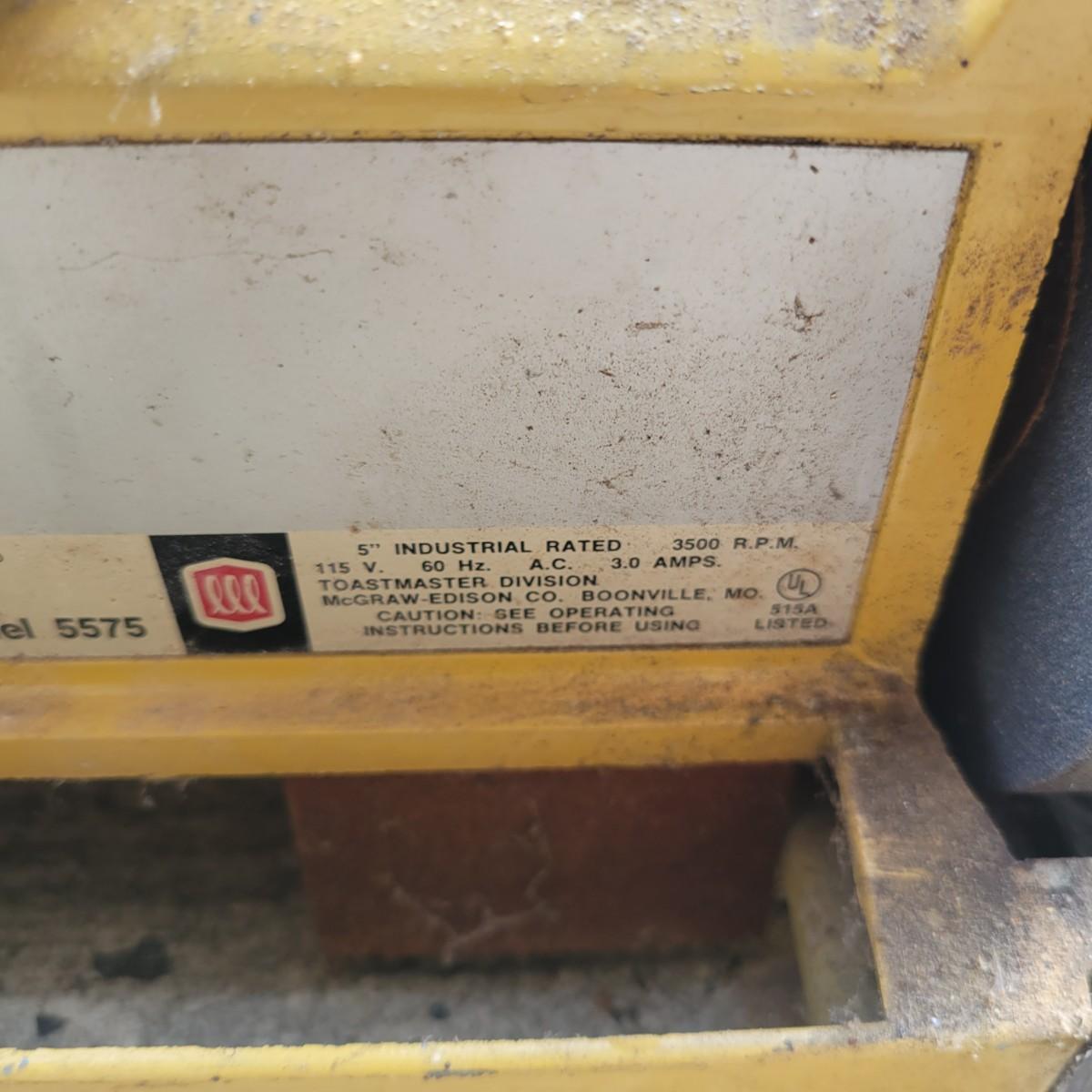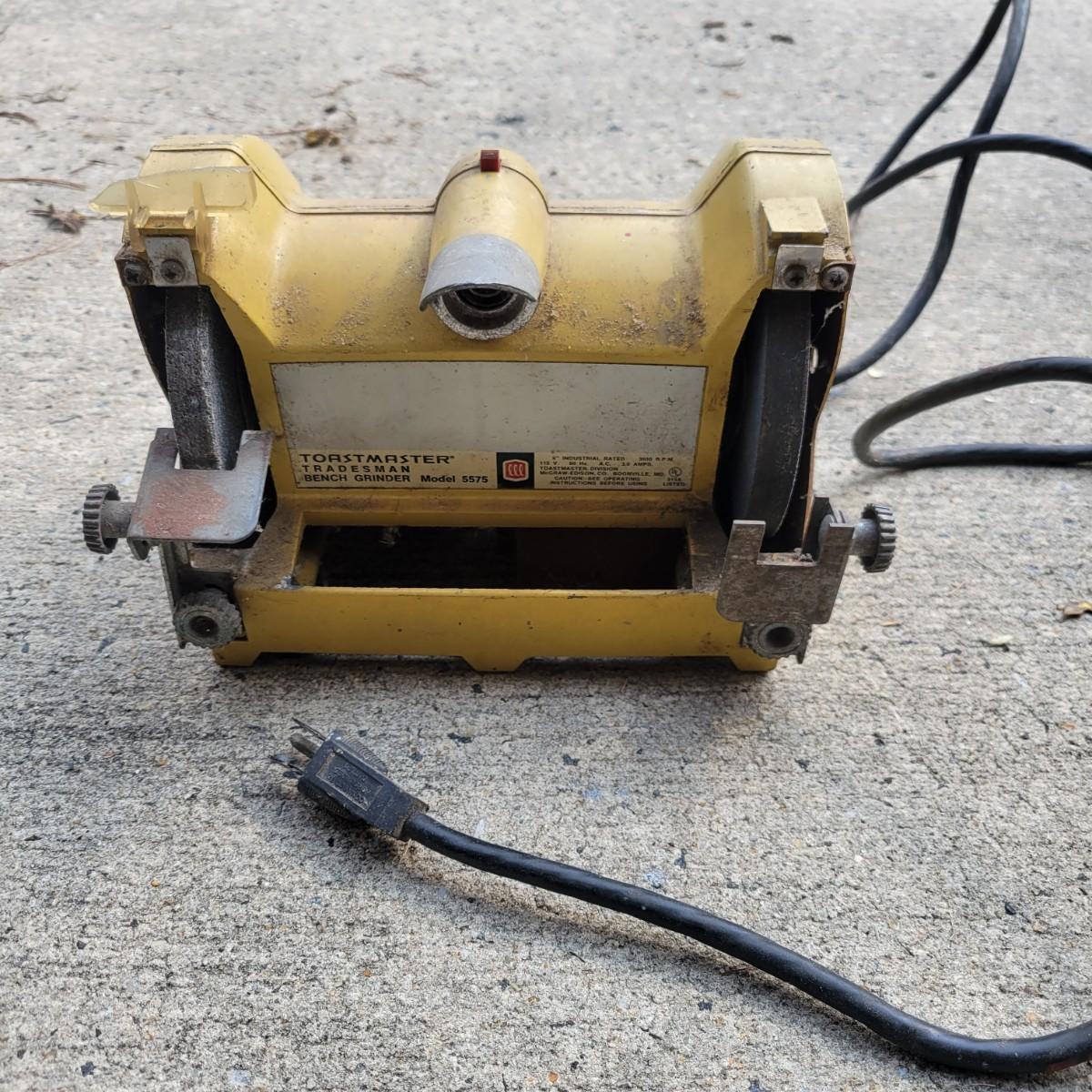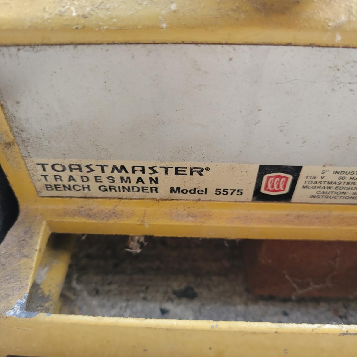 A Toastmaster tradesman 5" industrial rated bench grinder that powered on when plugged in. It is a 3 amp, 3500 rpm grinder that measures approximately 10" x 6.5" x 6.5"H. Local pickup only
