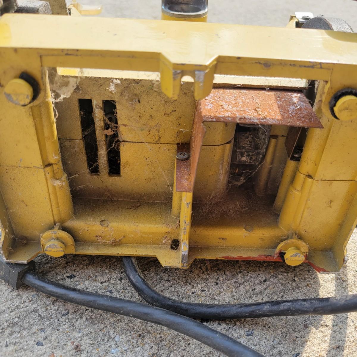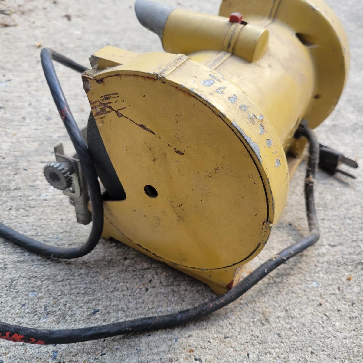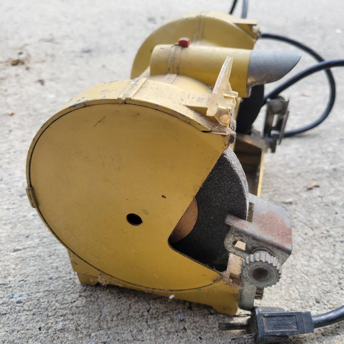 A Toastmaster tradesman 5" industrial rated bench grinder that powered on when plugged in. It is a 3 amp, 3500 rpm grinder that measures approximately 10" x 6.5" x 6.5"H. Local pickup only