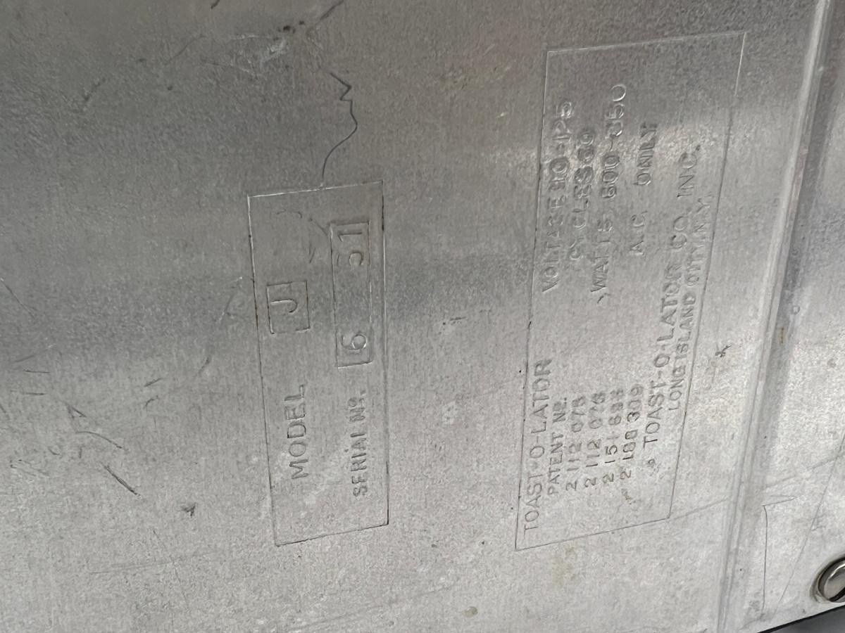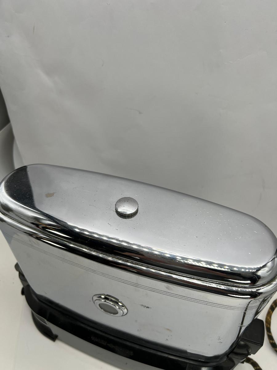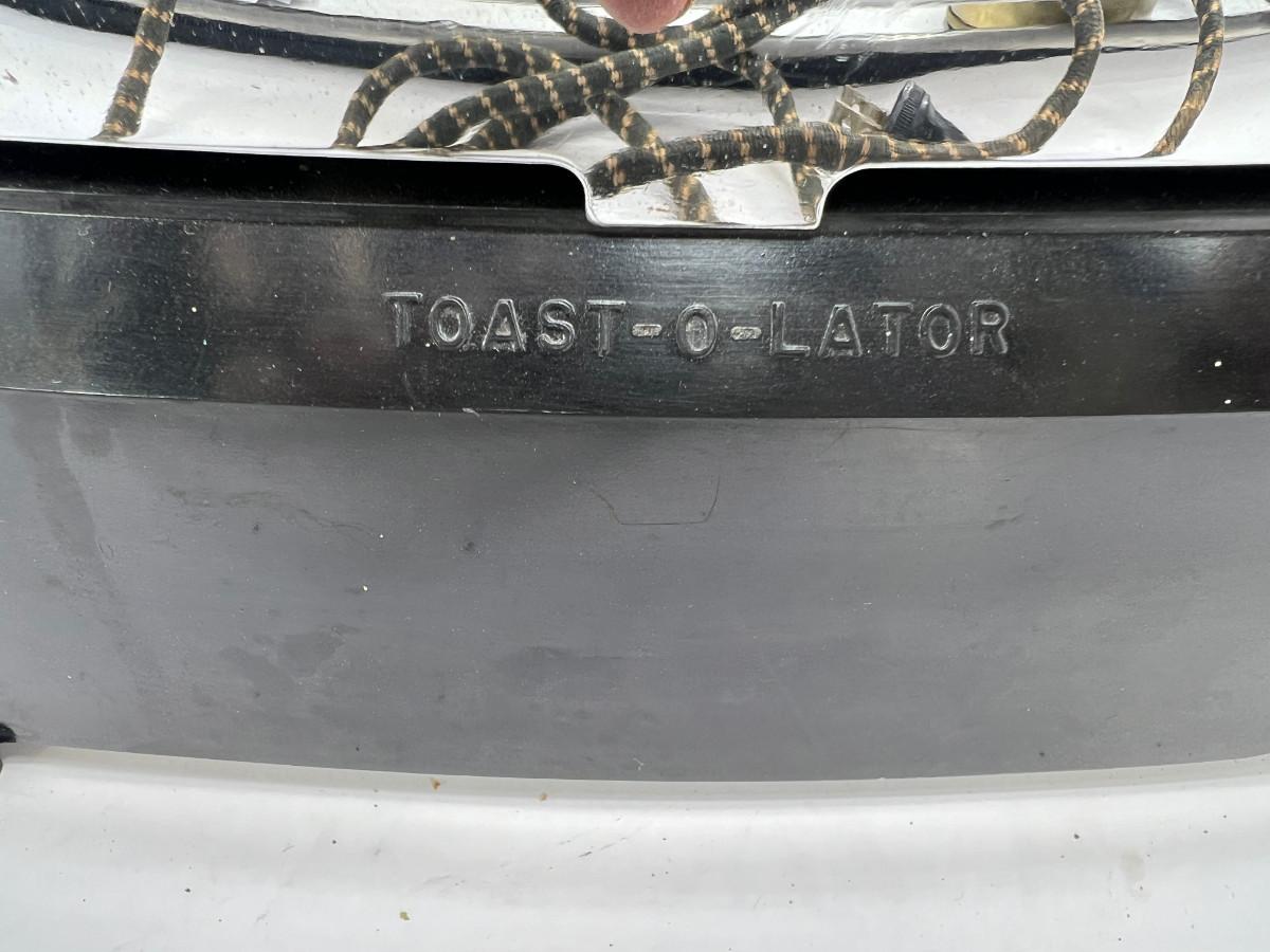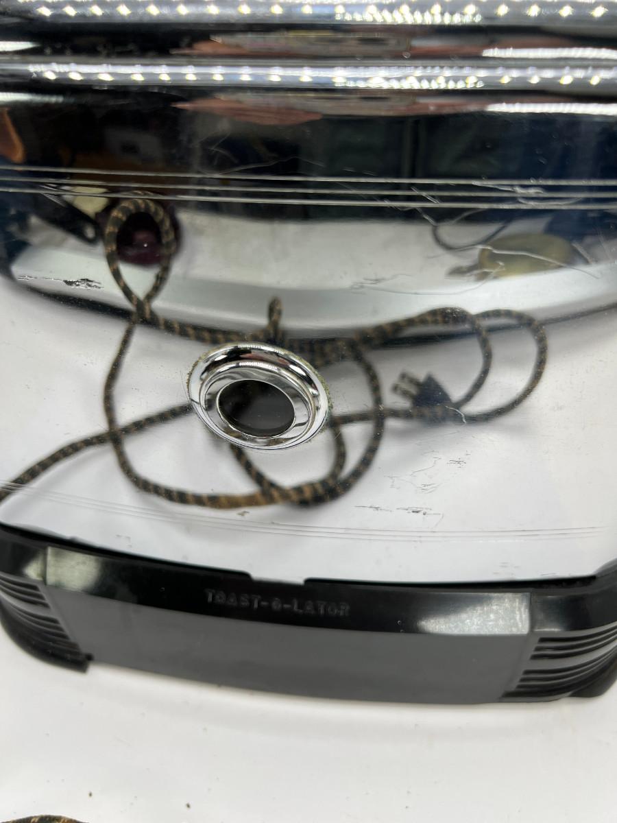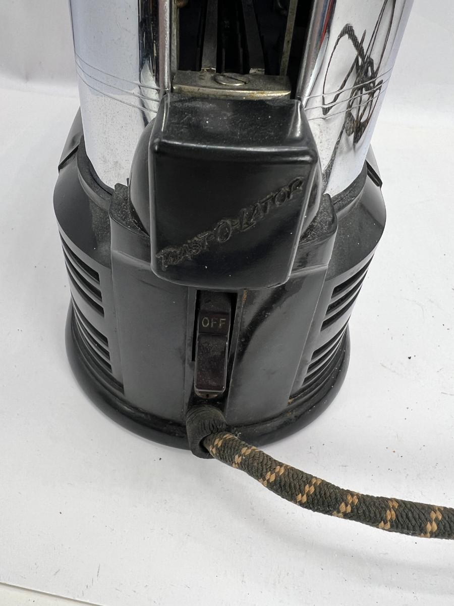 1940s Vintage 8-39 Toast-O-Lator Model J, toaster "walks" the bread through as it browns! This vintage stainless steel and black Bakelite toaster is a great addition to your Mid-Century kitchen. The bread is put into one side, the darkness/lightness is set, and then it's switched on. The toast runs on conveyor belt-type metal fingers, and as the bread browns, it's moved across and out of the other side of the Toast-O-Lator. Underneath it's stamped Toast-o-later Co., Long Island City NY. .This is shiny bright Chrome with no cracks or chips in the black Bakelite, but there are two small areas on either side where there is finish damage, Unit is being sold as a "non-working" vintage electronic device that should be gone over by a qualified technician prior to use.