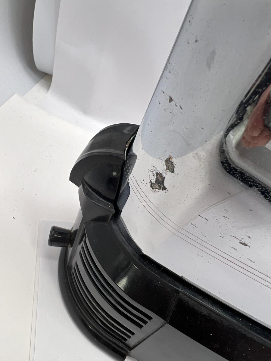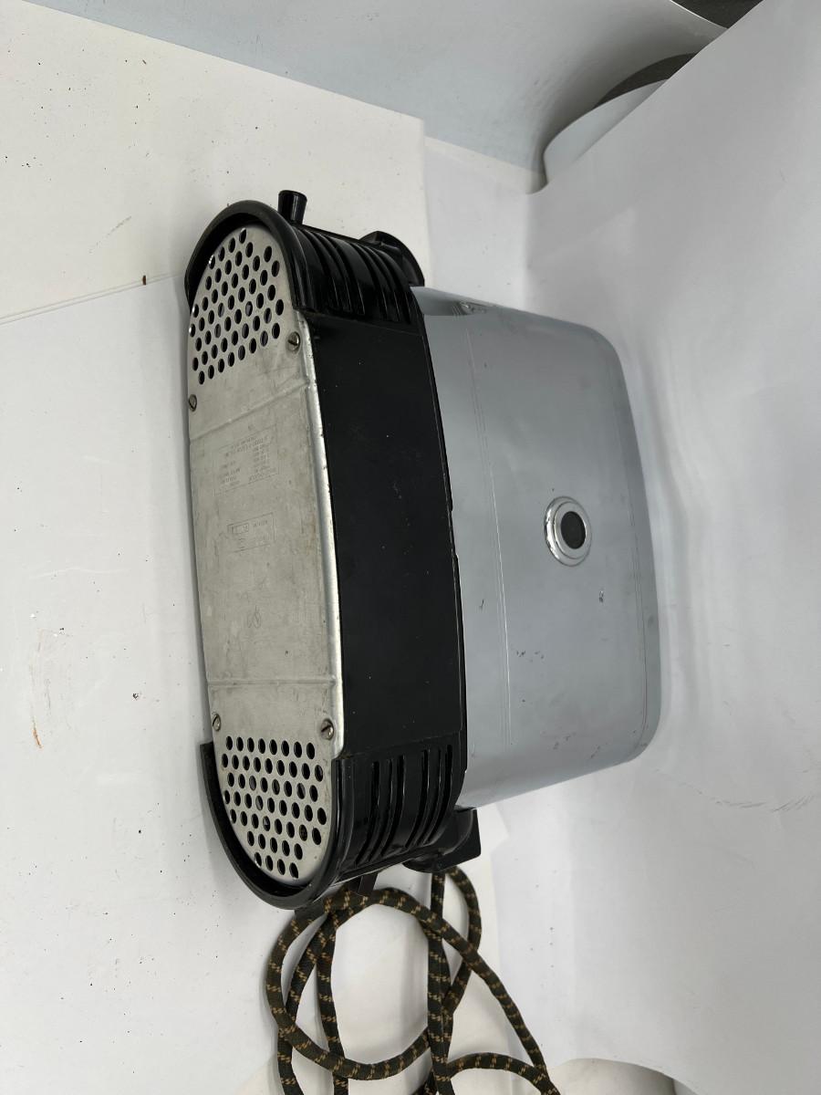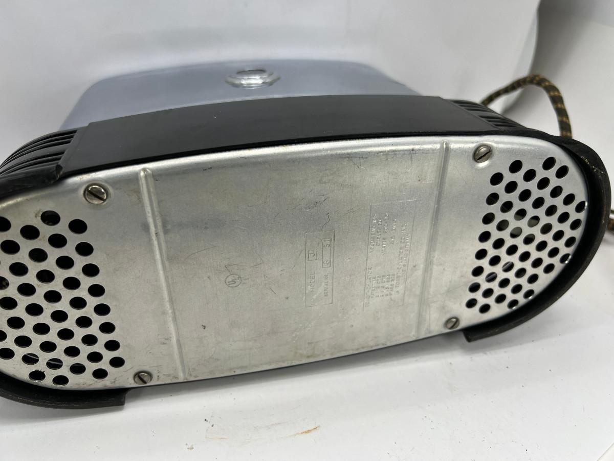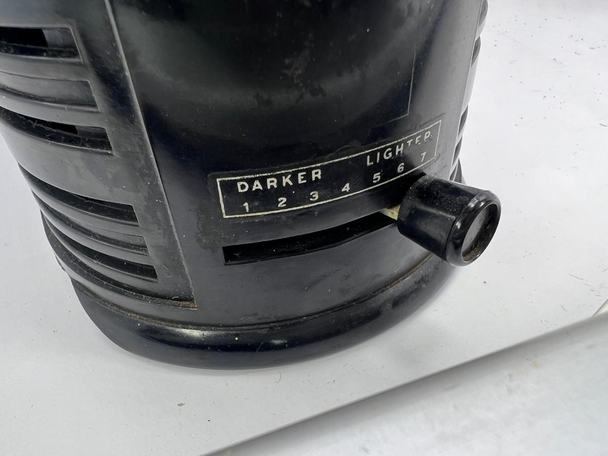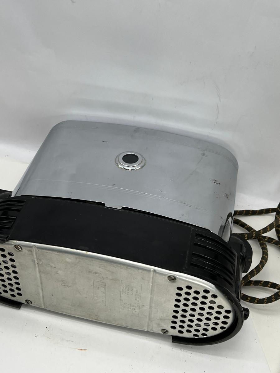 1940s Vintage 8-39 Toast-O-Lator Model J, toaster "walks" the bread through as it browns! This vintage stainless steel and black Bakelite toaster is a great addition to your Mid-Century kitchen. The bread is put into one side, the darkness/lightness is set, and then it's switched on. The toast runs on conveyor belt-type metal fingers, and as the bread browns, it's moved across and out of the other side of the Toast-O-Lator. Underneath it's stamped Toast-o-later Co., Long Island City NY. .This is shiny bright Chrome with no cracks or chips in the black Bakelite, but there are two small areas on either side where there is finish damage, Unit is being sold as a "non-working" vintage electronic device that should be gone over by a qualified technician prior to use.