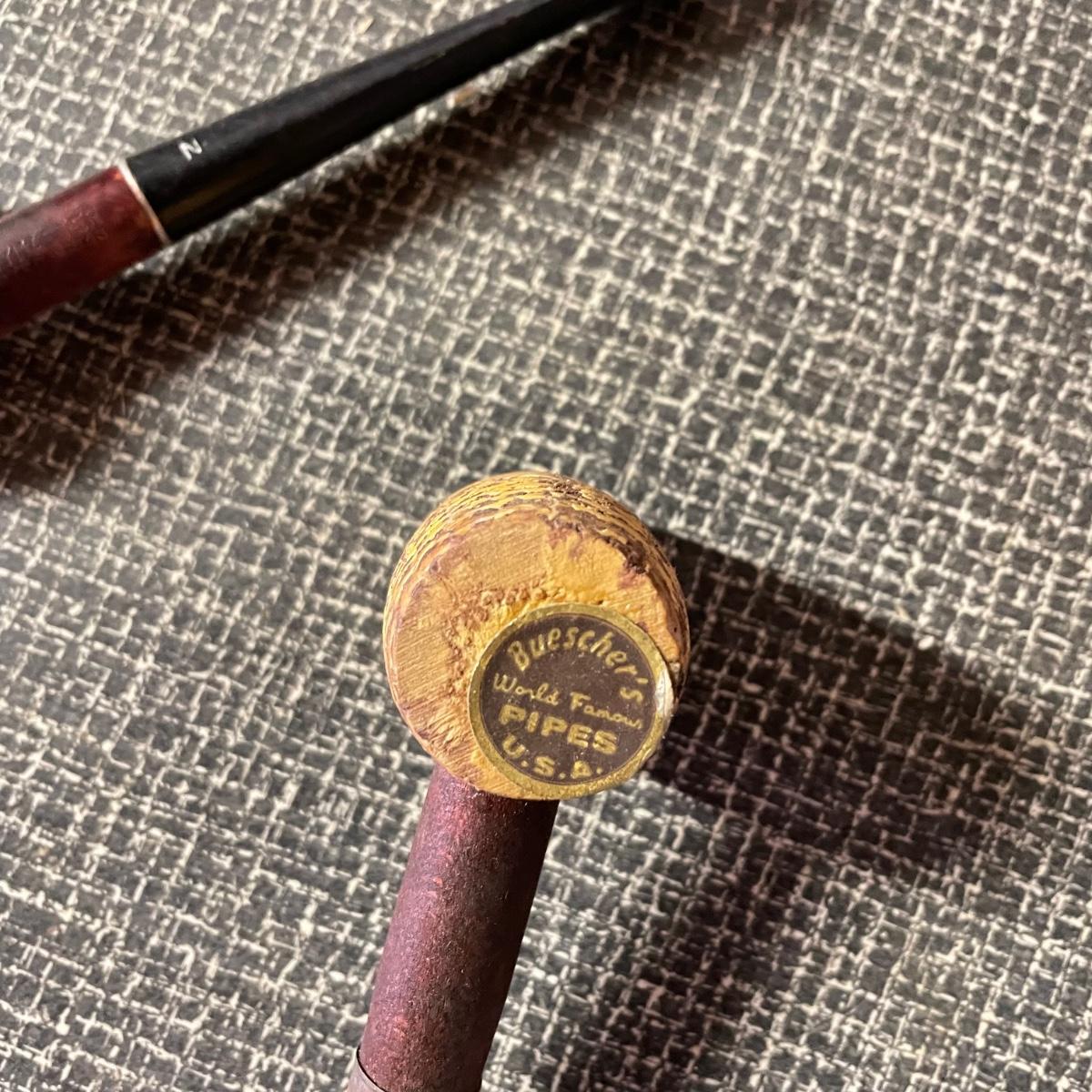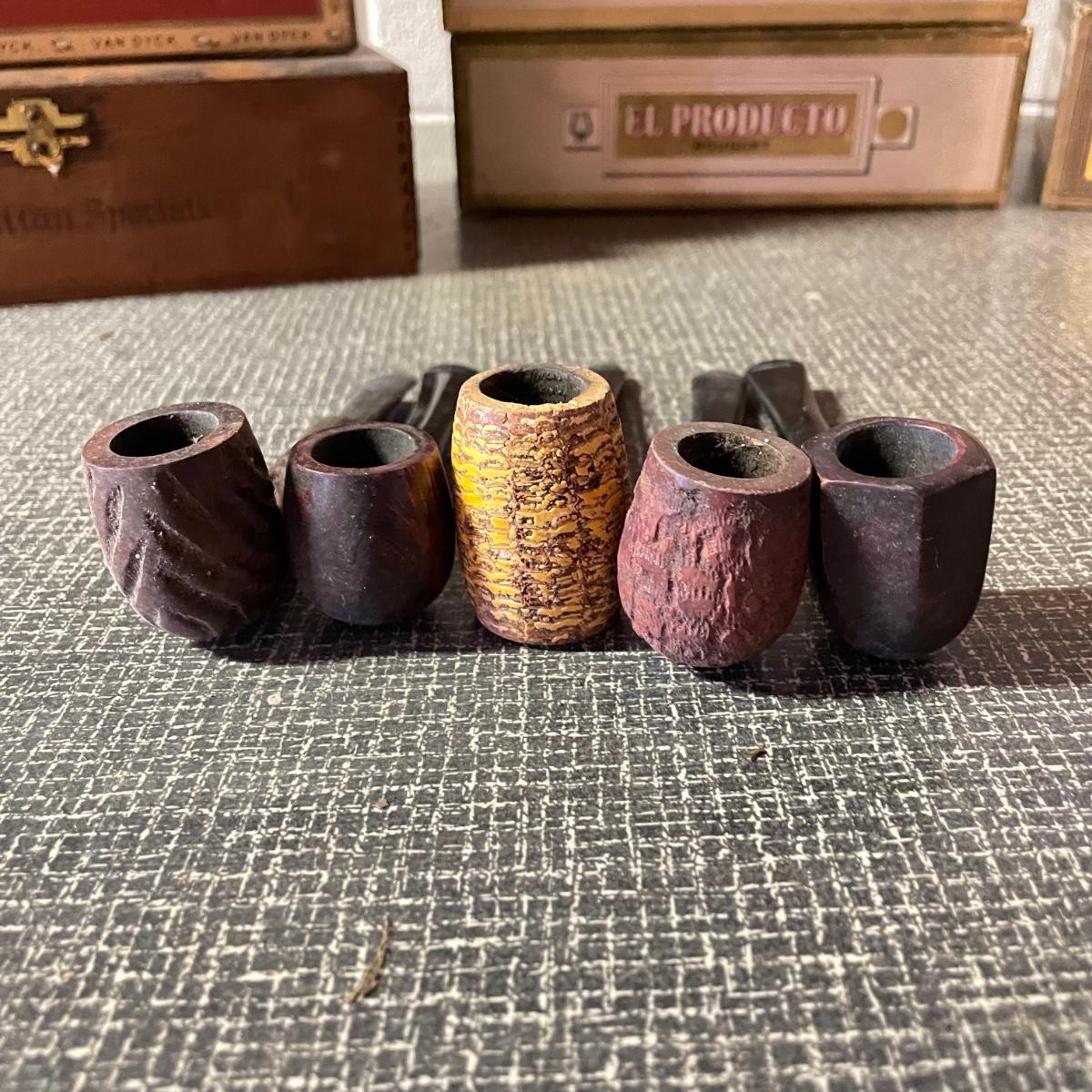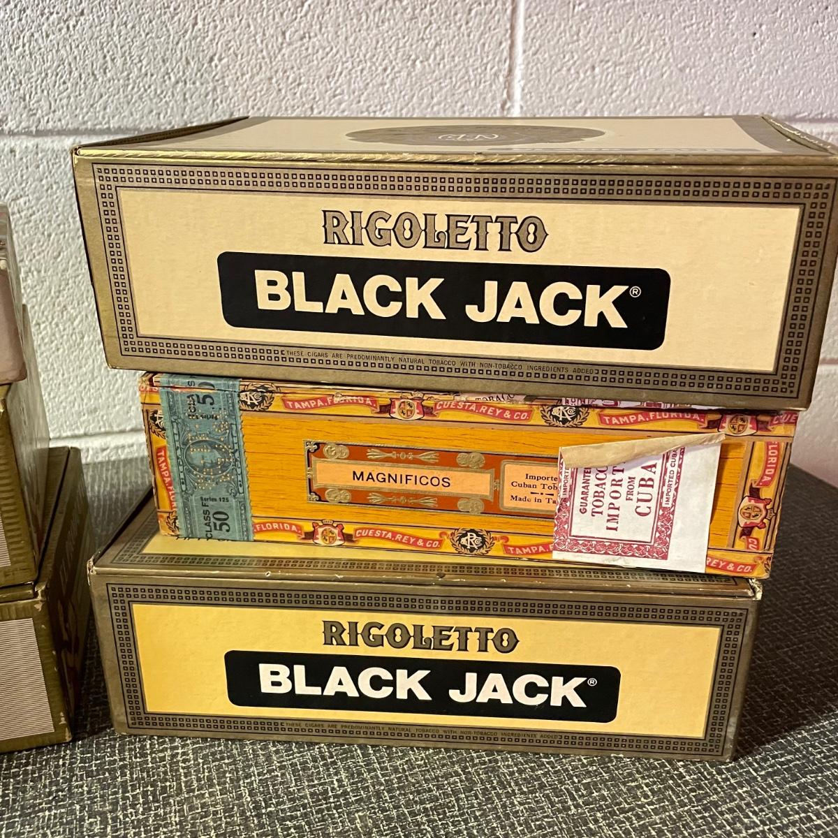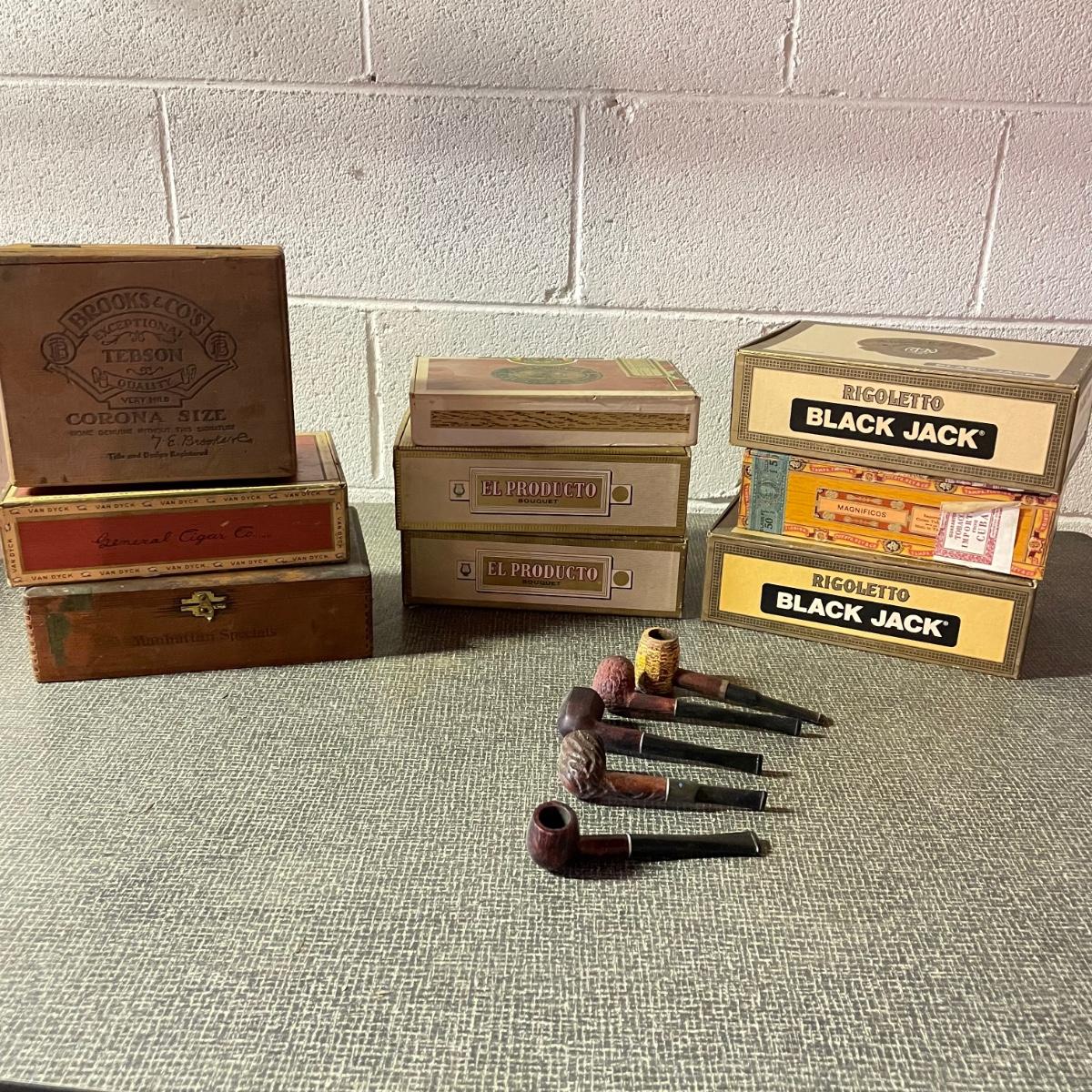 Five tobacco pipes, four stamped “Imported Briar” with other markings and one with a “Buescher’s World Famous Pipes USA” sticker. They vary only slightly in size with the largest at 5.5”. Lot also features two wooden and seven cardboard cigar boxes. The larger Manhattan Special wooden box from Havana has a crack near the hinge. The wood loosens, but can be easily placed back together, glue would be an easy fix. The largest cigar boxes are the two Rigoletto Black Jack boxes measuring 9.5” x 6” x 3”. See images. Shipping available.