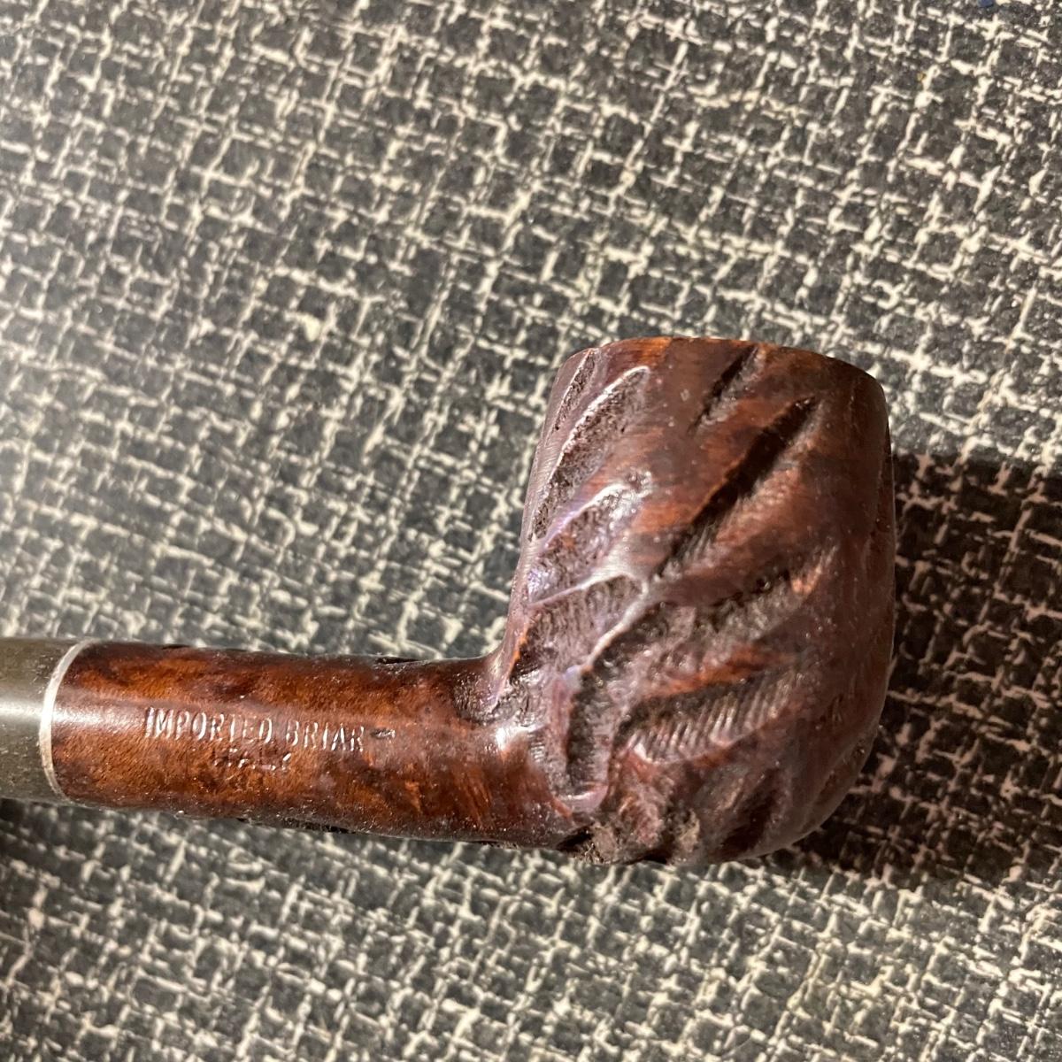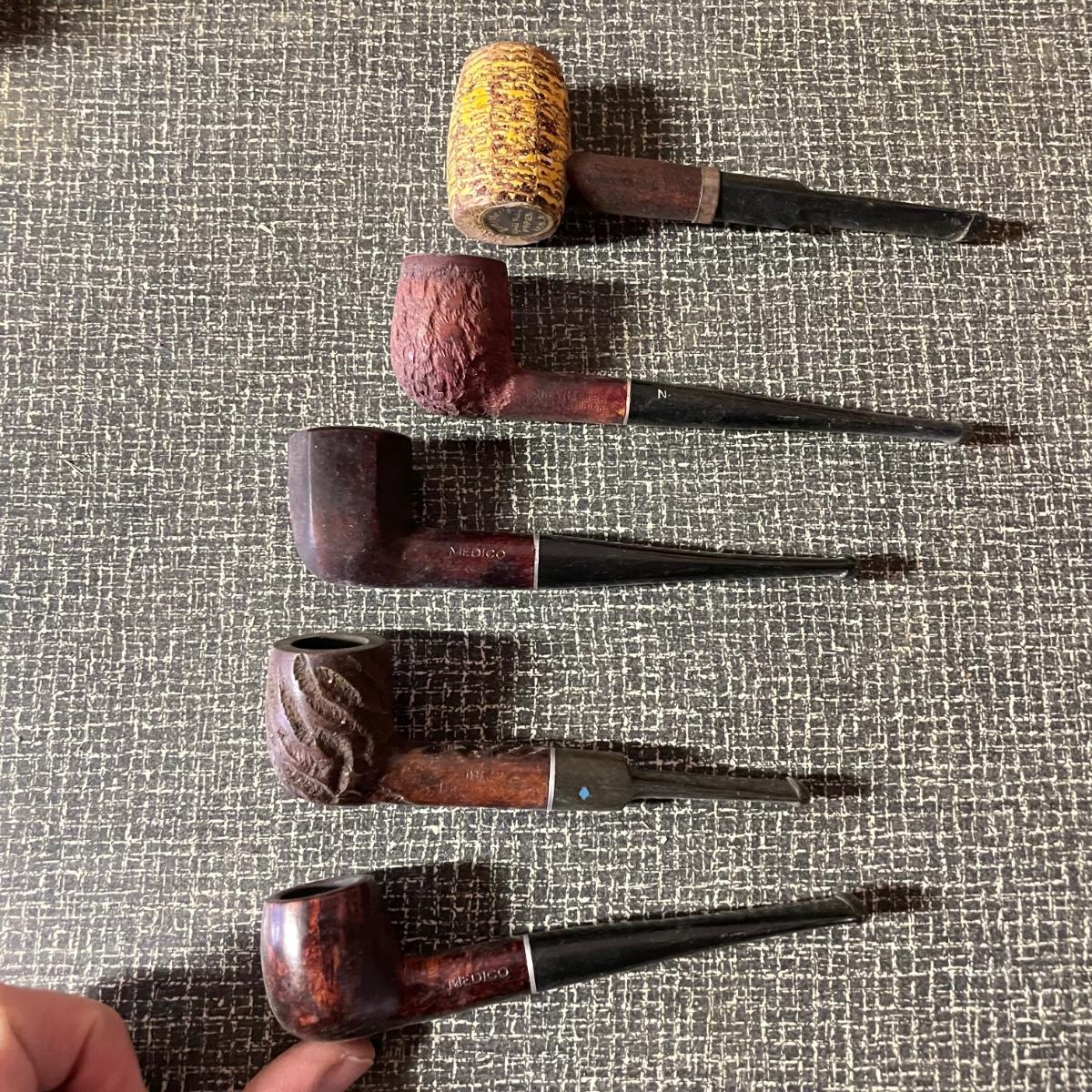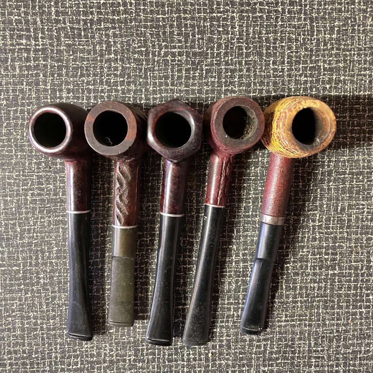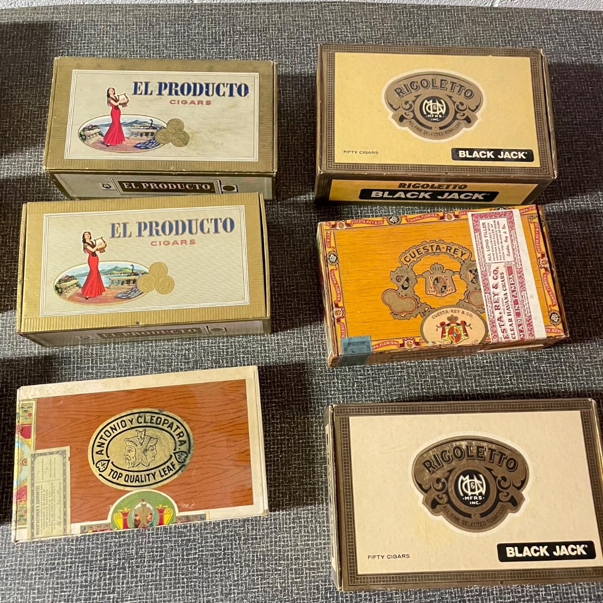 Five tobacco pipes, four stamped “Imported Briar” with other markings and one with a “Buescher’s World Famous Pipes USA” sticker. They vary only slightly in size with the largest at 5.5”. Lot also features two wooden and seven cardboard cigar boxes. The larger Manhattan Special wooden box from Havana has a crack near the hinge. The wood loosens, but can be easily placed back together, glue would be an easy fix. The largest cigar boxes are the two Rigoletto Black Jack boxes measuring 9.5” x 6” x 3”. See images. Shipping available.