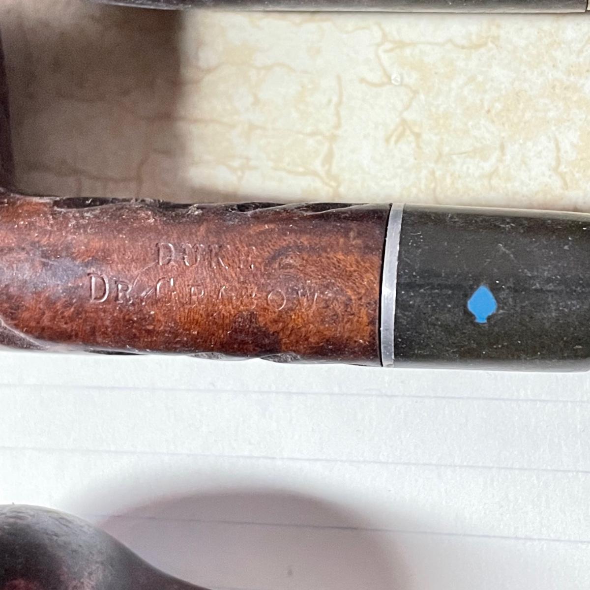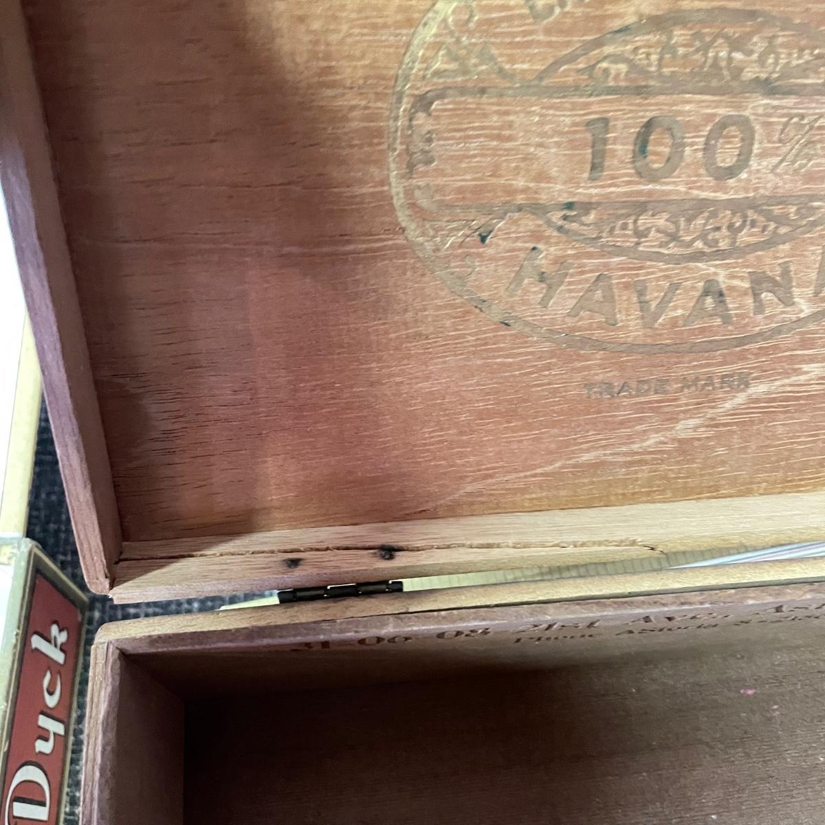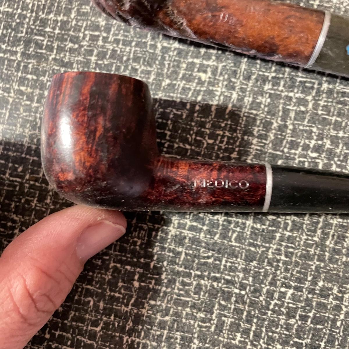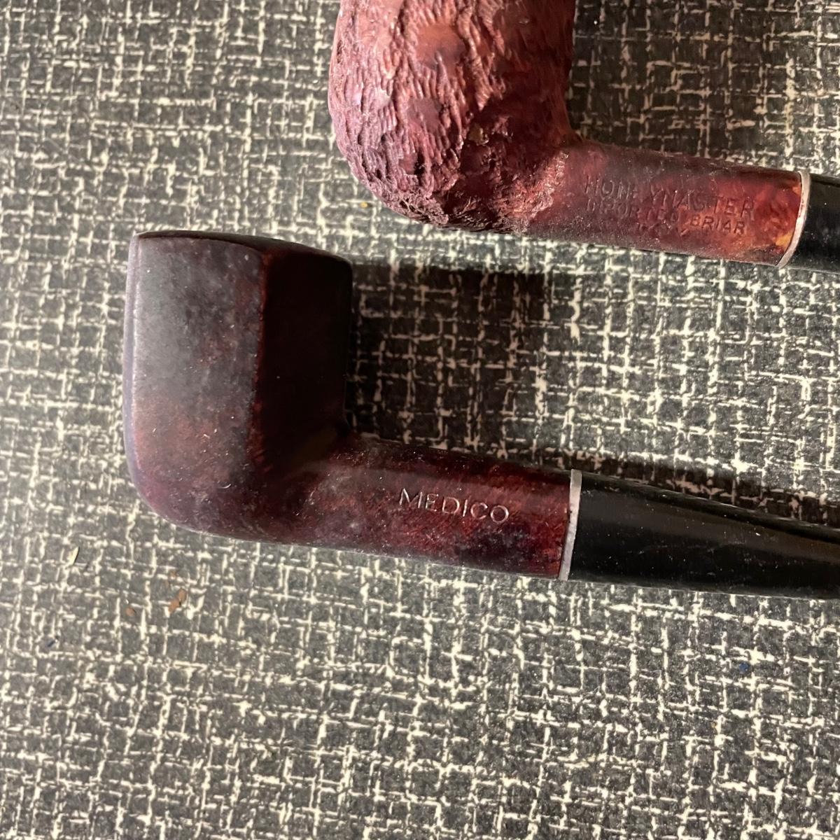 Five tobacco pipes, four stamped “Imported Briar” with other markings and one with a “Buescher’s World Famous Pipes USA” sticker. They vary only slightly in size with the largest at 5.5”. Lot also features two wooden and seven cardboard cigar boxes. The larger Manhattan Special wooden box from Havana has a crack near the hinge. The wood loosens, but can be easily placed back together, glue would be an easy fix. The largest cigar boxes are the two Rigoletto Black Jack boxes measuring 9.5” x 6” x 3”. See images. Shipping available.