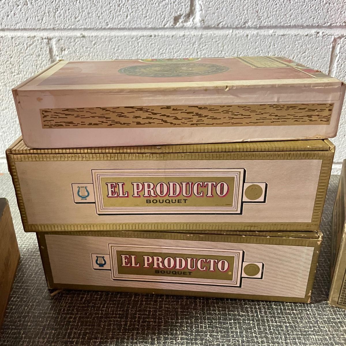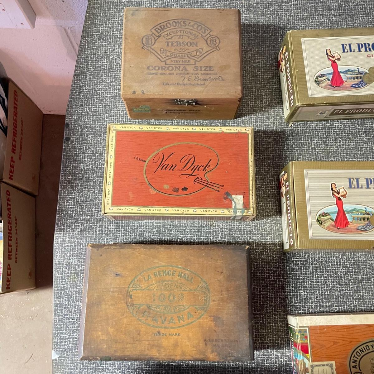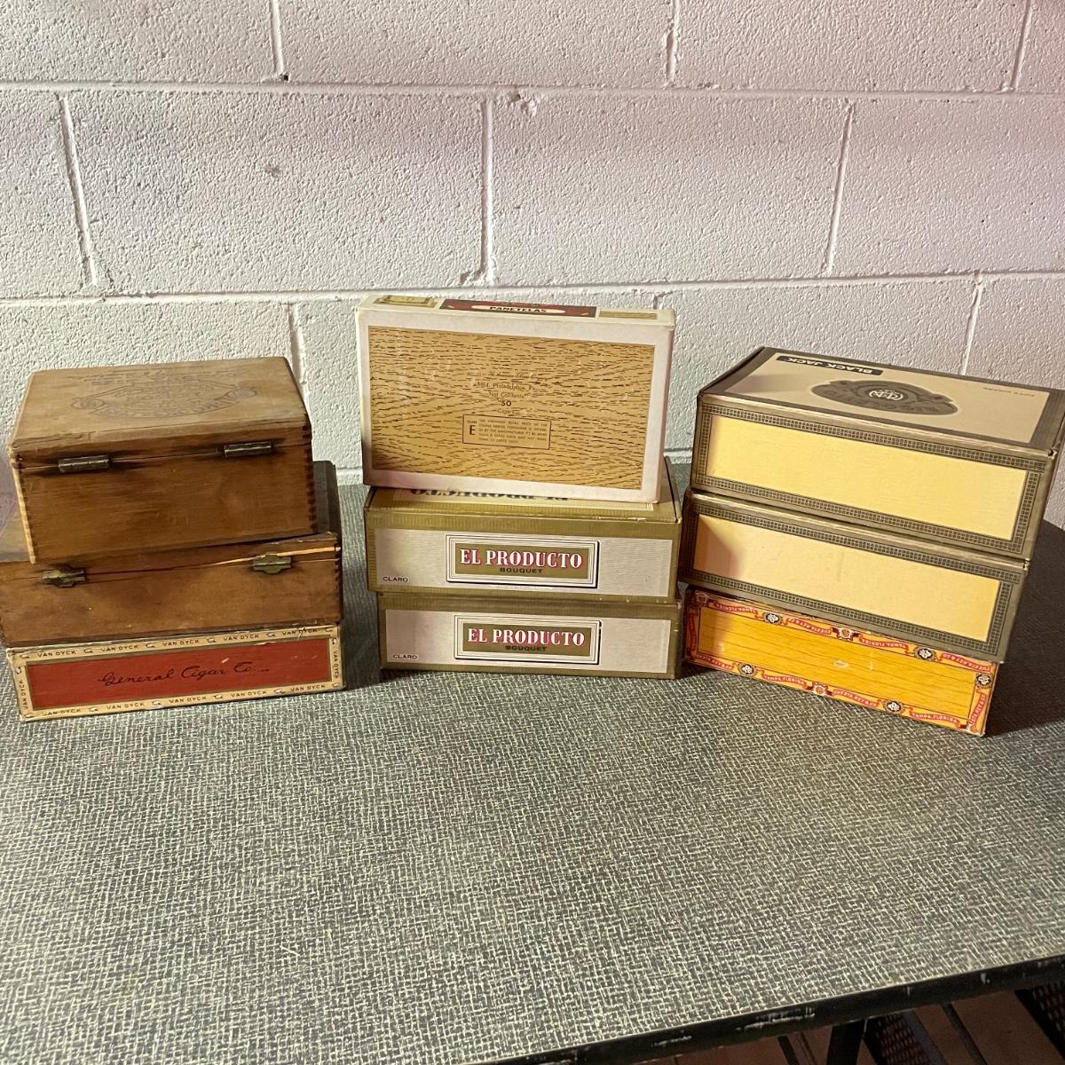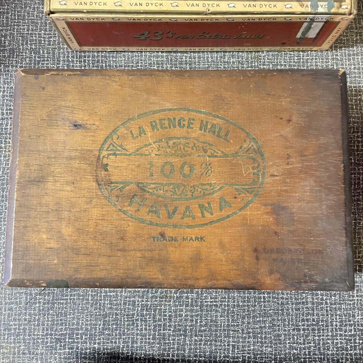 Five tobacco pipes, four stamped “Imported Briar” with other markings and one with a “Buescher’s World Famous Pipes USA” sticker. They vary only slightly in size with the largest at 5.5”. Lot also features two wooden and seven cardboard cigar boxes. The larger Manhattan Special wooden box from Havana has a crack near the hinge. The wood loosens, but can be easily placed back together, glue would be an easy fix. The largest cigar boxes are the two Rigoletto Black Jack boxes measuring 9.5” x 6” x 3”. See images. Shipping available.