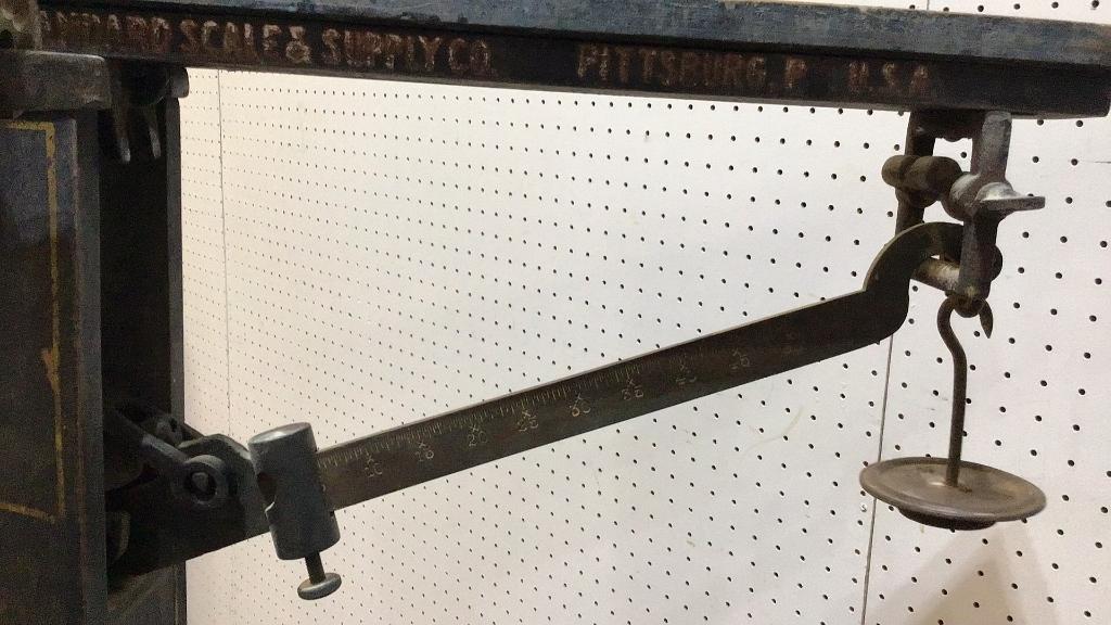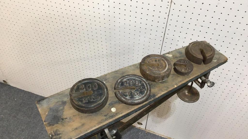 Marked ‘Standard Scale & Supply Co Pittsburg P.A.’, 2 1lb weights, 2 2lb weights, 1 0.5lb weight