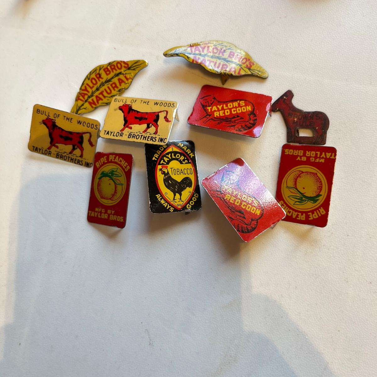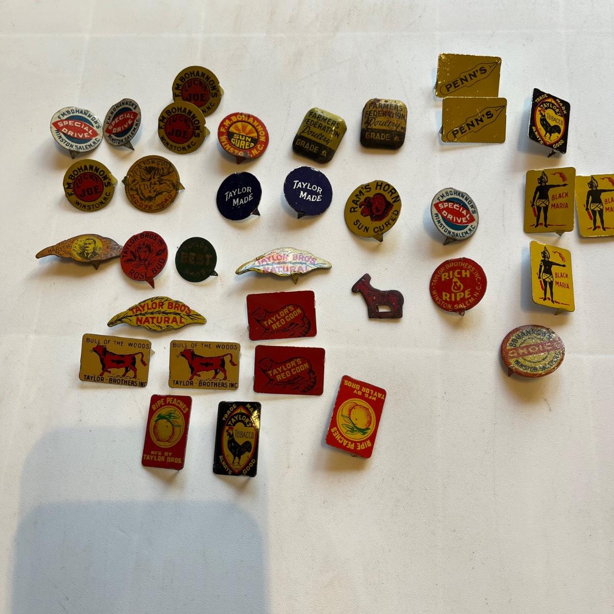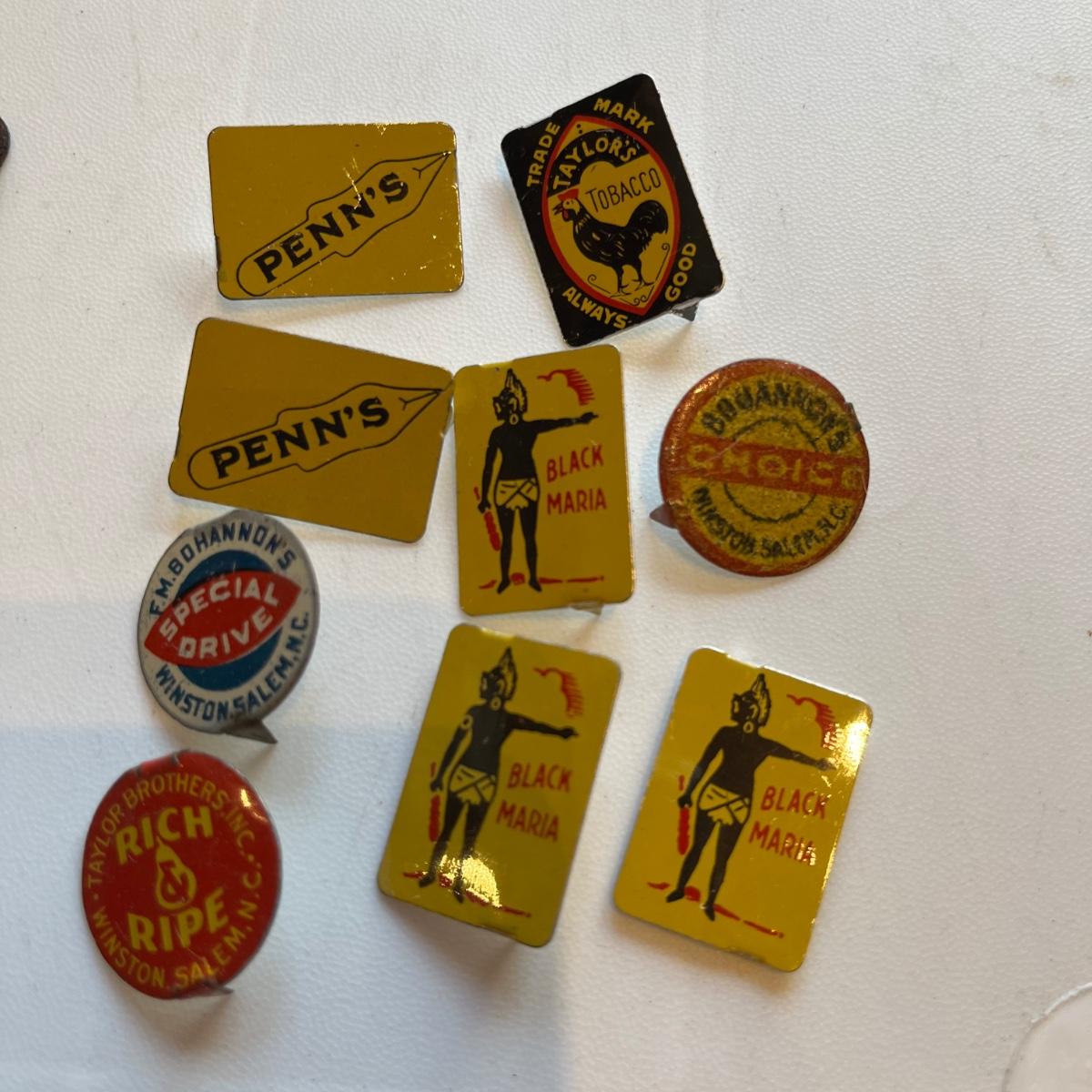 Lot contains over thirty tobacco tin tags including Taylor Bros, Black Maria, Rams Horn, F.M. Bohannon, Penns & more.