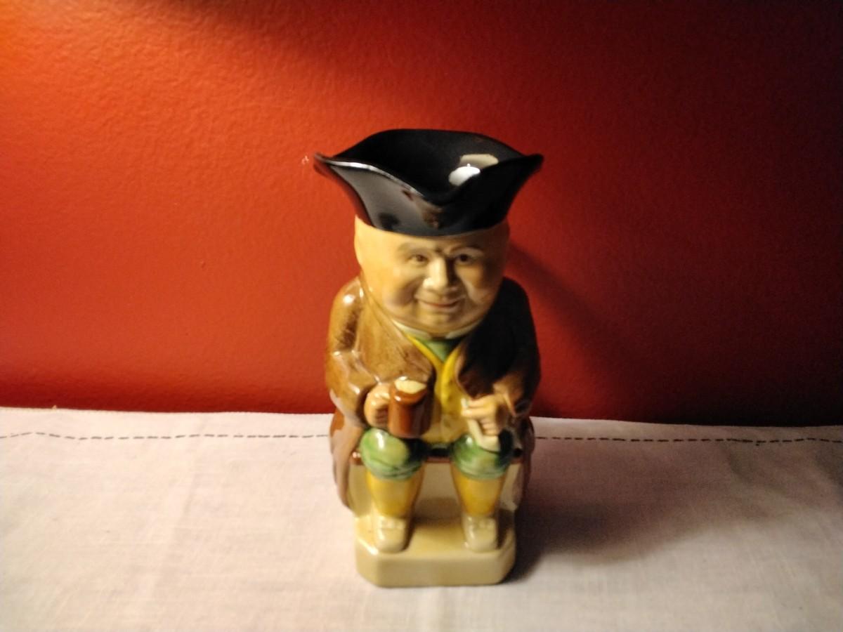 Large size "Ordinary" Toby Jug #1 made by Wood & Sons, Burslem, England. This jug is a little over 7" tall, with a 4" x 3" base. He is dressed for the 18th century with a long pigtail, a black tricorn hat, tan coat, green knee-britches, & mustard socks & vest. He holds a mug of ale & a pipe.