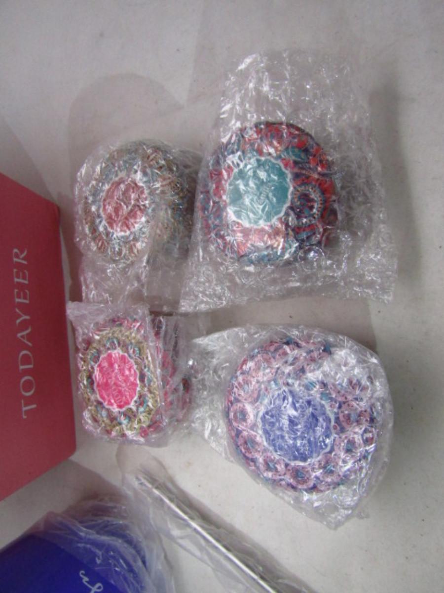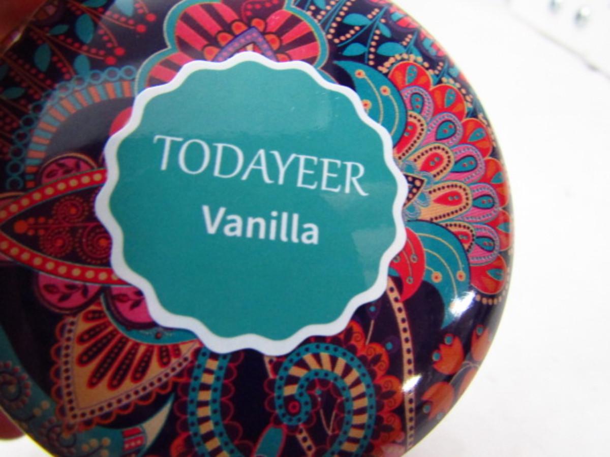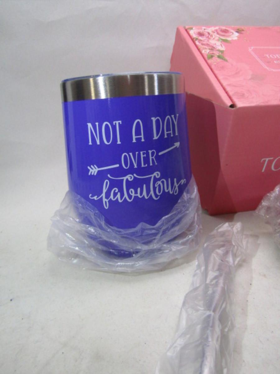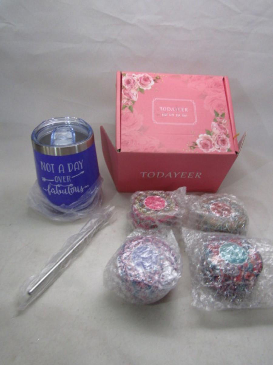 Todayeer Travel Mug and Candle Gift Set. Candle fragrances include lavender, vanilla, jasmine, and rose- all are in metal tins.