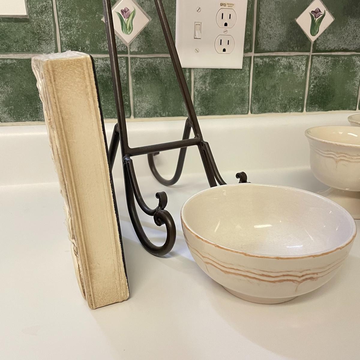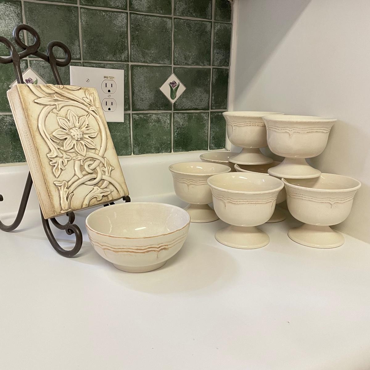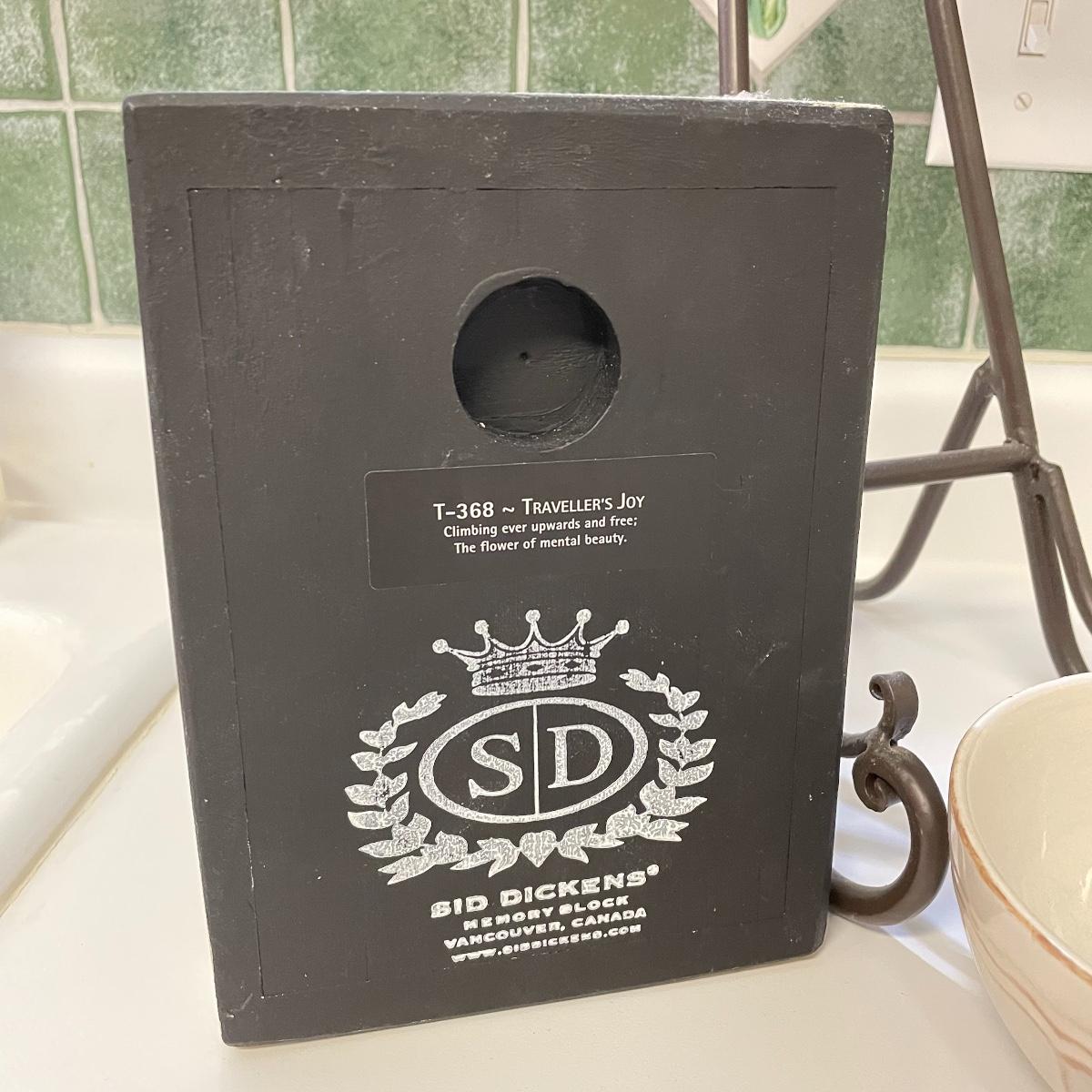 Seven Todd English footed bowls are 5”d x 4”. One 6” x 2.75” oven/microwave/dishwasher safe bowl included. Heavy resin Sid Dickens memory block names T-368 Traveller’s Joy measures 6” x 8” and comes with heavy iron easel. Local pick up only.