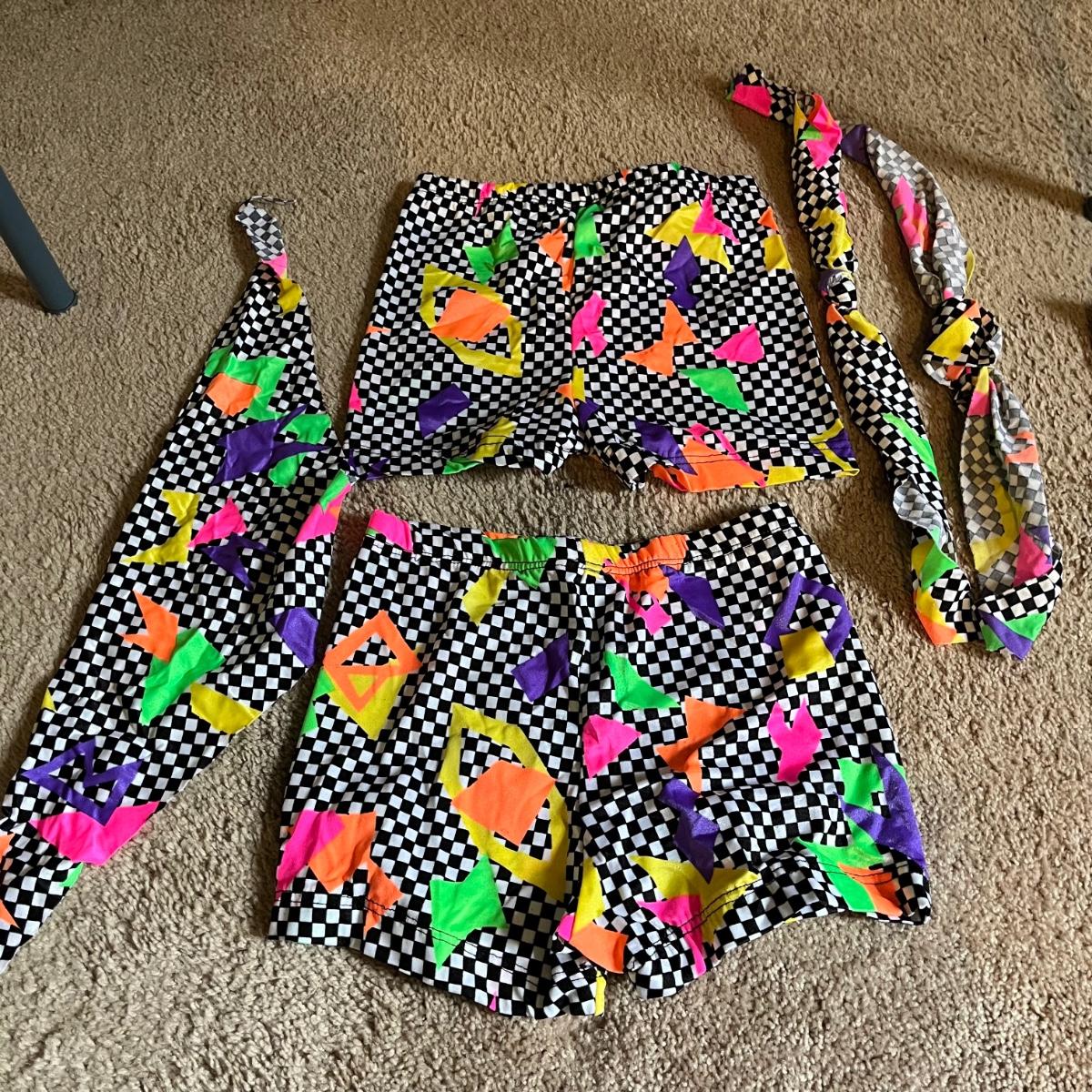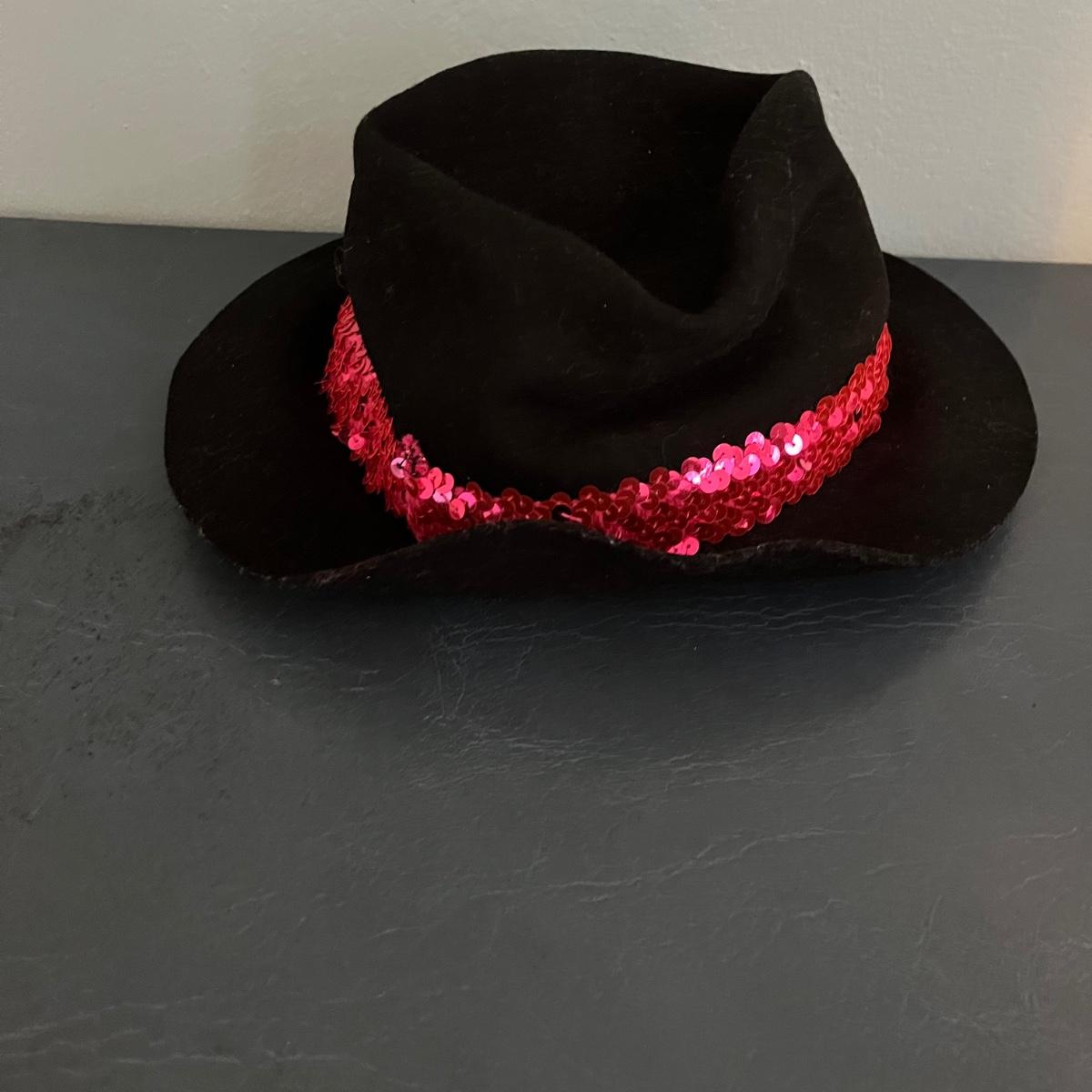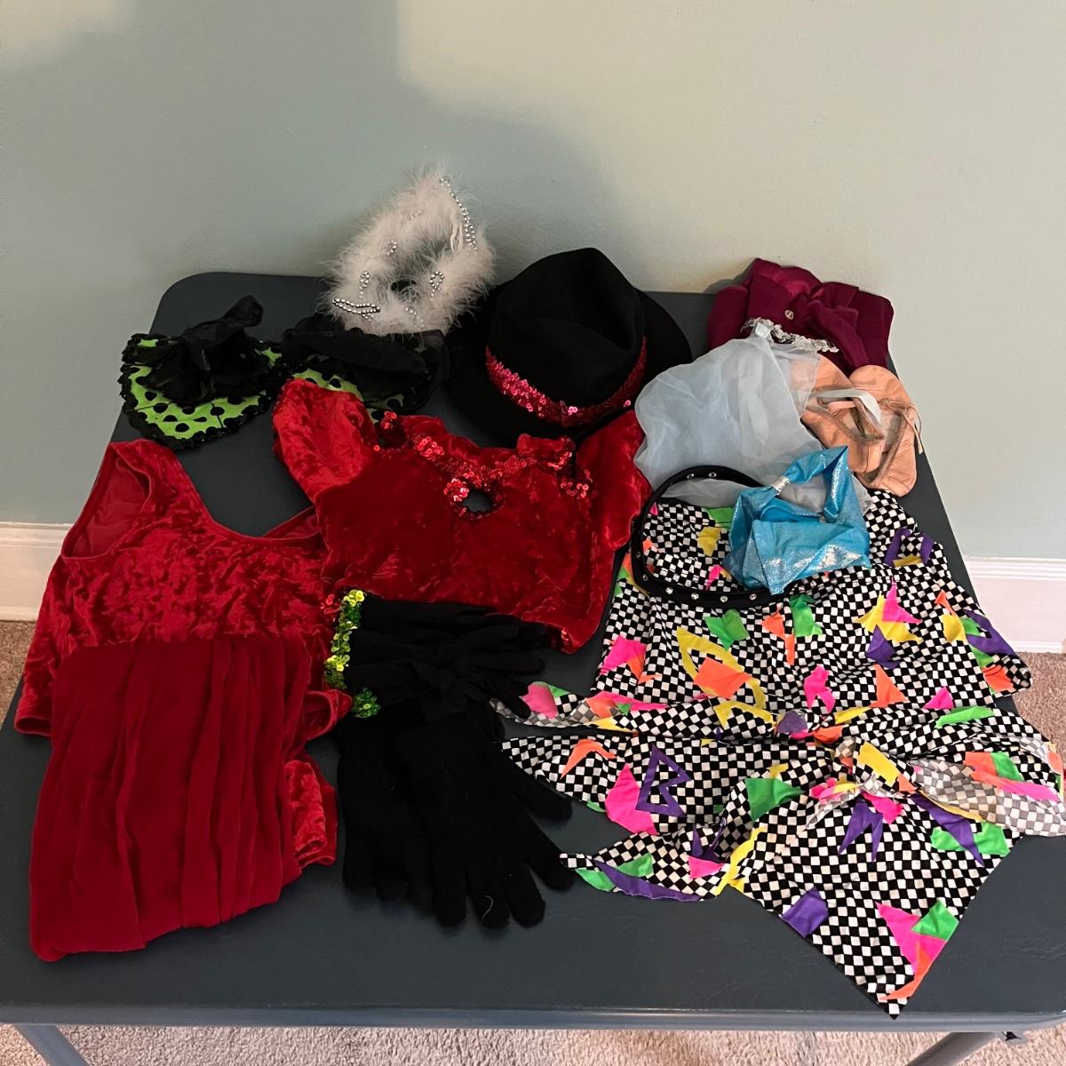 Lot includes dance shoes and skirt, four headbands, two red tops, two pair of gloves, designer black hat in size small, checkered shorts and more. Shorts have a 20” waist.