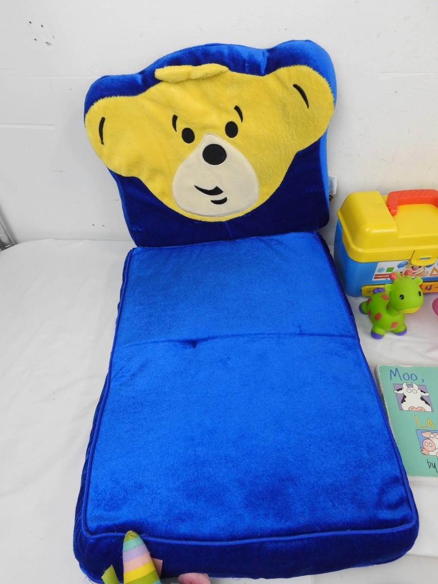 Toddler Toy Lot: Board Books, Cushions, Head Bands, Tool Box