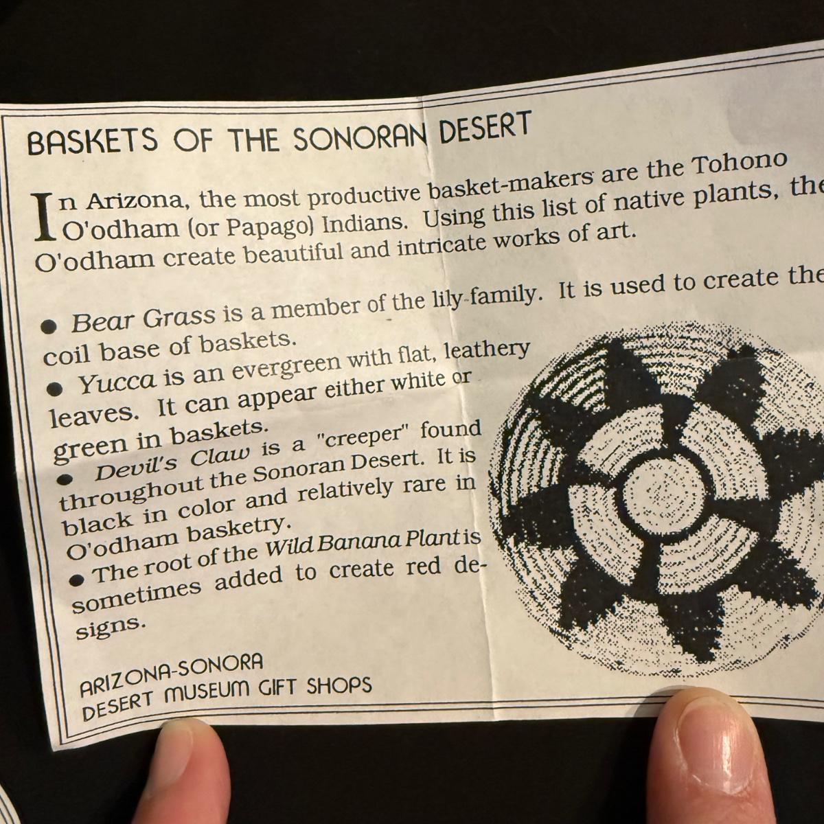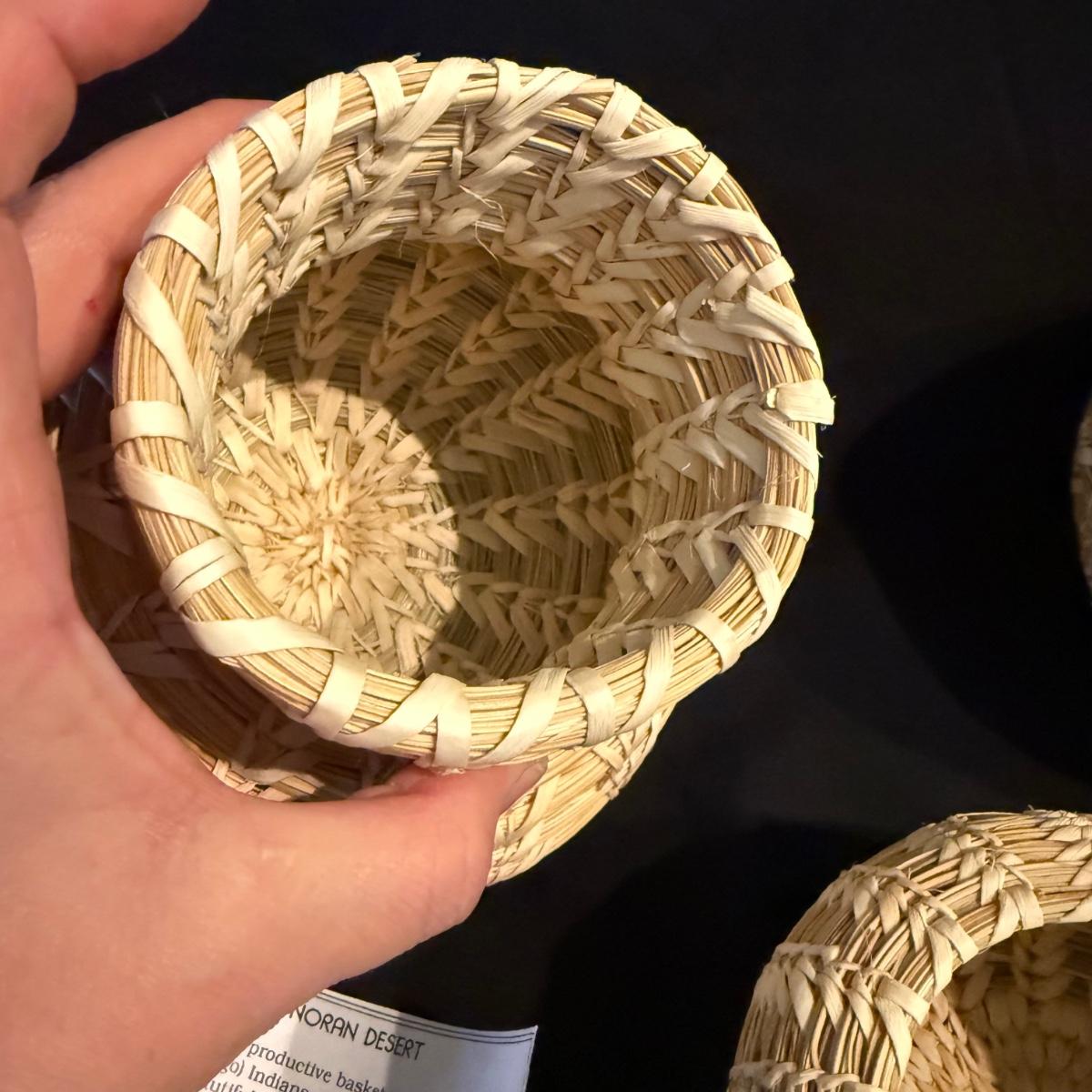 Three stunning woven baskets with paper fliers that state “Baskets of the Sonoran Desert” and more info and the native plants used. The largest basket is approximately 7”D x 5.25”H. See images. Shipping available. Shipping available.