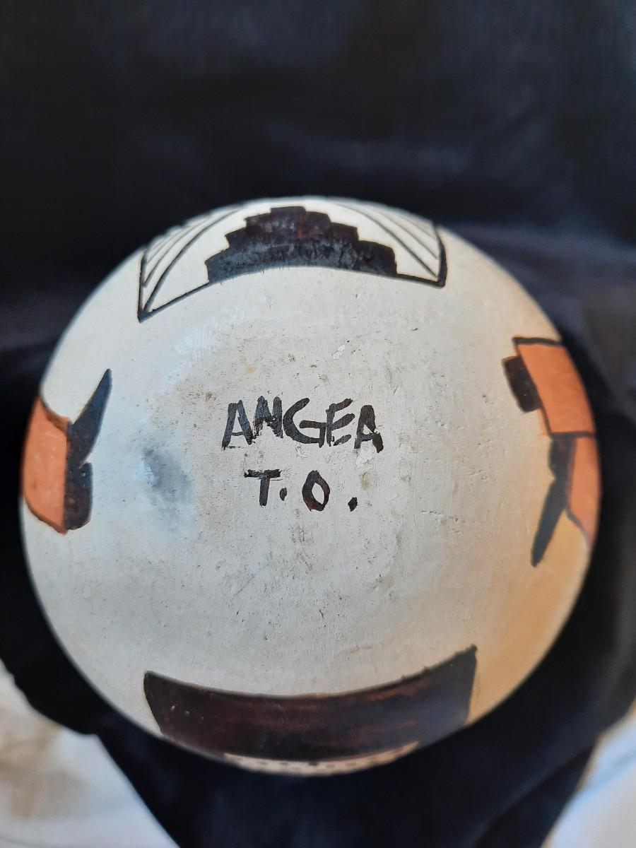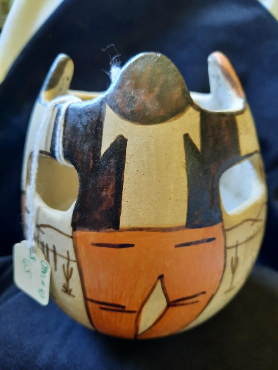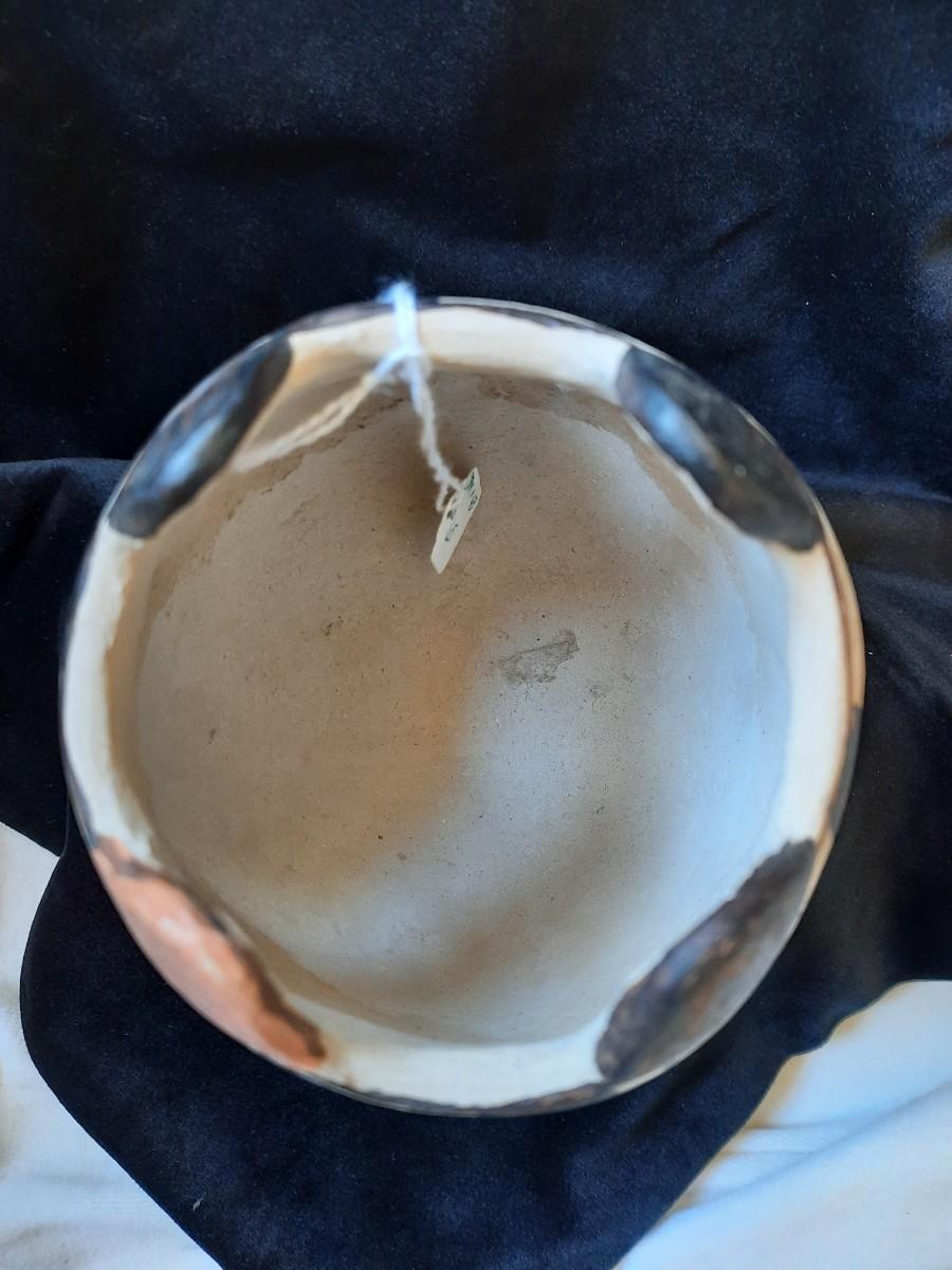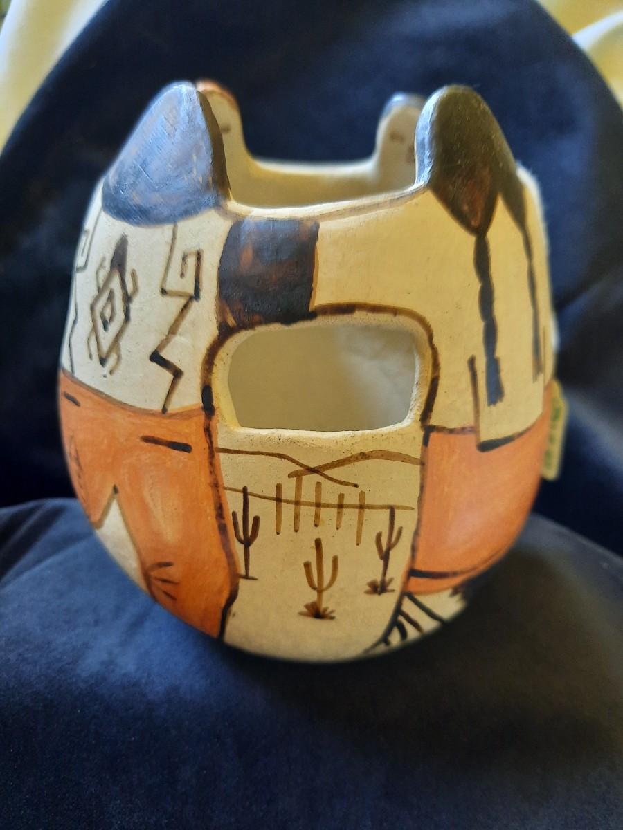 Hand made and hand painted clay friendship bowl made by Angea of the Tohono O'Odham tribe.