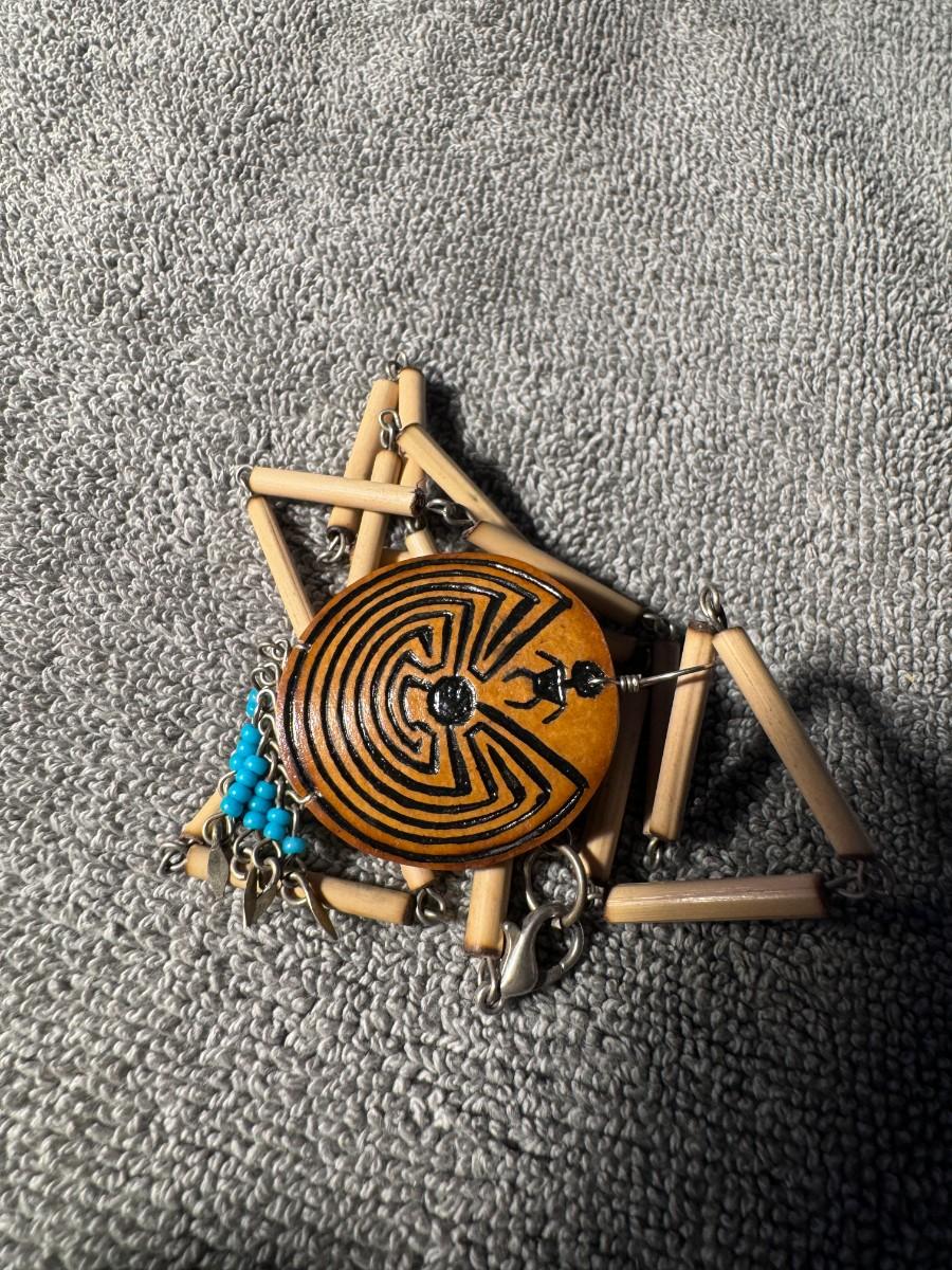 The central part of the jewelry is a carved or etched medallion with the "Man in the Maze" design.
