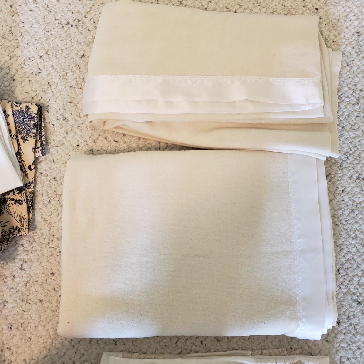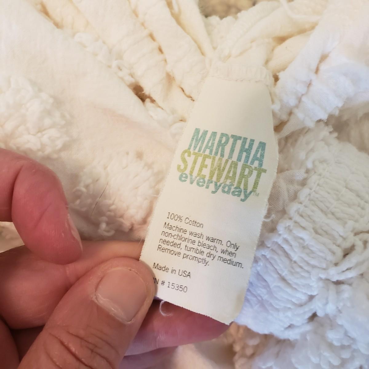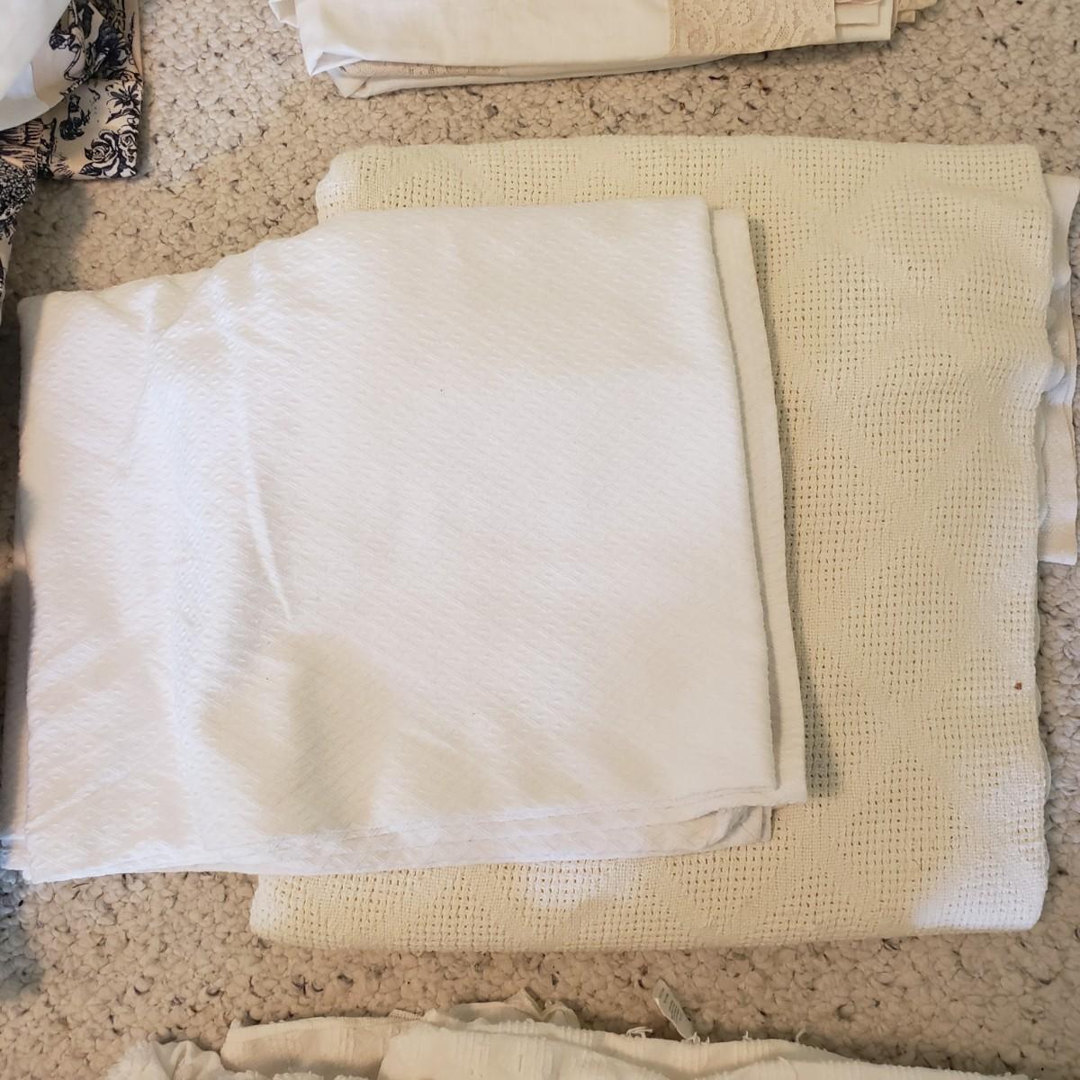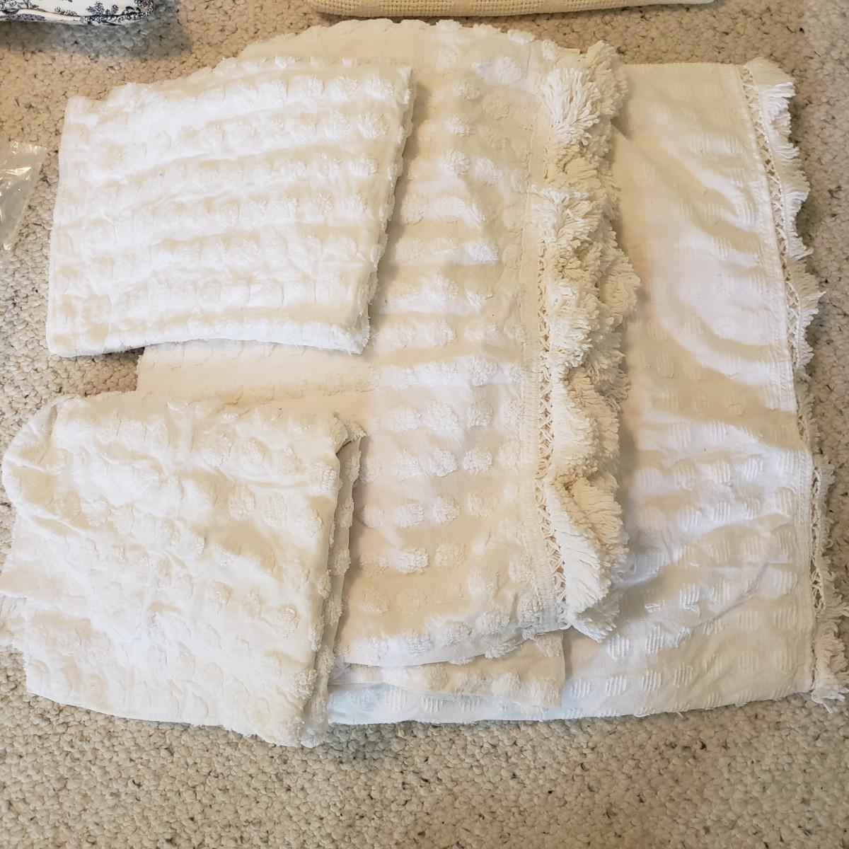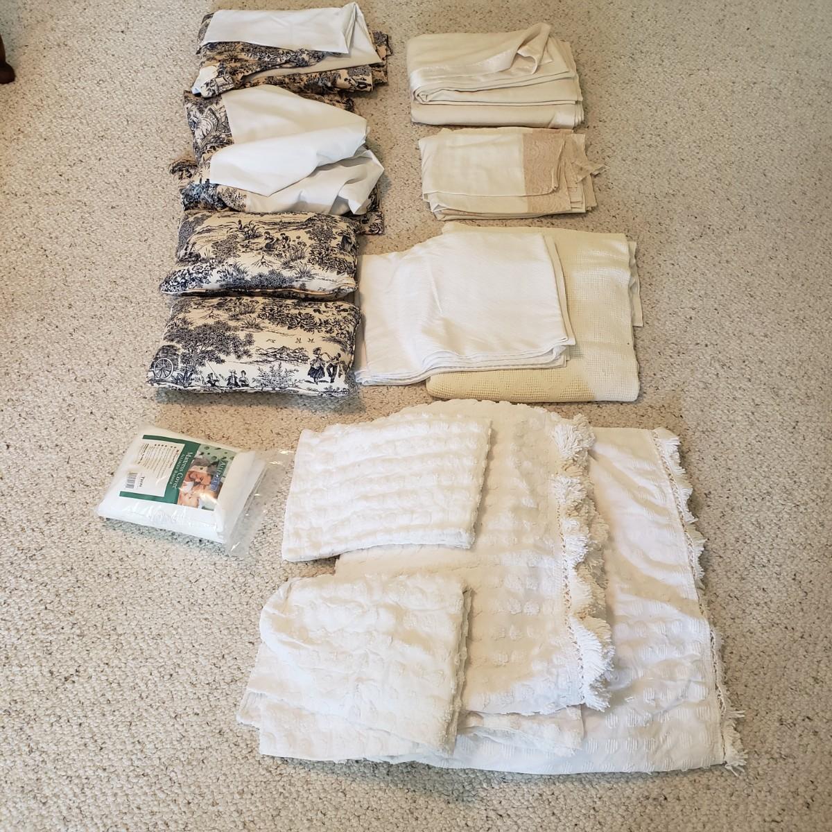 Twin bedding! There are two Martha Stewart chenille style white bedspreads with matching pillow shams, two cotton blankets, the white one has a stain, see pictures. Two wool blankets in a soft cream color, without tags and two lace bed coverlets. Also included, is one mattress cover,, which appears to be new in the bag. Finally, are what appears to be hand-sewn bedskirts for twin beds and measure 20.5 wide x 72” long with two matching pillows. Each measures approximately 17” x 3” x 10”H.