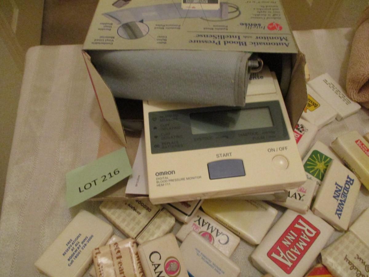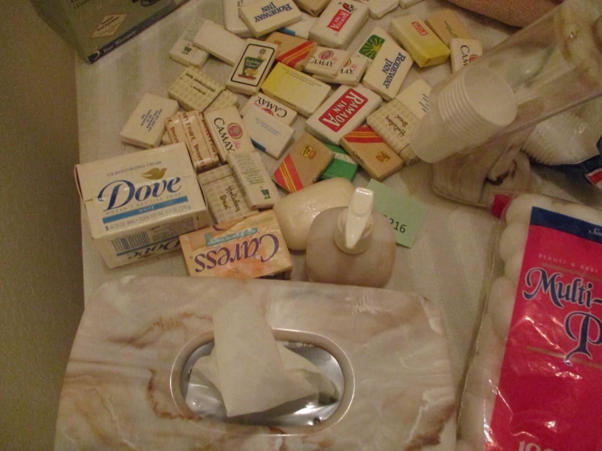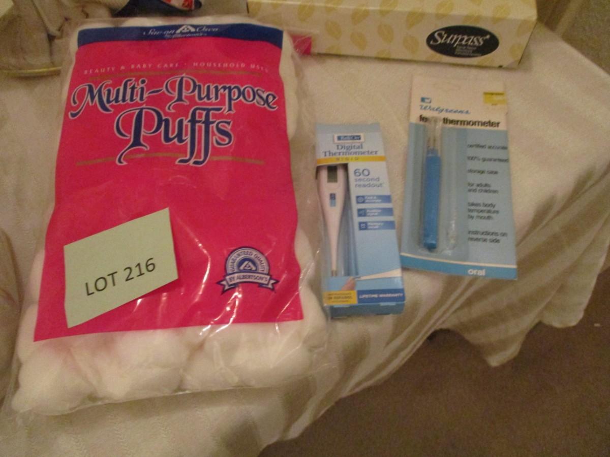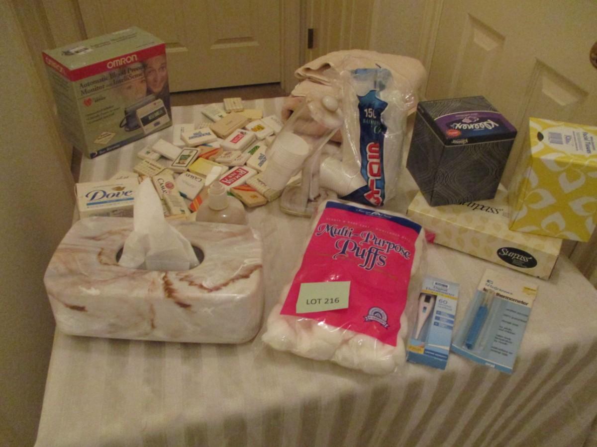 Facial Tissue, Digital Thermometer, Tissue box holder, Mouthwash cups & holder. blood pressure machine, towels, soap, cotton balls