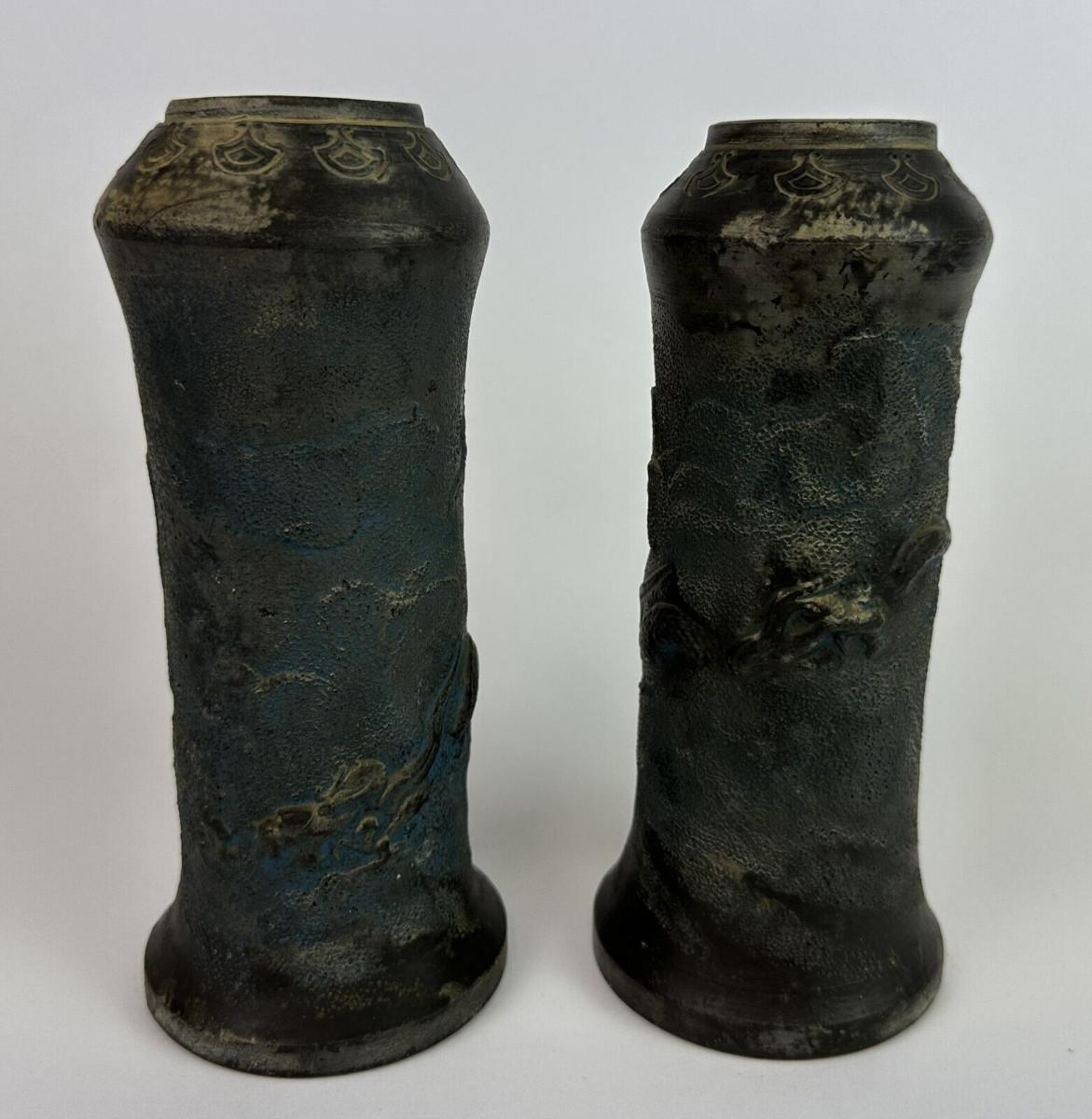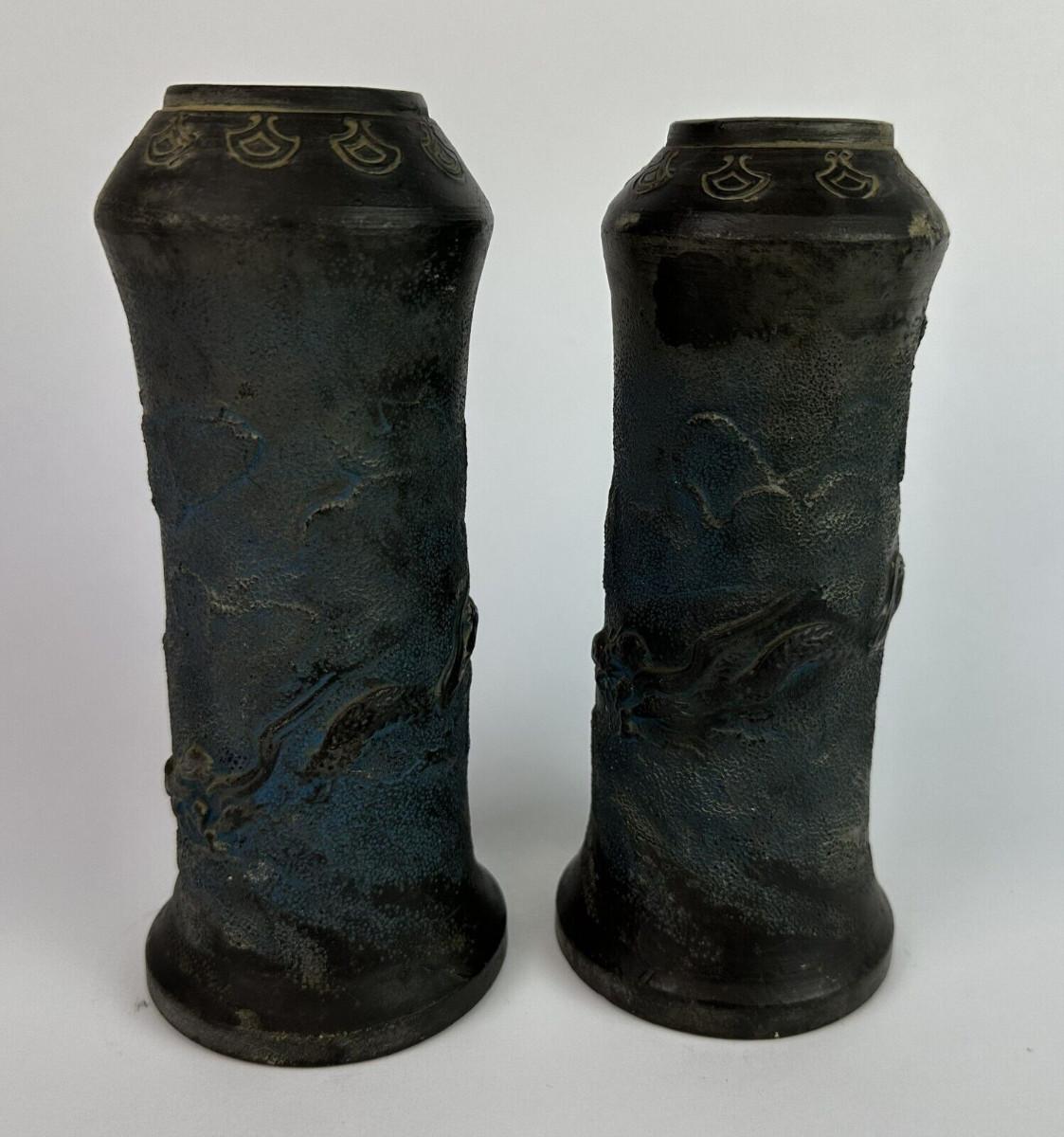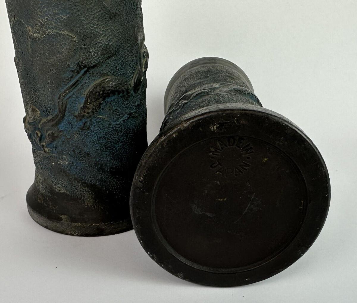 Here are a matched pair of 7" tall Tokanabe Pottery Vases from Japan circa 1920s-1930s...In relief a flying dragon rings these cylinders with painted blue skies on black ceramic...bronze effect...as shown...Estate find...3" base