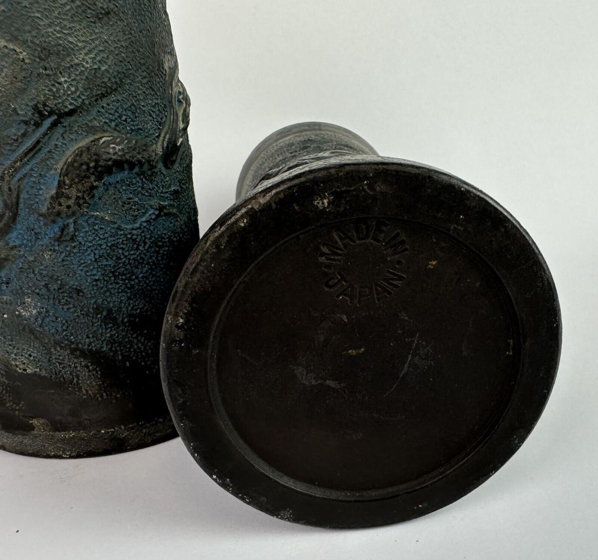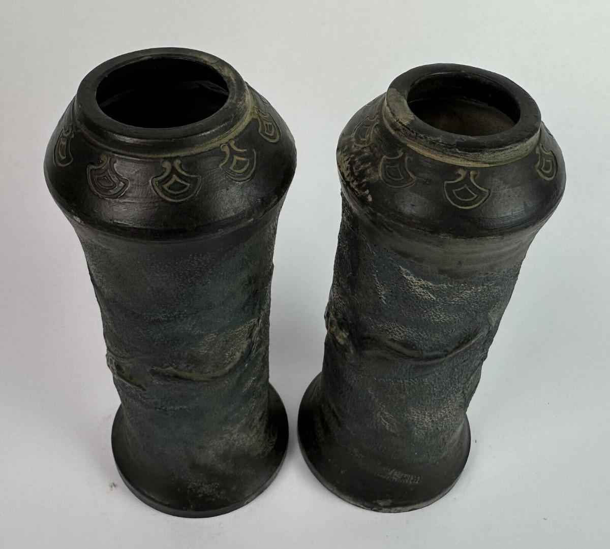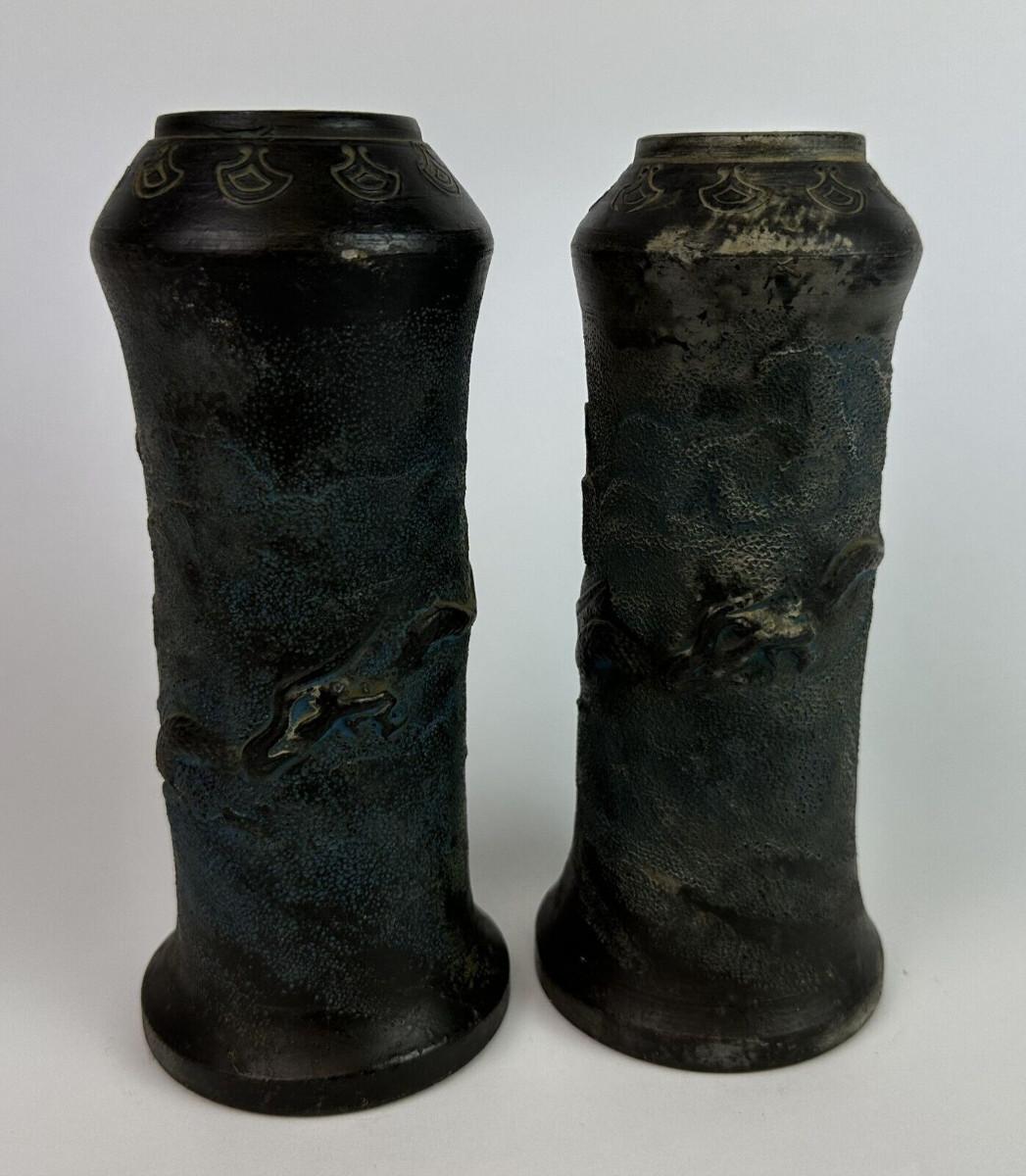Here are a matched pair of 7" tall Tokanabe Pottery Vases from Japan circa 1920s-1930s...In relief a flying dragon rings these cylinders with painted blue skies on black ceramic...bronze effect...as shown...Estate find...3" base