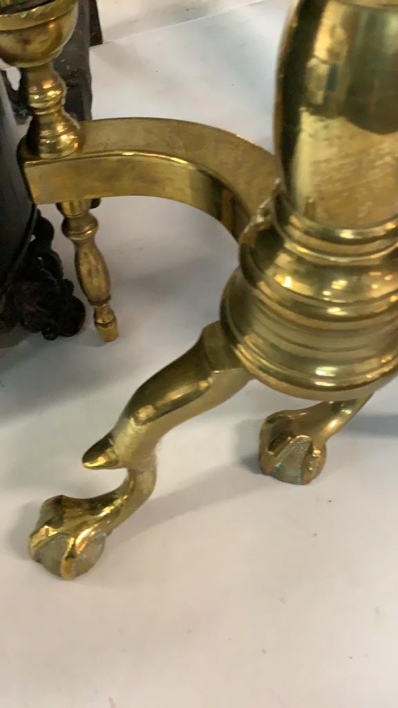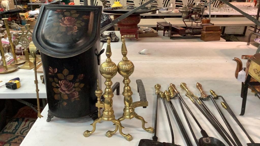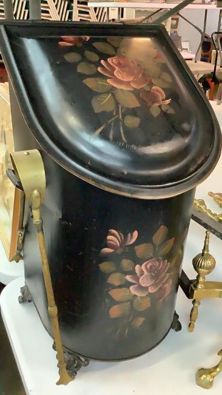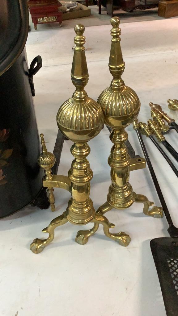 24 inch Victorian painted Coal Hod, pair brass paw foot andirons, with orb finials, 9 brass handle fire tools