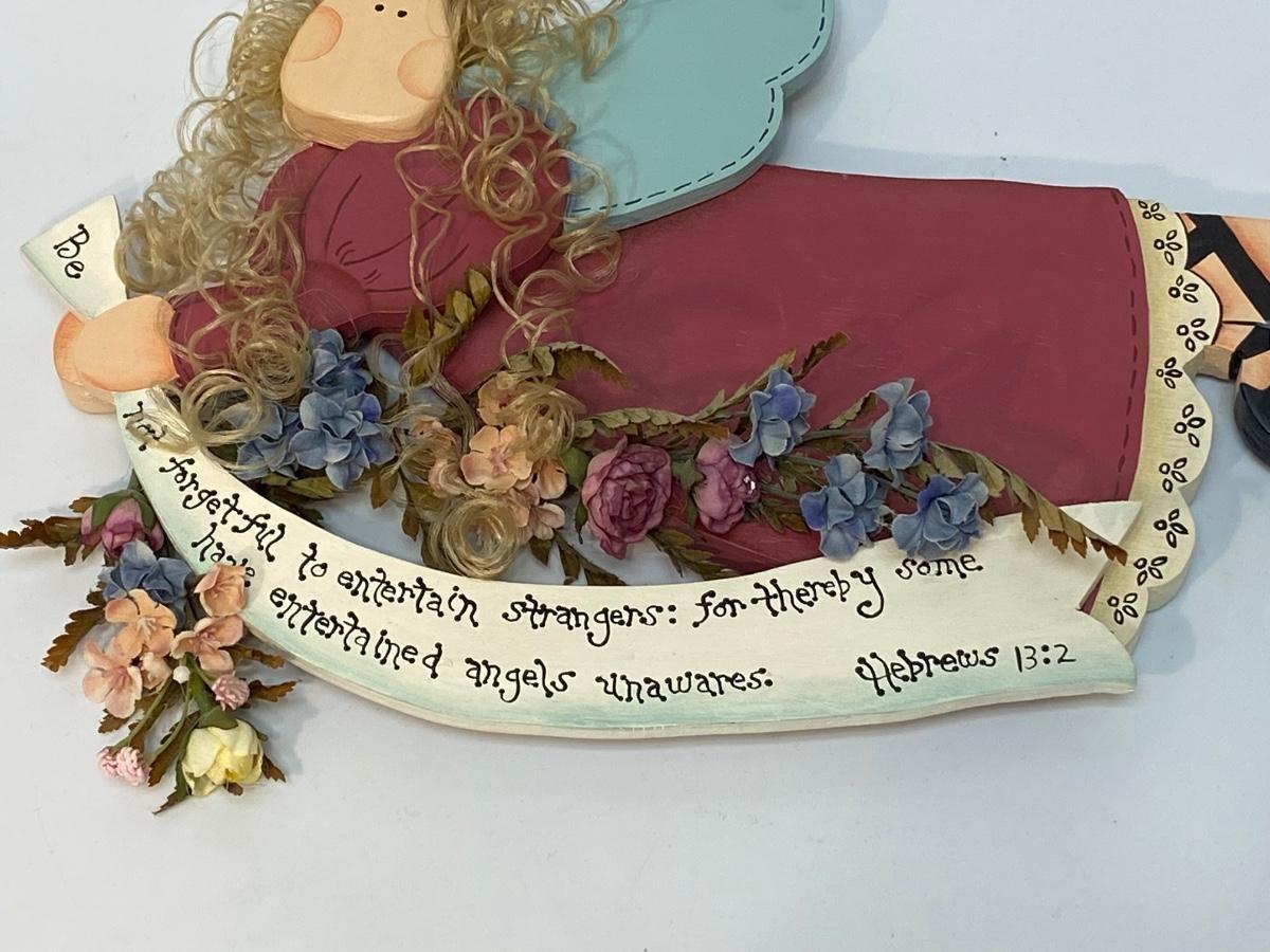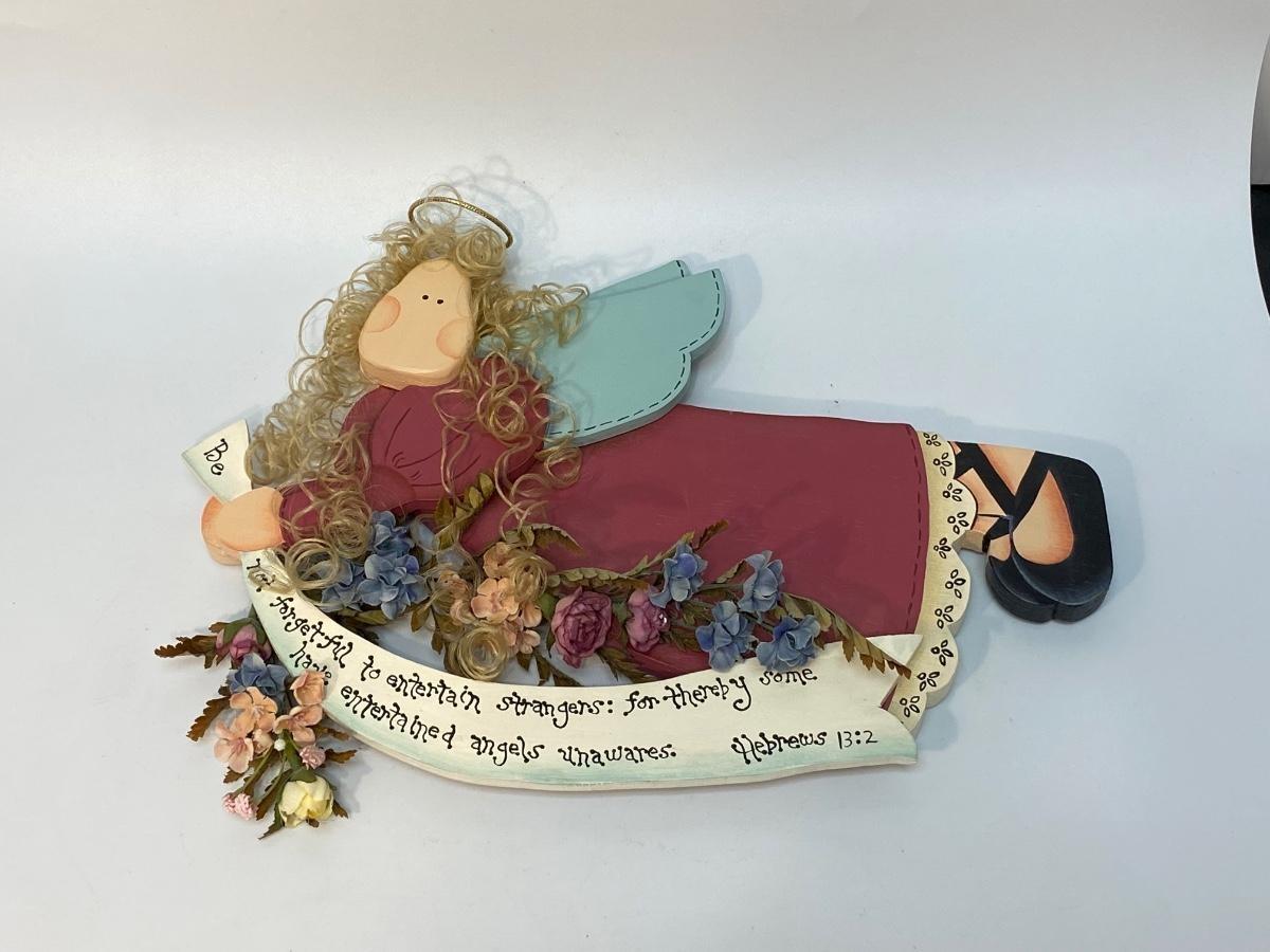 Tole painted wood angel with Biblical scripture from Hebrews 13:2. Wall hanging, handmade, good condition. About 12" length.