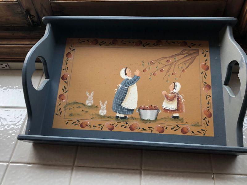 Tole painted wood serving tray basket. Cute country scene of Mother and Child picking apples. A couple of bunnies as well. Heart shaped handle cut outs.