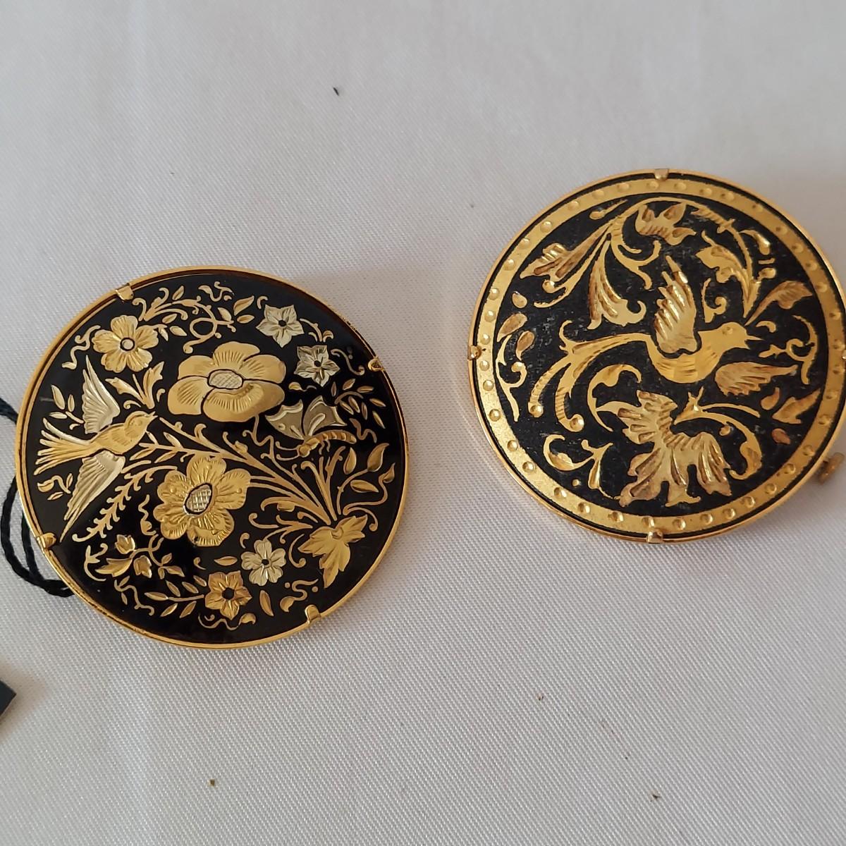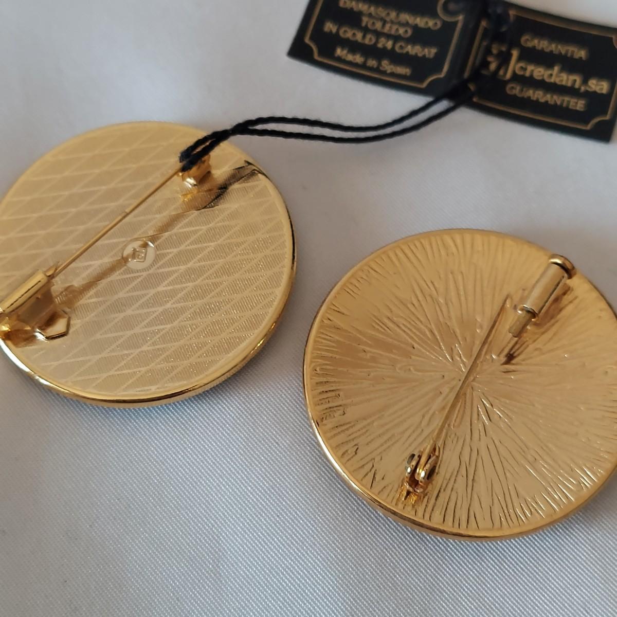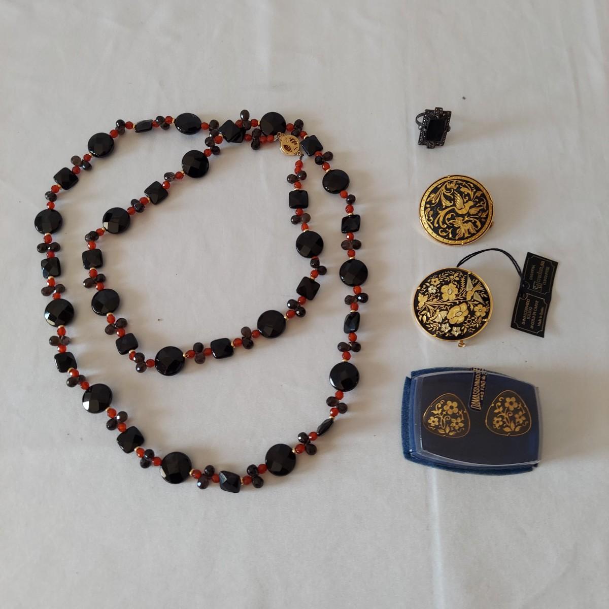 Lot includes one necklace, two brooches, a pair of clip-on earrings and a ring. The beaded necklace is stamped 14k. The Toledo Damascene brooches and earrings are not stamped but the packaging is marked 24k. The ring is approximately a size 7 and does not appear to be stamped. The necklace is 39" long.
