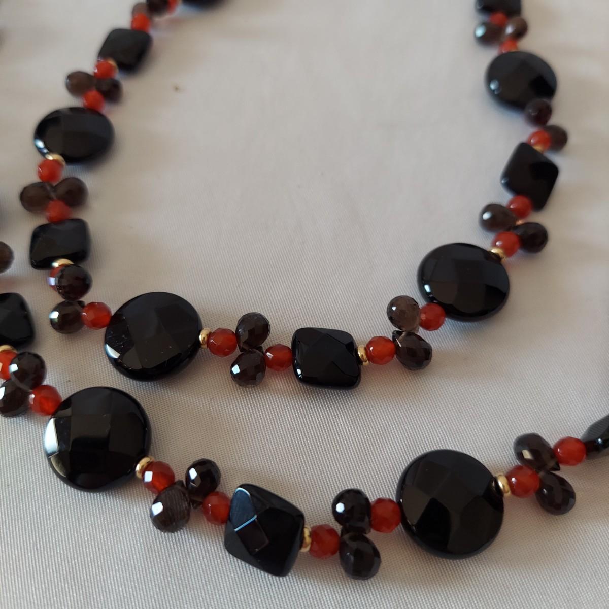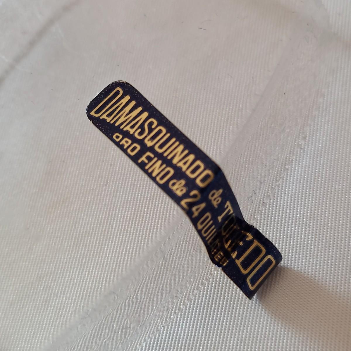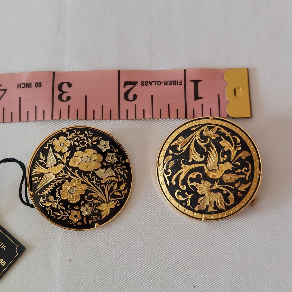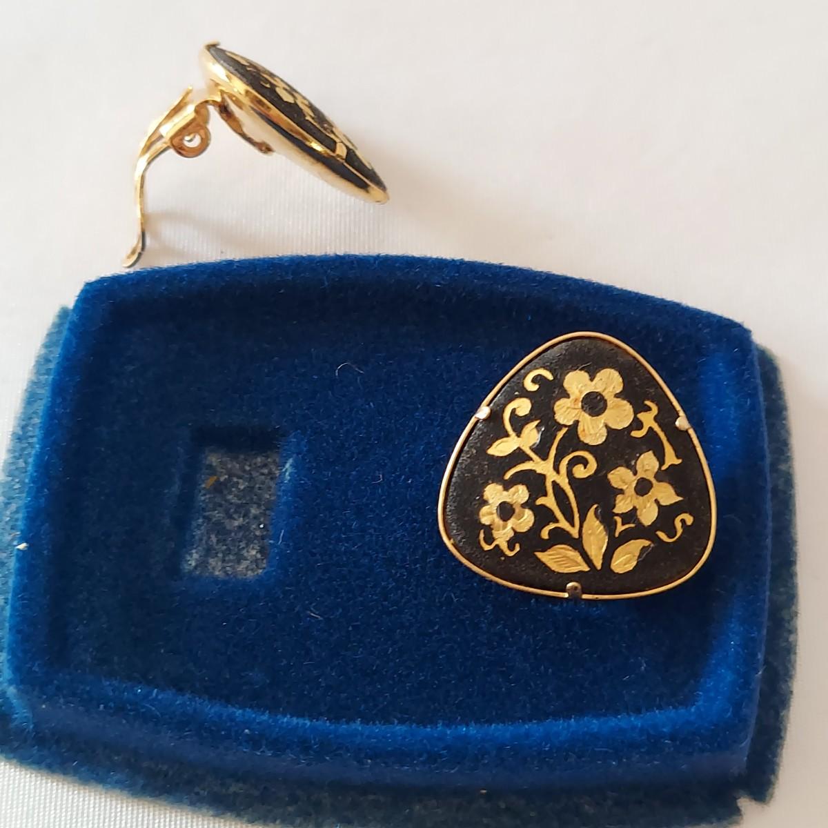 Lot includes one necklace, two brooches, a pair of clip-on earrings and a ring. The beaded necklace is stamped 14k. The Toledo Damascene brooches and earrings are not stamped but the packaging is marked 24k. The ring is approximately a size 7 and does not appear to be stamped. The necklace is 39" long.