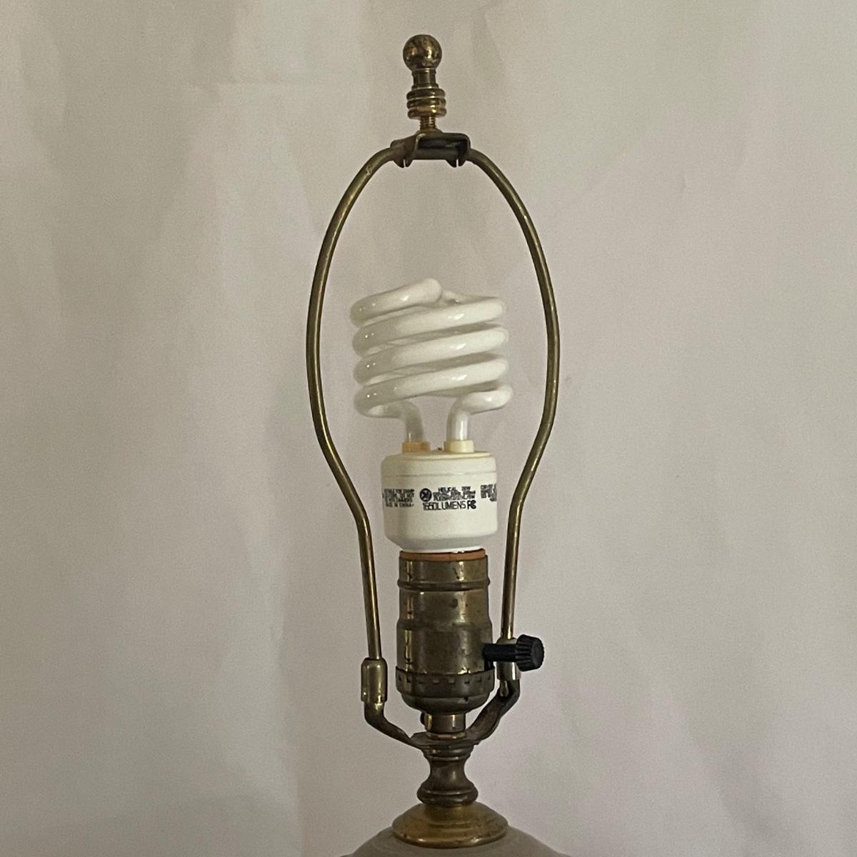 This signed pottery lamp has the typical tasteful abstract design Tom Ferguson is well known for. Measures 4” d base x 9.5” tall, not including the hoop.