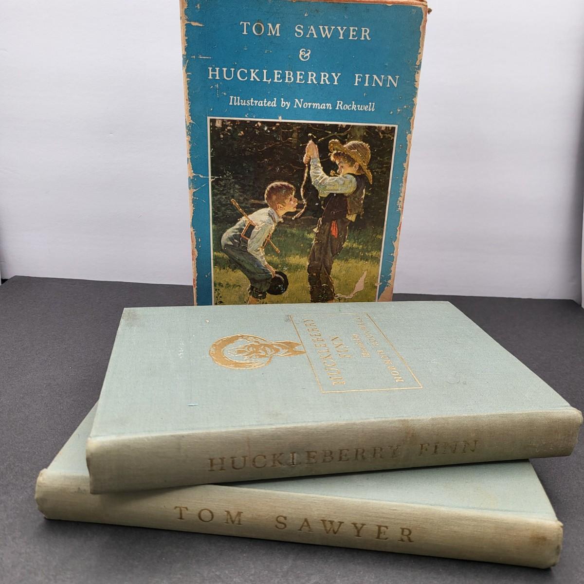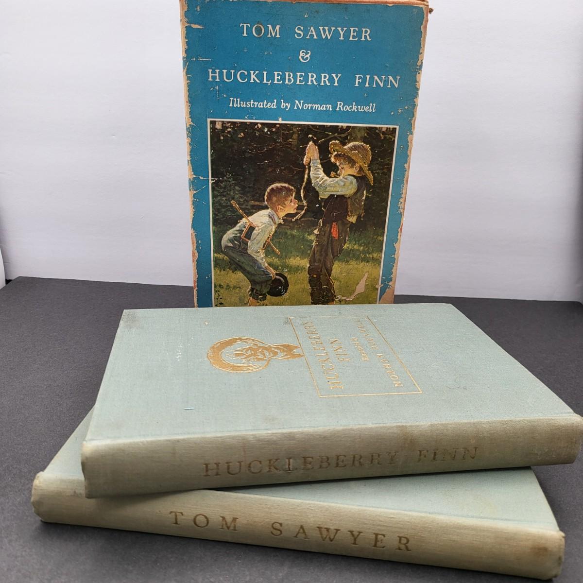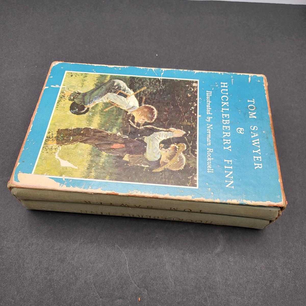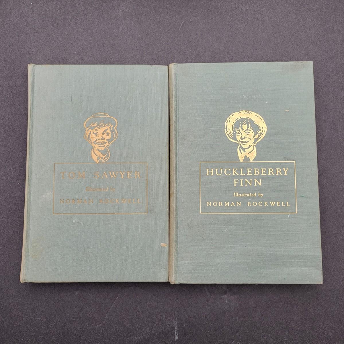 Heritage Press, Tom Sawyer 1939, Huckleberry Finn 1940, Samuel L. Clemens, hardback books. Illustrated by Norman Rockwell. Some inscription pen mark writing and owner sticker inside. Covers and binding are in pretty decent shape, except for the cardboard sleeve they are stored in has flaws.
