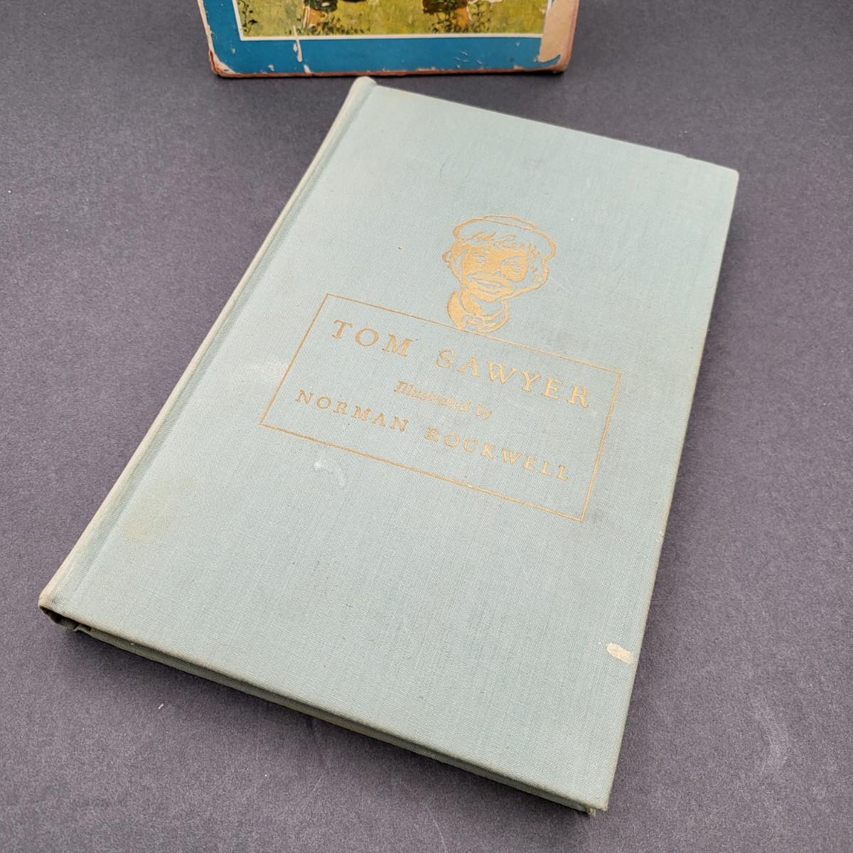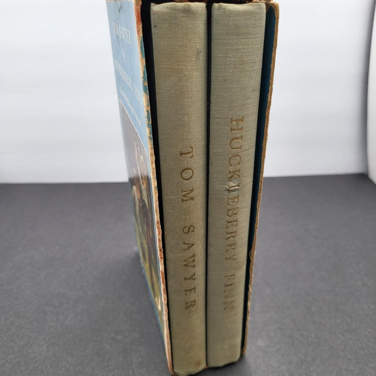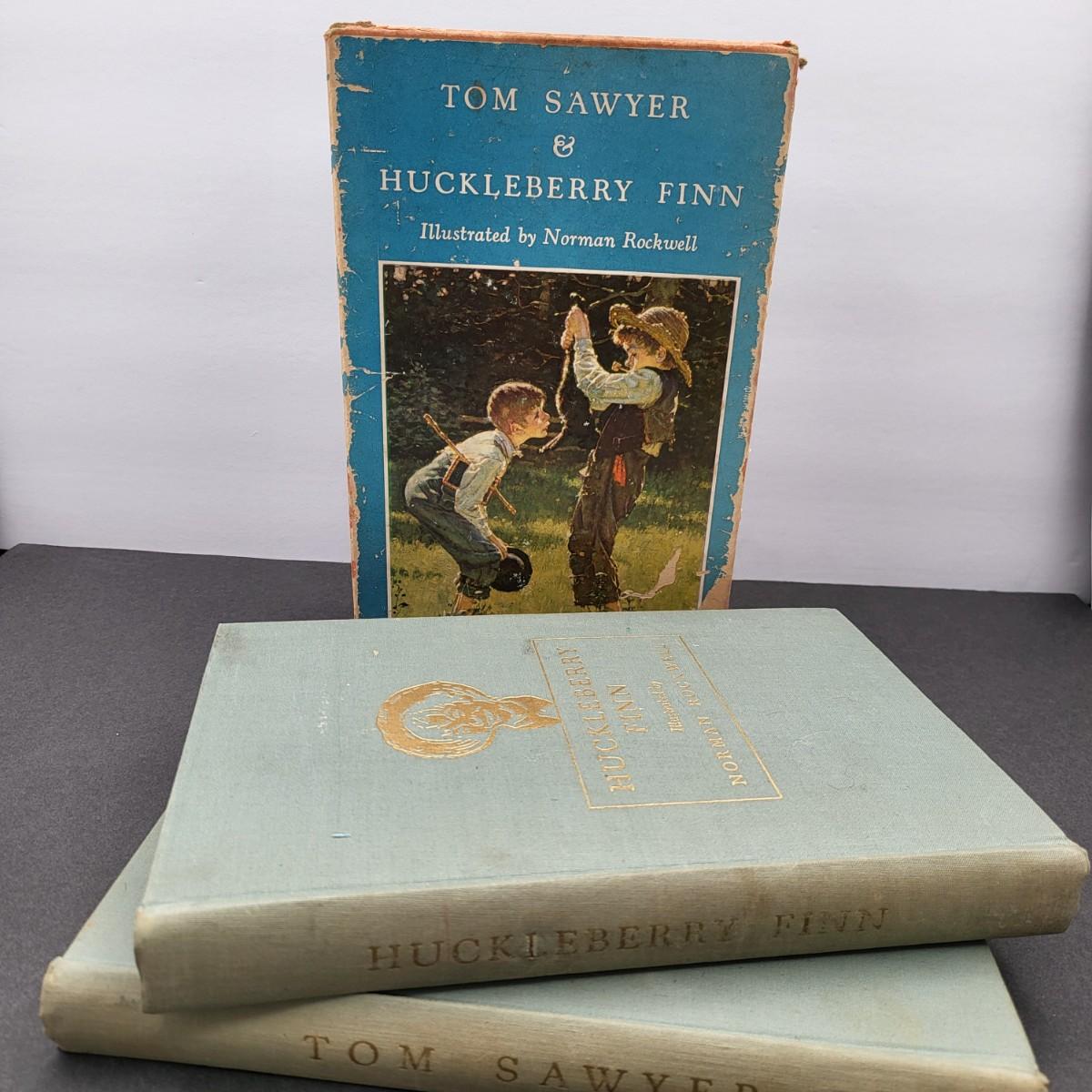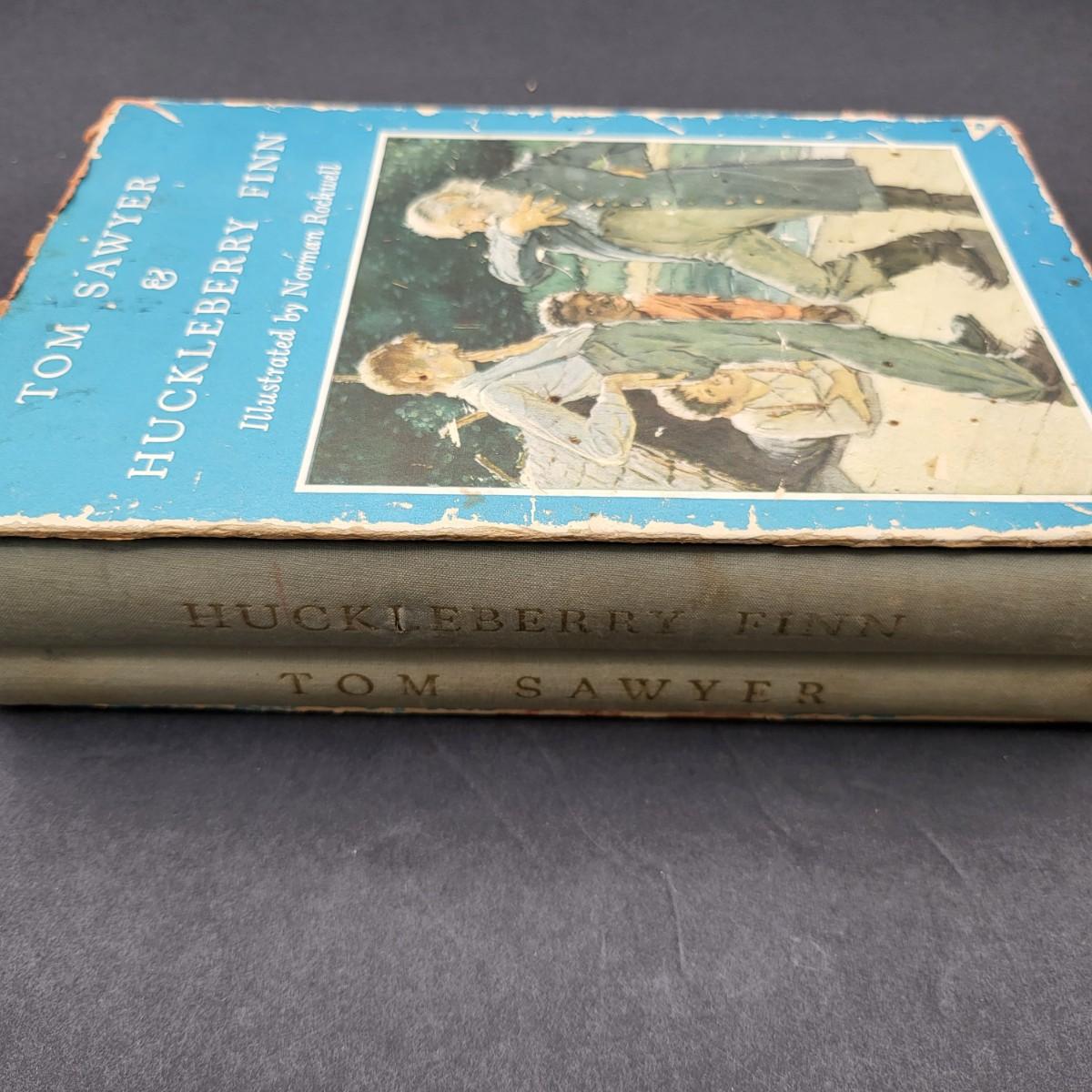 Heritage Press, Tom Sawyer 1939, Huckleberry Finn 1940, Samuel L. Clemens, hardback books. Illustrated by Norman Rockwell. Some inscription pen mark writing and owner sticker inside. Covers and binding are in pretty decent shape, except for the cardboard sleeve they are stored in has flaws.