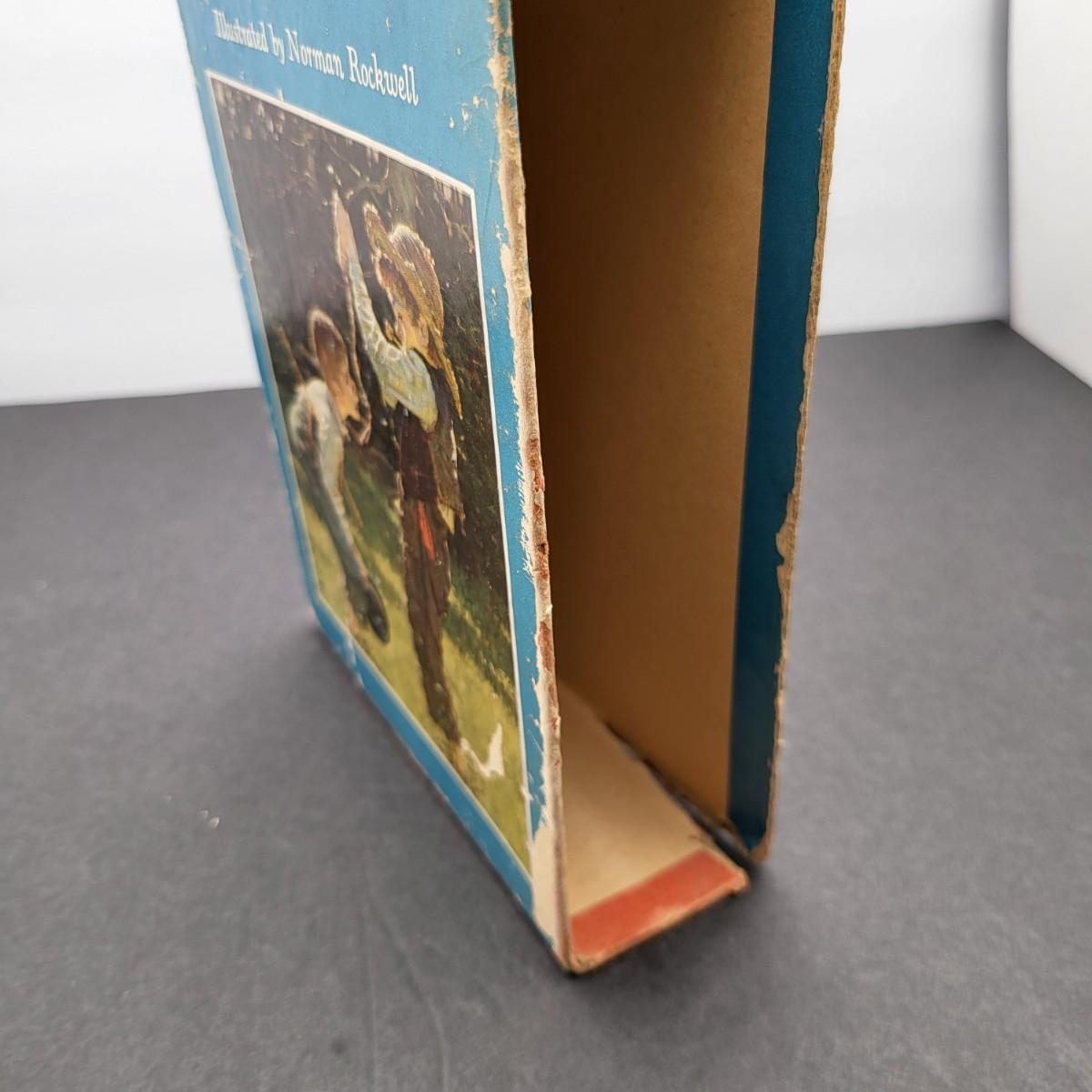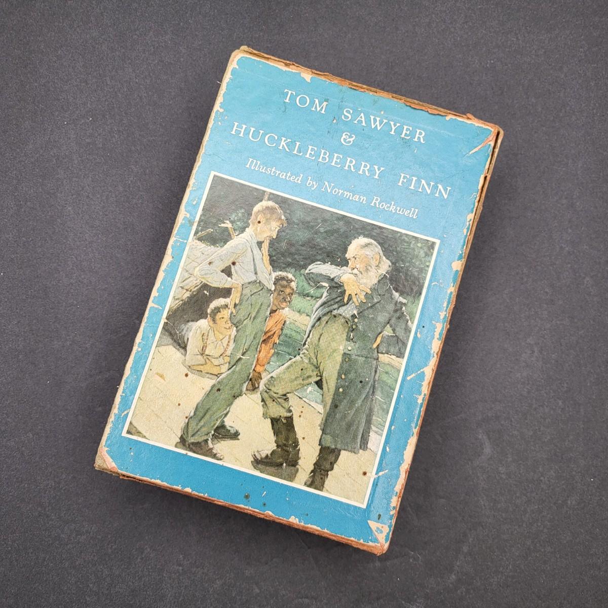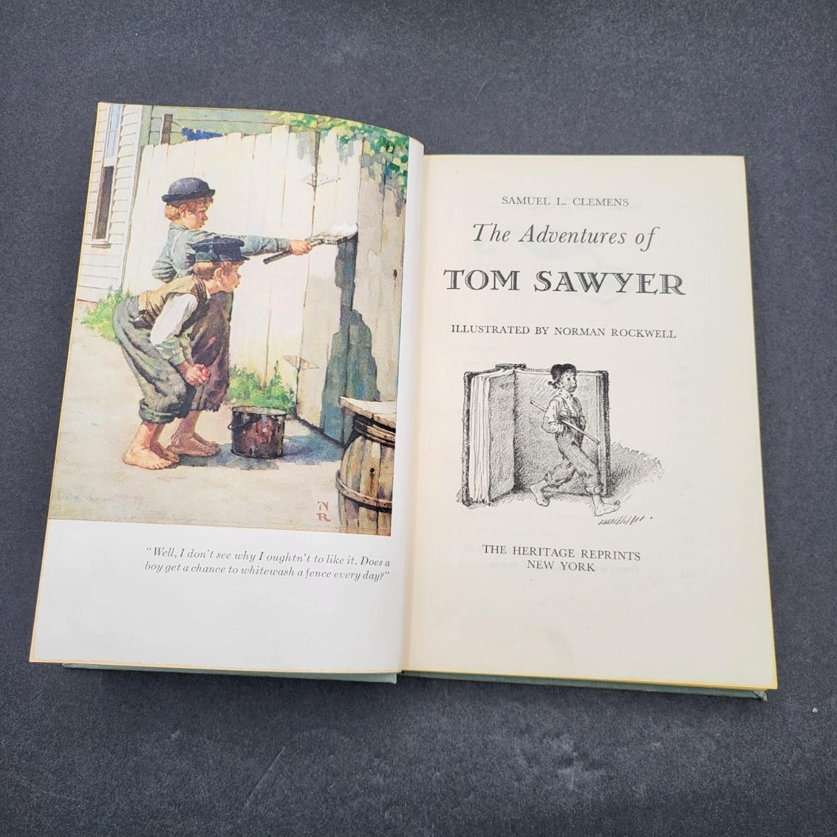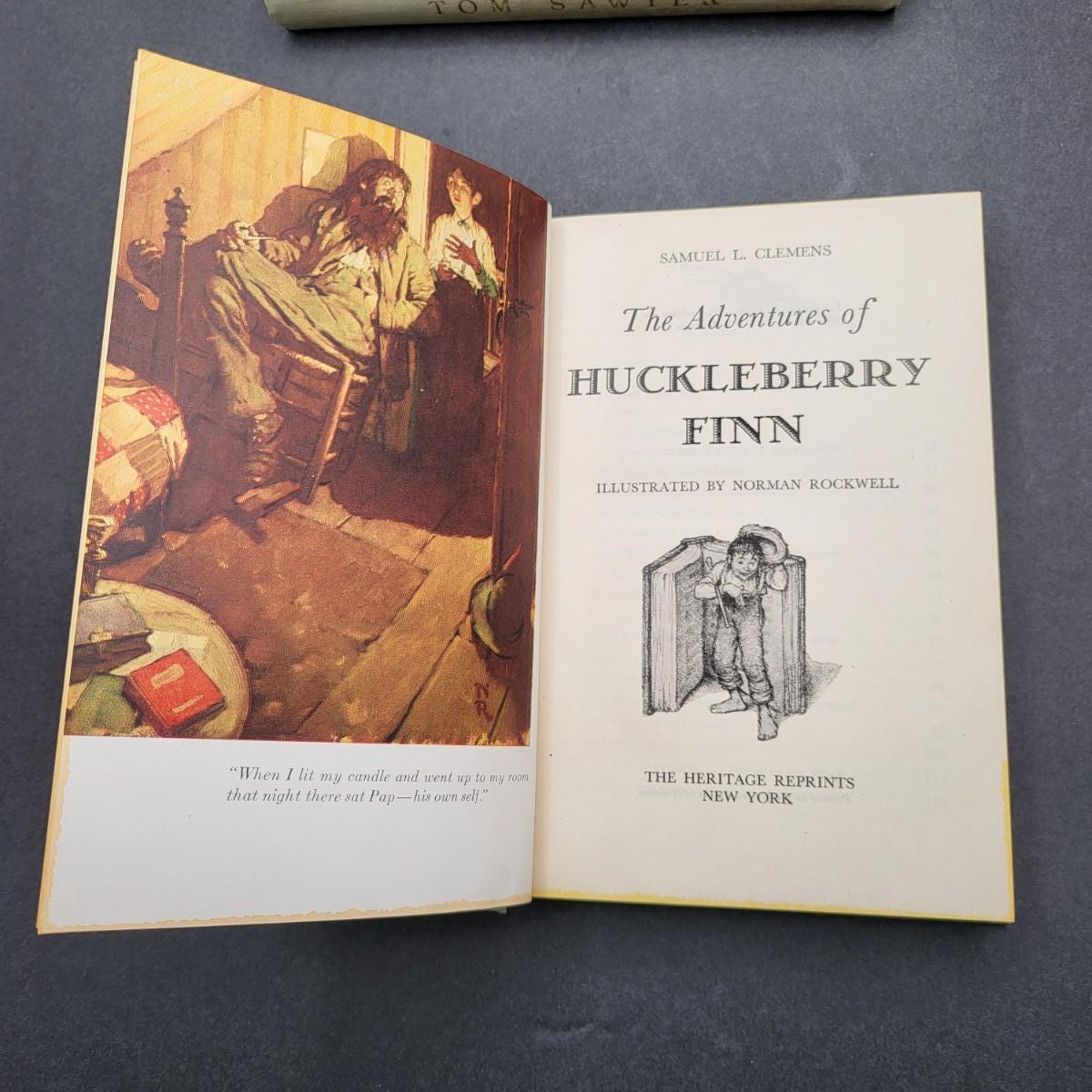 Heritage Press, Tom Sawyer 1939, Huckleberry Finn 1940, Samuel L. Clemens, hardback books. Illustrated by Norman Rockwell. Some inscription pen mark writing and owner sticker inside. Covers and binding are in pretty decent shape, except for the cardboard sleeve they are stored in has flaws.
