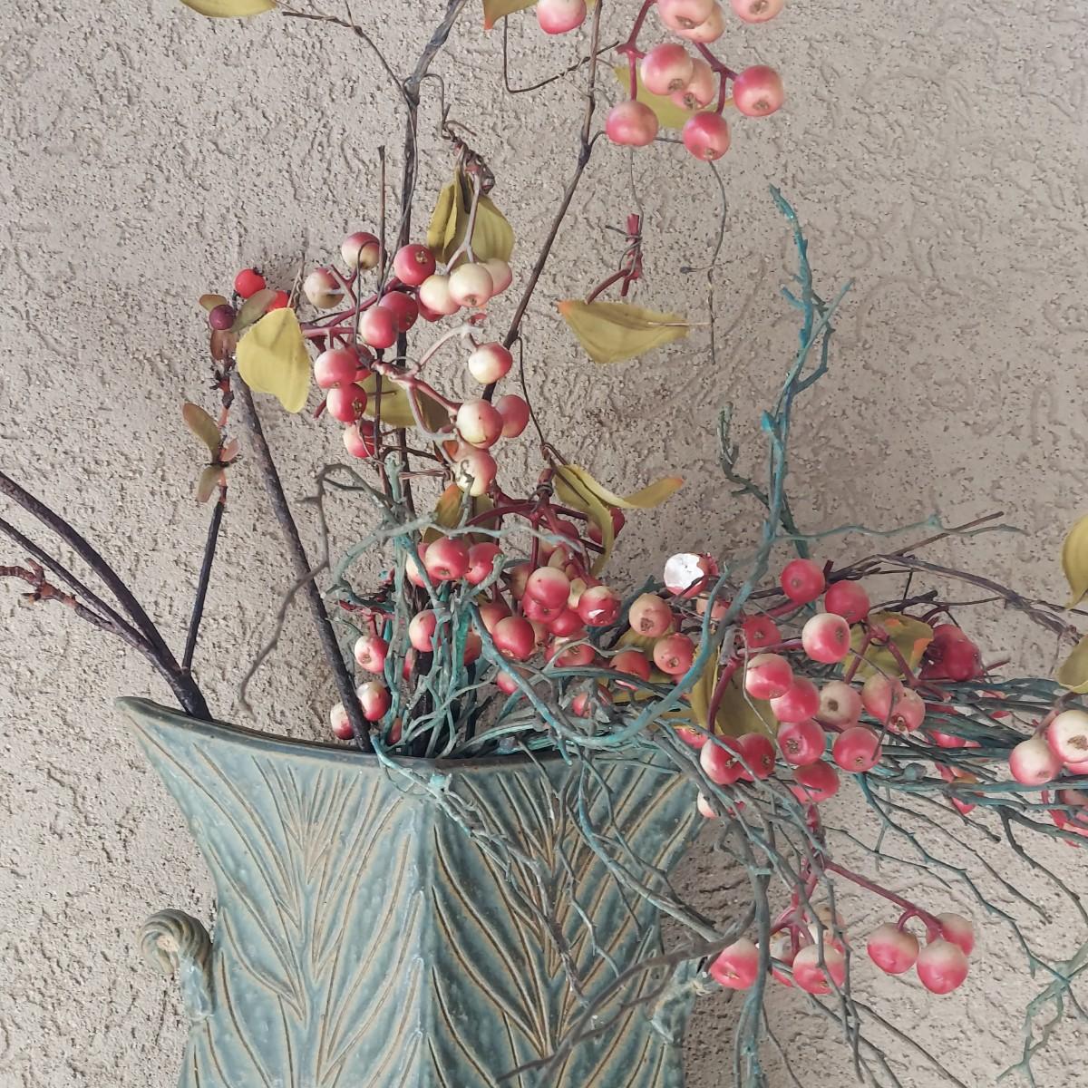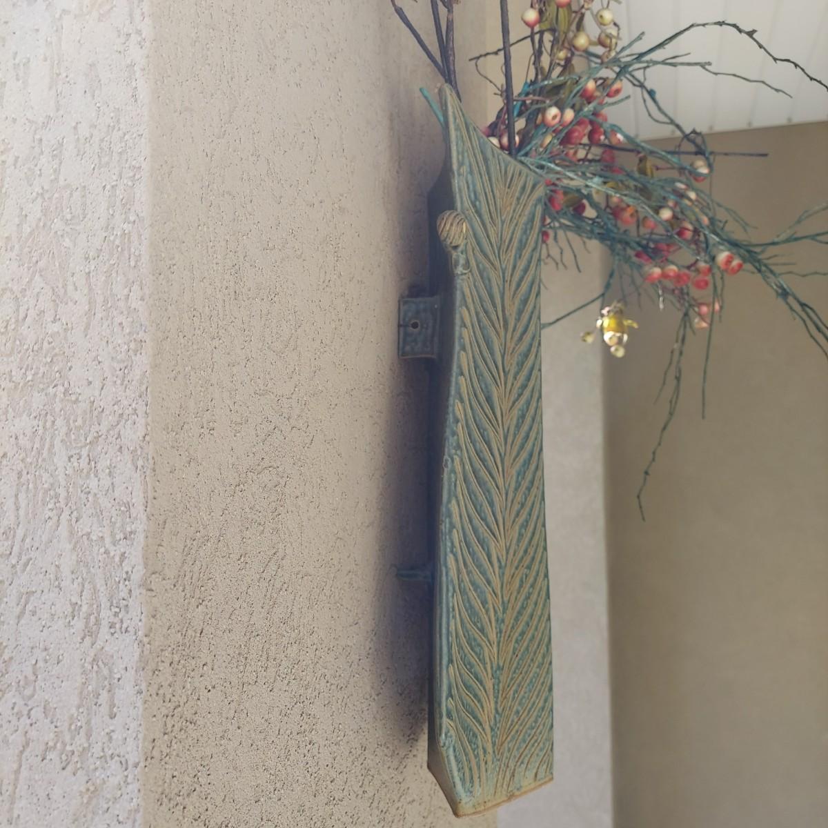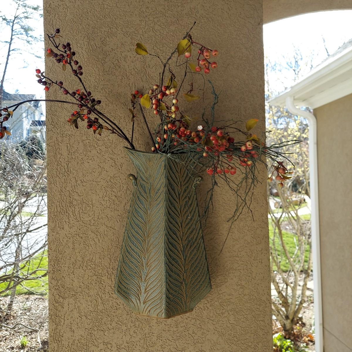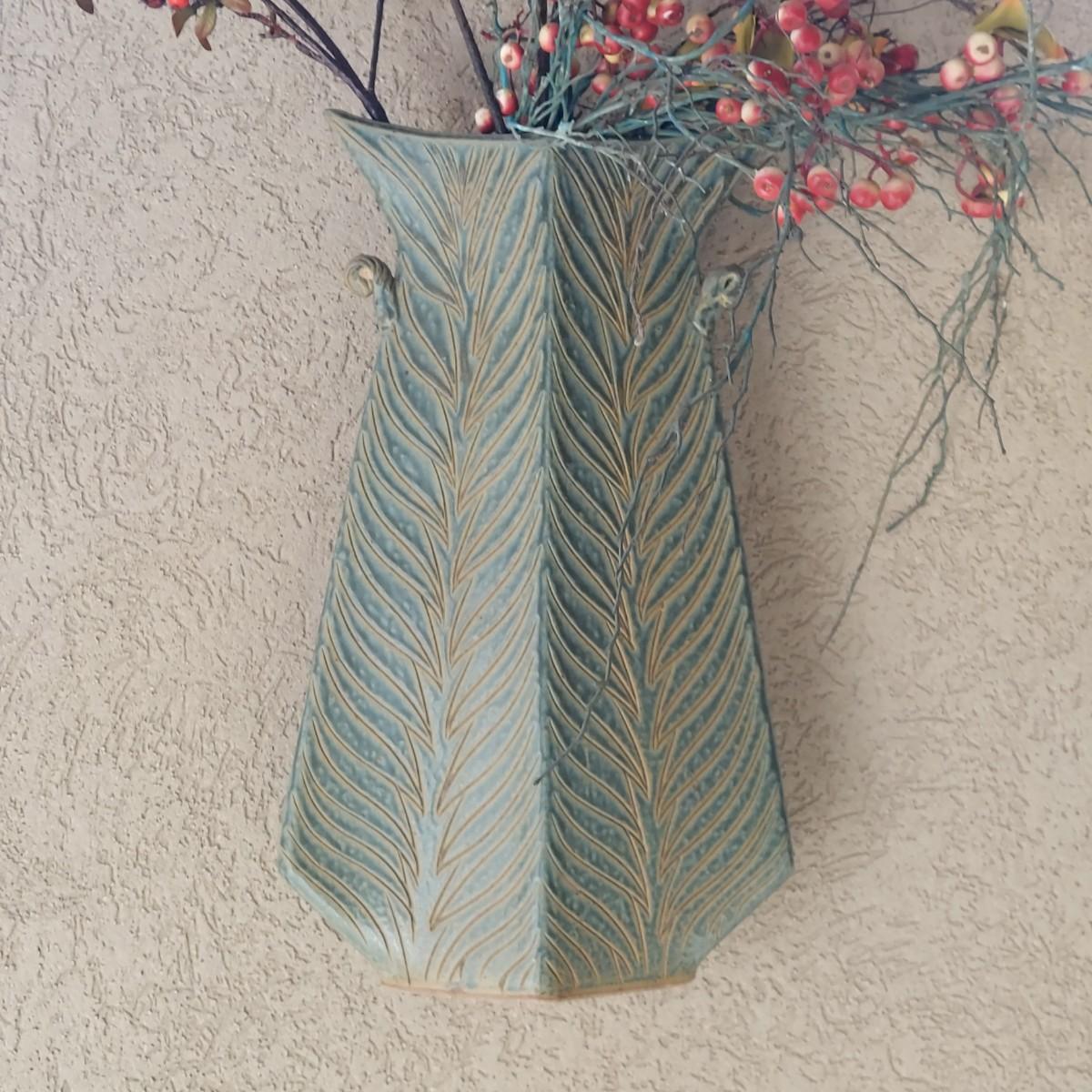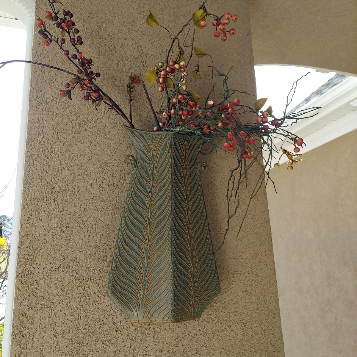 Large wall hanging vase with dried floral arrangement. Vase alone measures 10” x 4” x 18"H. Per the seller, this is a piece by Tom Seelos. Please see photos for details. Shipping available