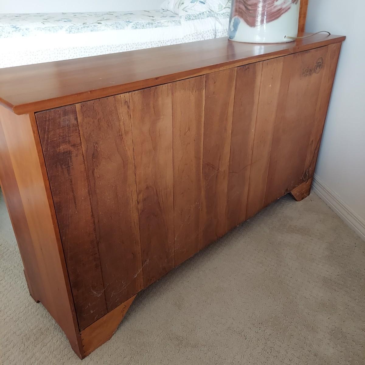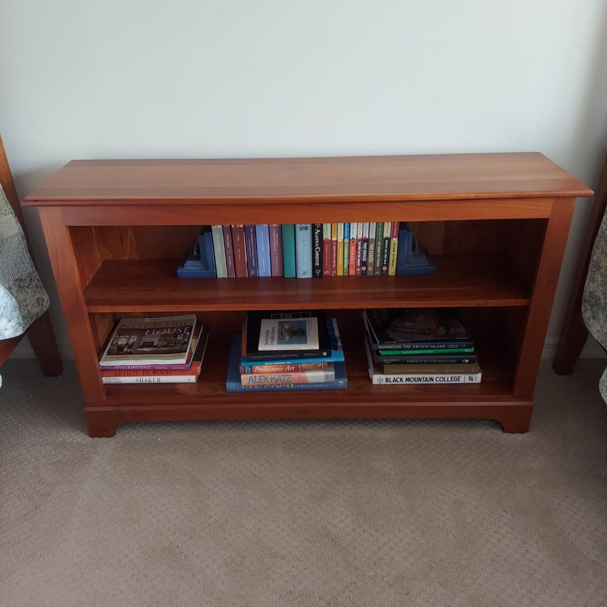 Short solid wood bookshelf. Stamp reads Tom Seely Furniture Antique Reproductions and Classics. Measures 54" x 14" x 30"H. Books sold separately in other lots. Local Pickup Only. Winning bidder must bring assistance to help move and load this item due to its weight and/or size.