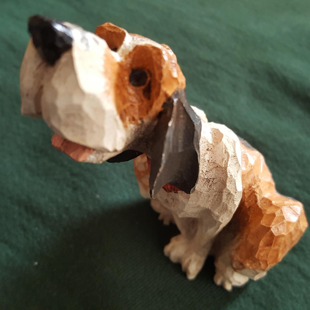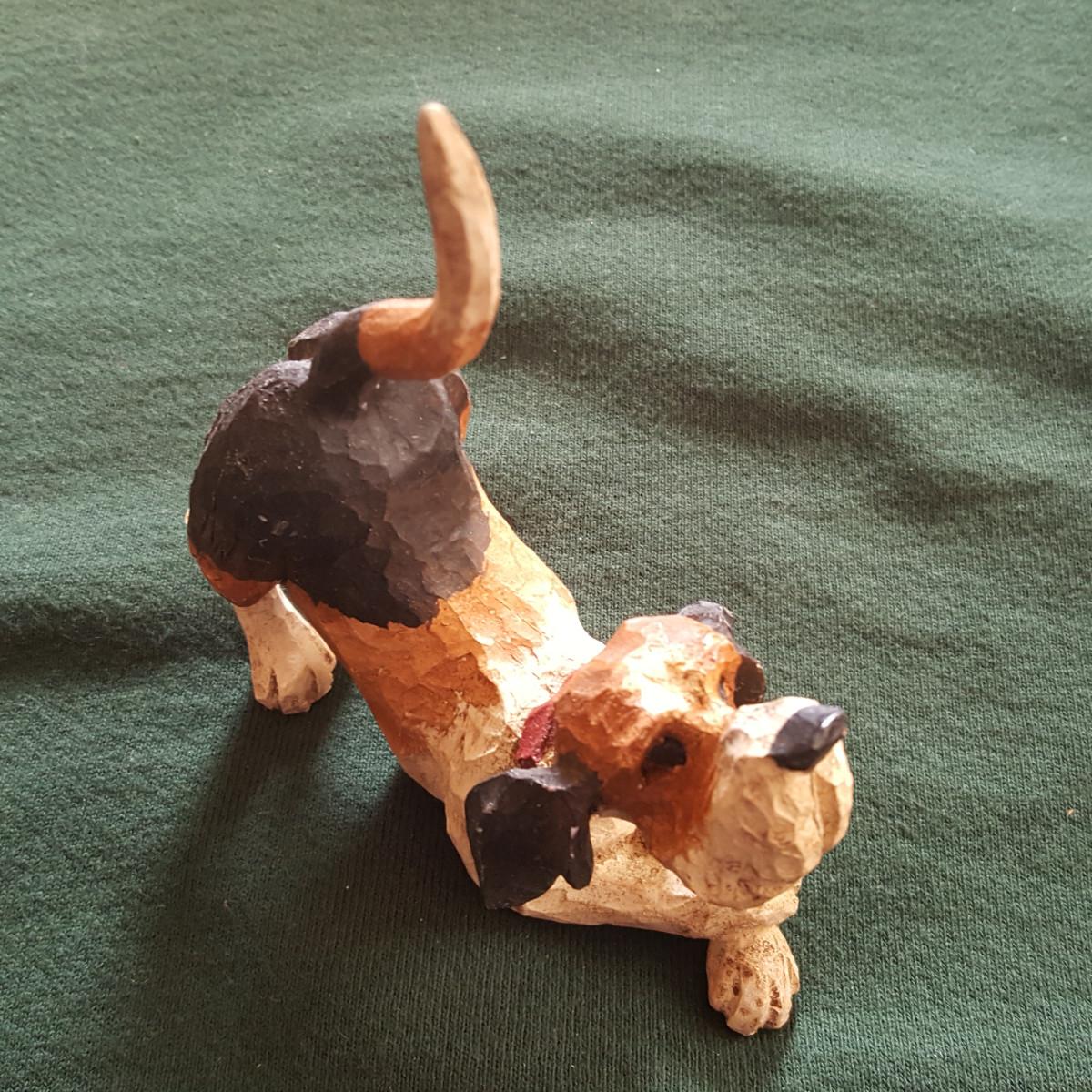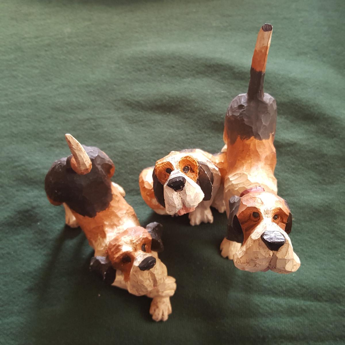 This auction lot is for a pset of Tom Wolfe Carved Dogs. These beautiful dogs are models of those hand-carved by the noted North Carolina artist Tom Wolfe. Mr. Wolfe currently resides in Spruce Pine, NC and teaches classes several times a year at his workshop on Grandfather Mountain, as well as at the John C. Campbell School in Brasstown NC. He has written several books about hand carving - his most recent features dogs much like these. These dog are molded cast resin. The tail up dog measures about 5-inches long, the sitting dog measures about 5-inches tall and the third measure similarly. They appear to be in good shape with no visible cracks or chips. - however, the standing dog has the tip of its tail missing. The dogs are each actually and authentically signed on the bottom by Tom Wolfe.