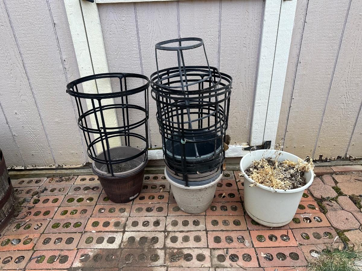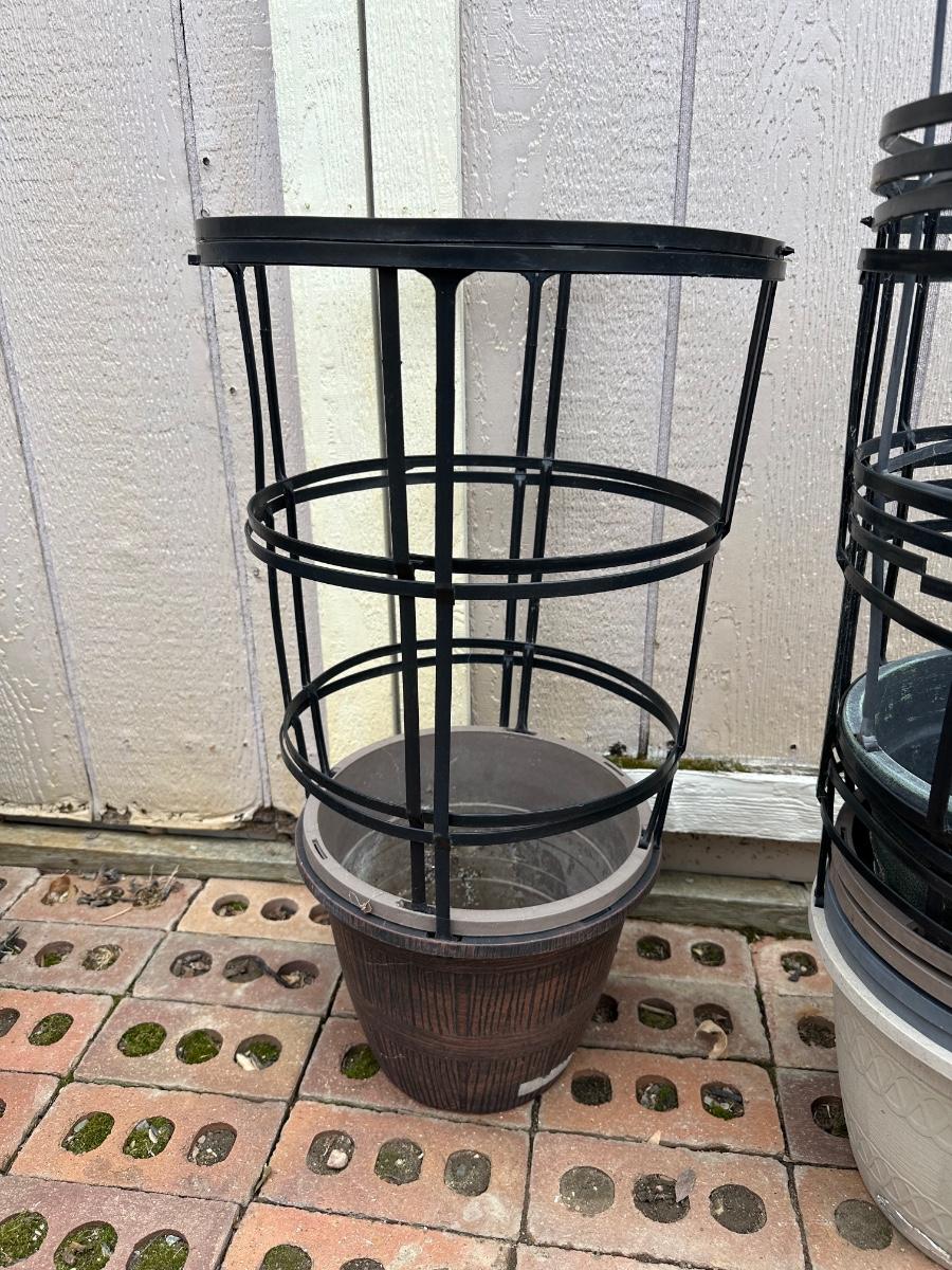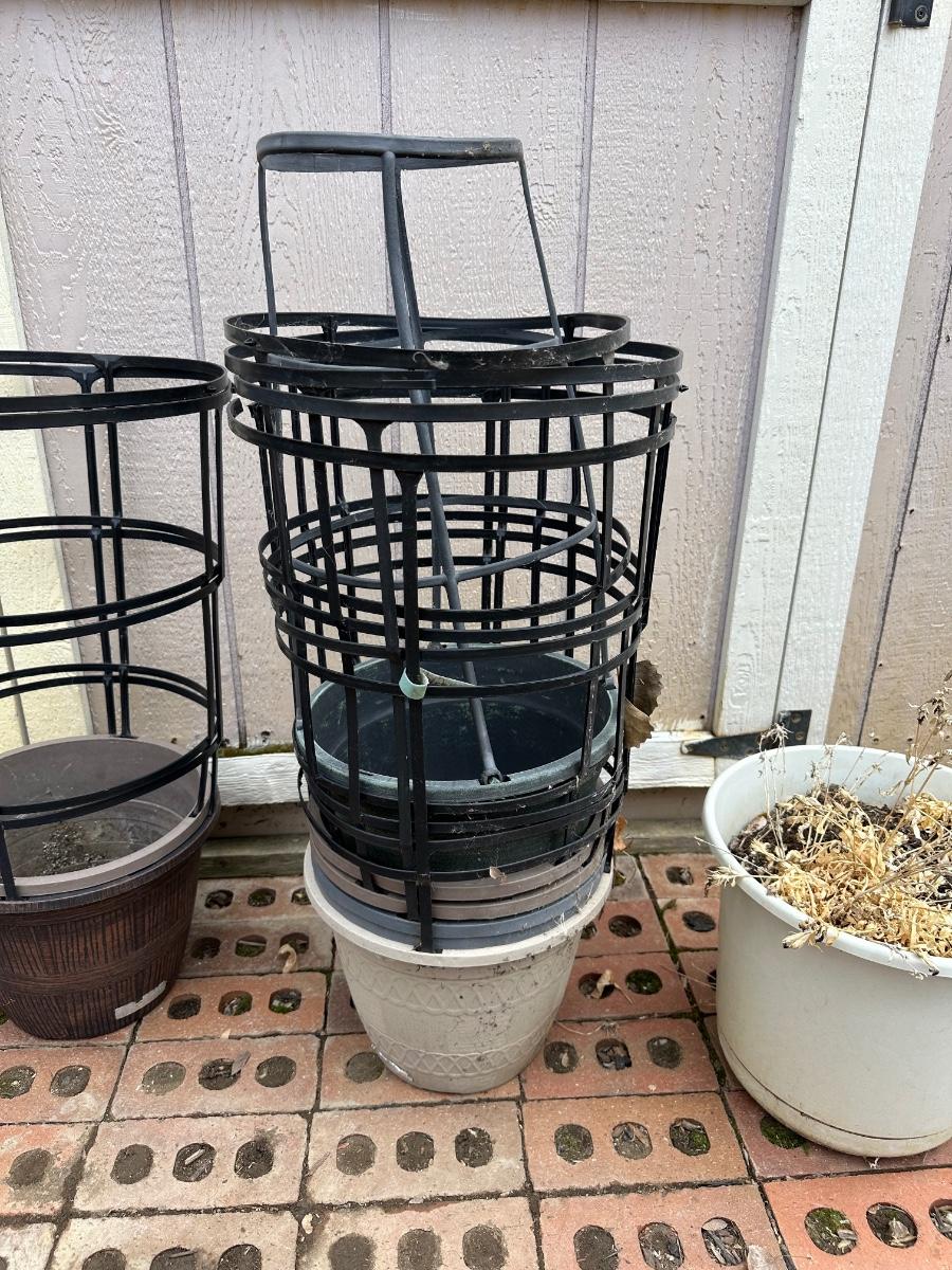 TOMATO CAGE LIKE POTS AND 2 WALL HUNG FLOWER POTS