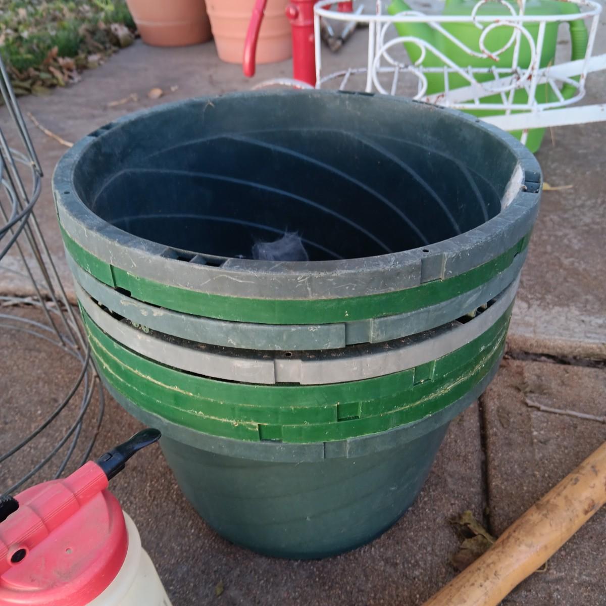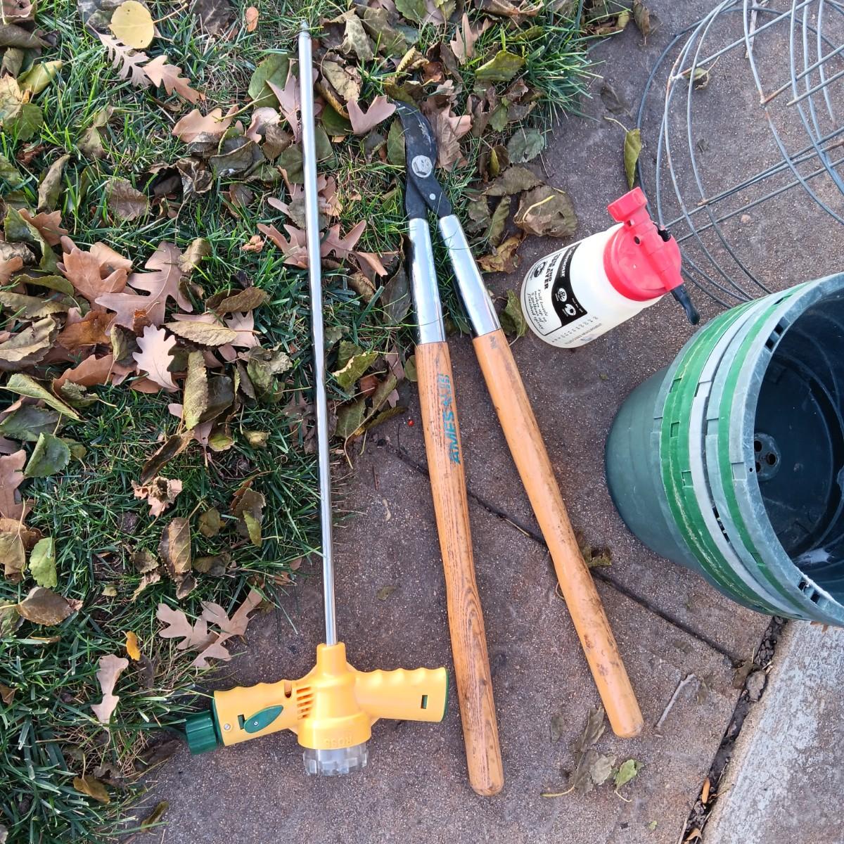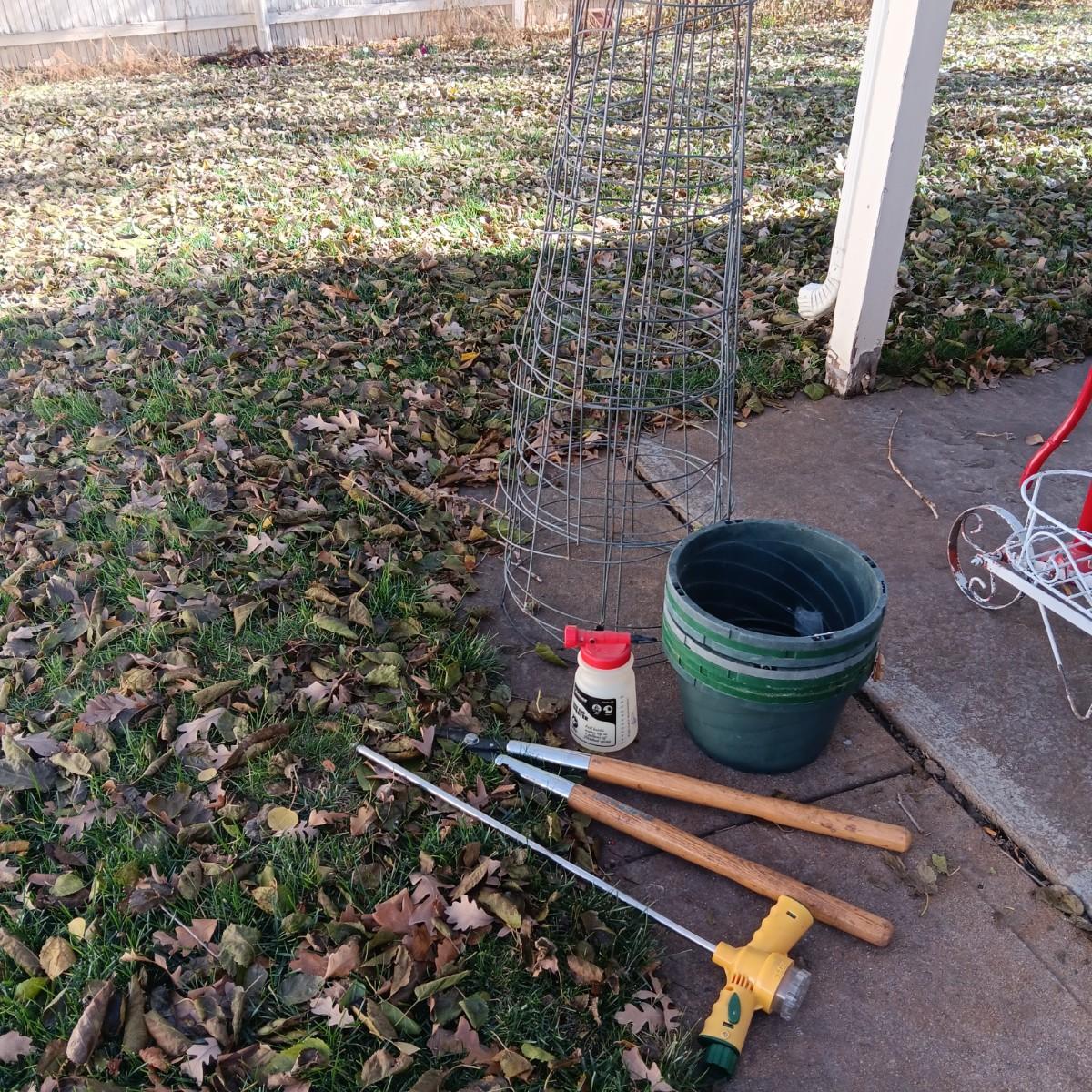 TOMATO CAGES, LOPPERS, ROOT FEEDER, SPRAYER AND FLOWER POTS