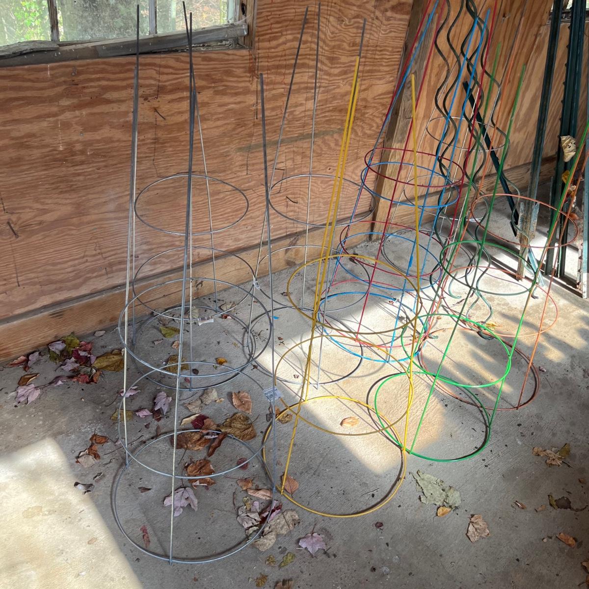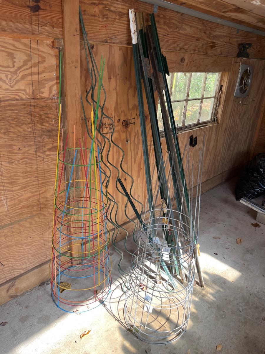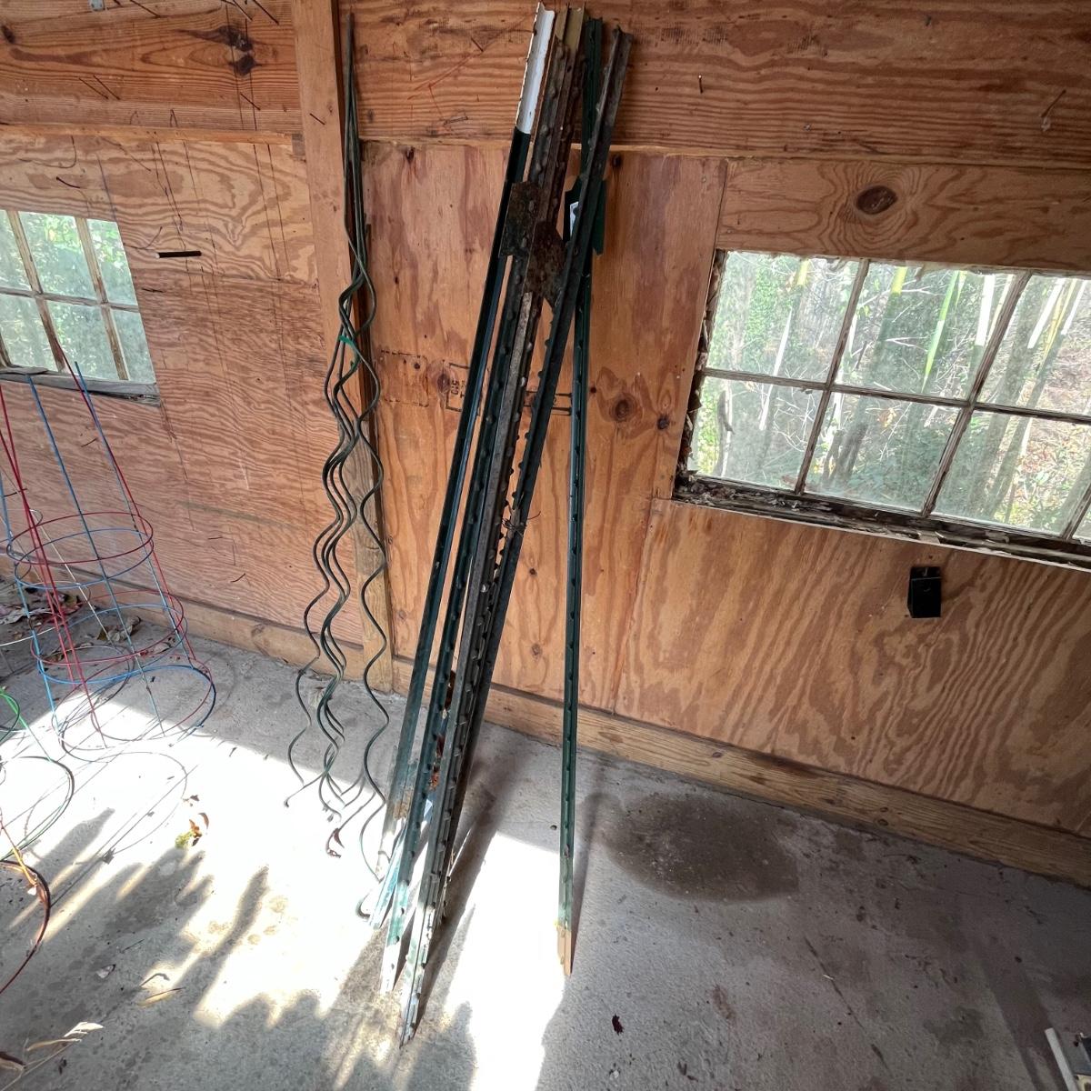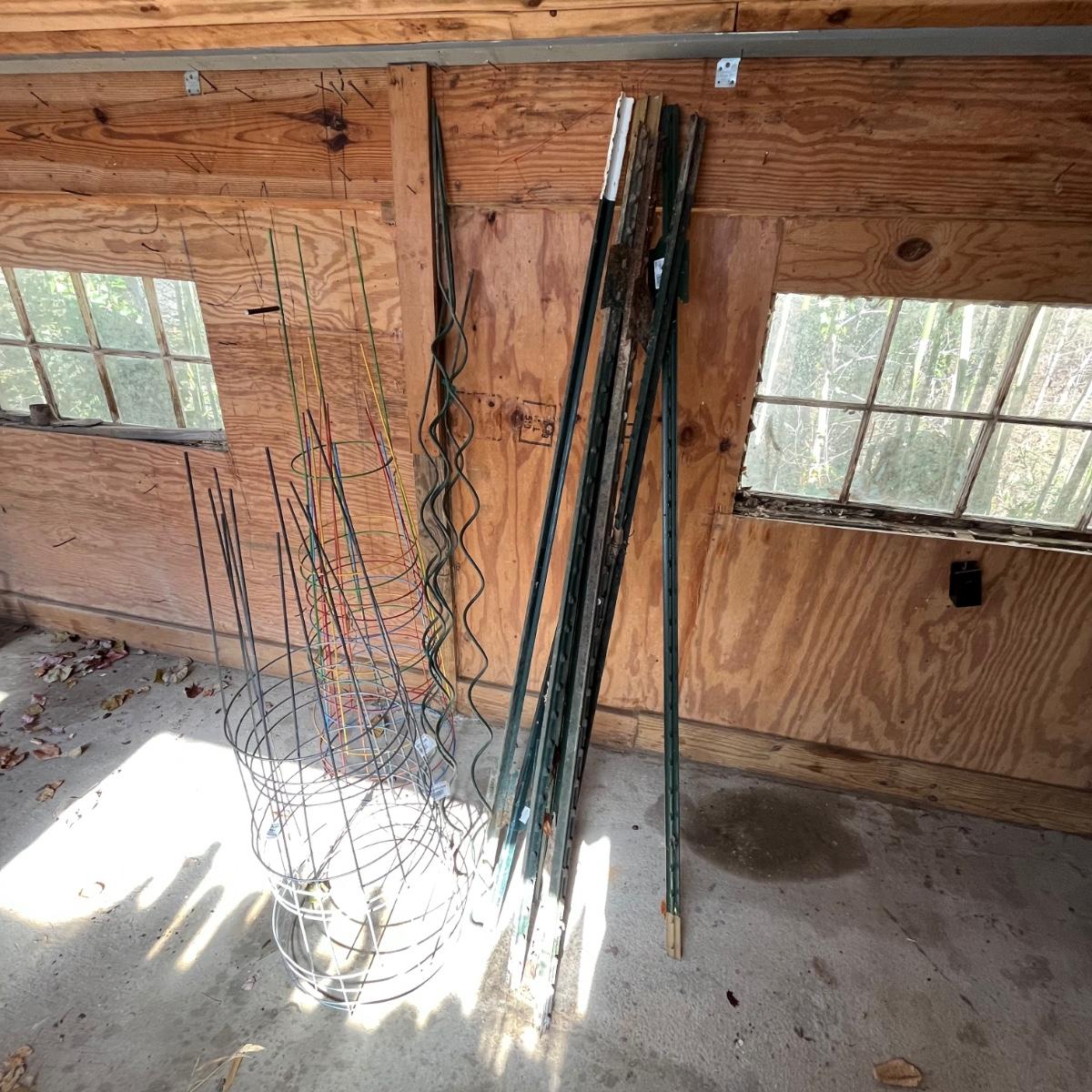 Lot includes eight metal tomato cages that measure 42” tall, seven T posts that measure 72” tall, and five metal stakes with plastic coating.