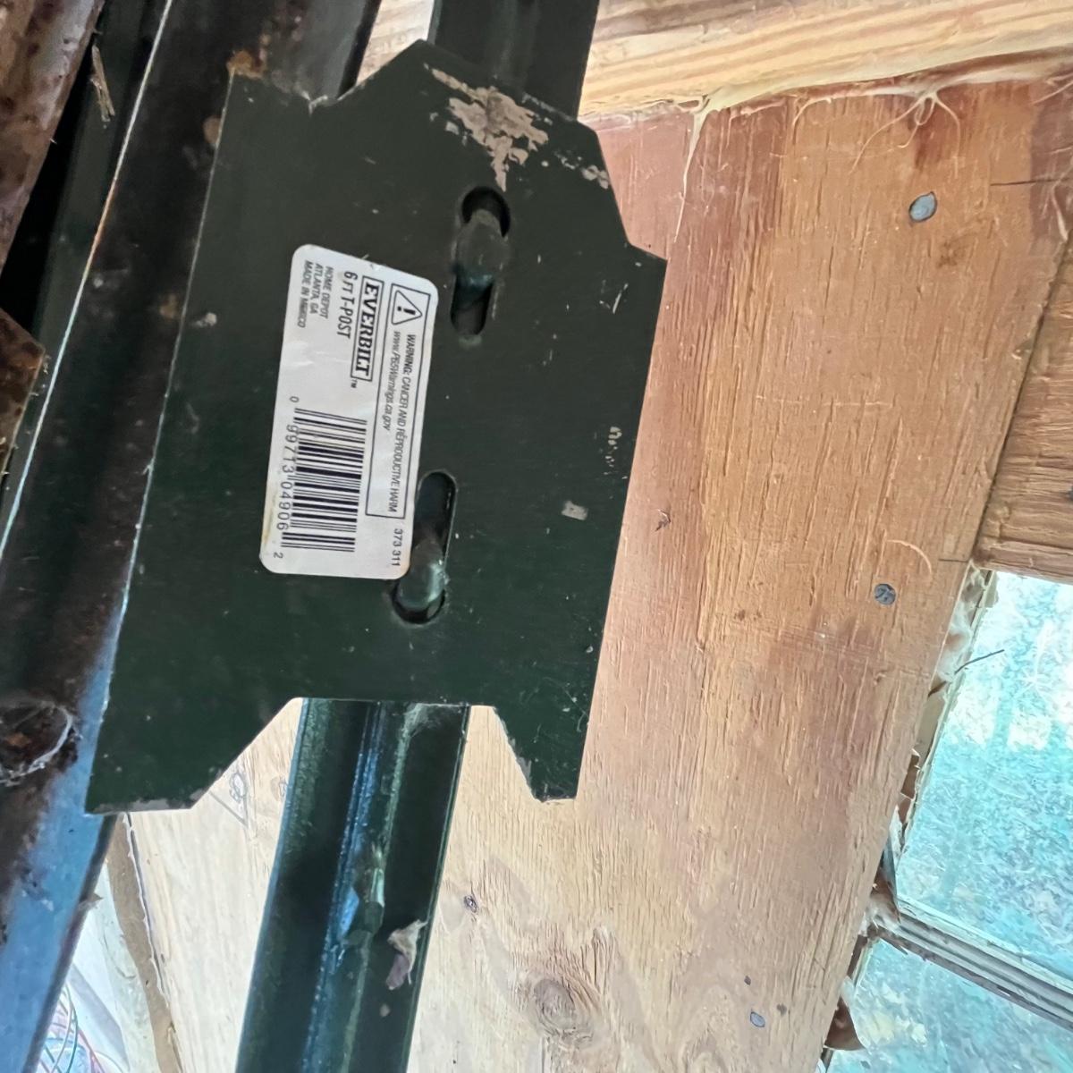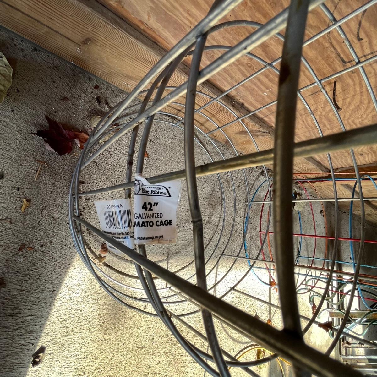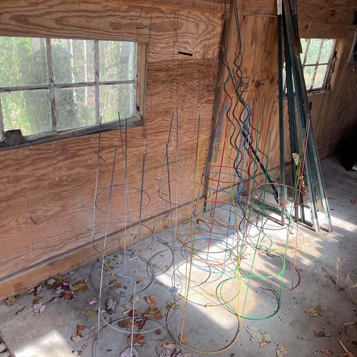 Lot includes eight metal tomato cages that measure 42” tall, seven T posts that measure 72” tall, and five metal stakes with plastic coating.